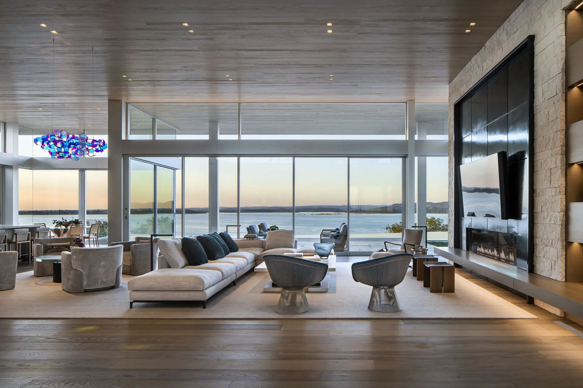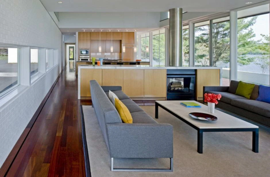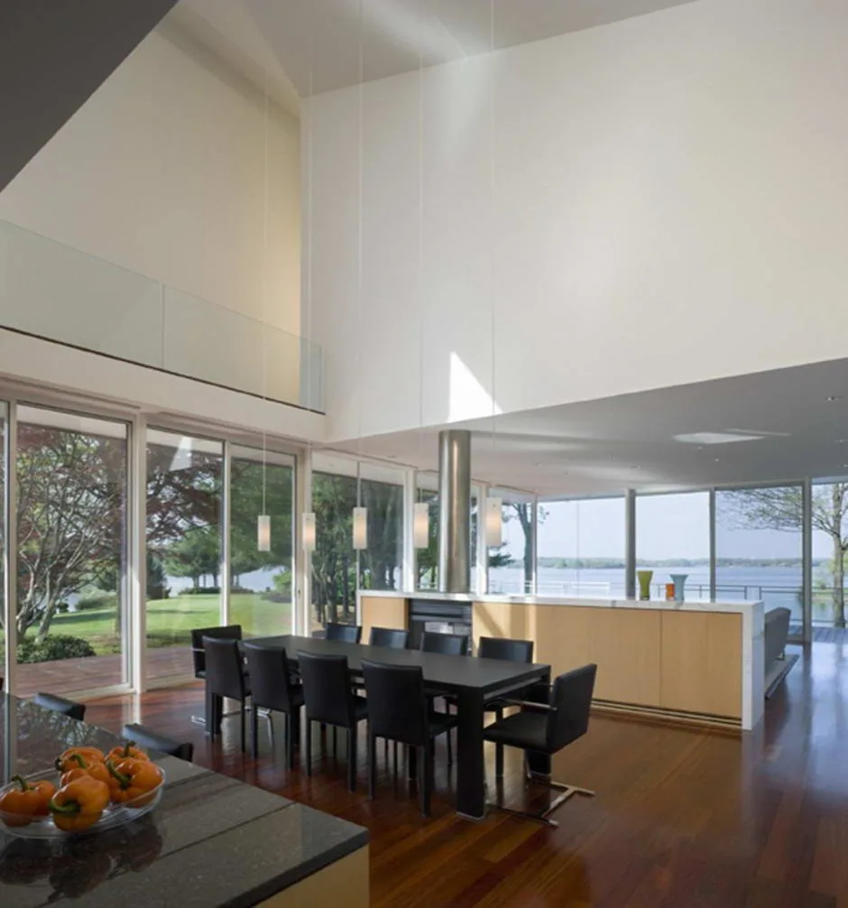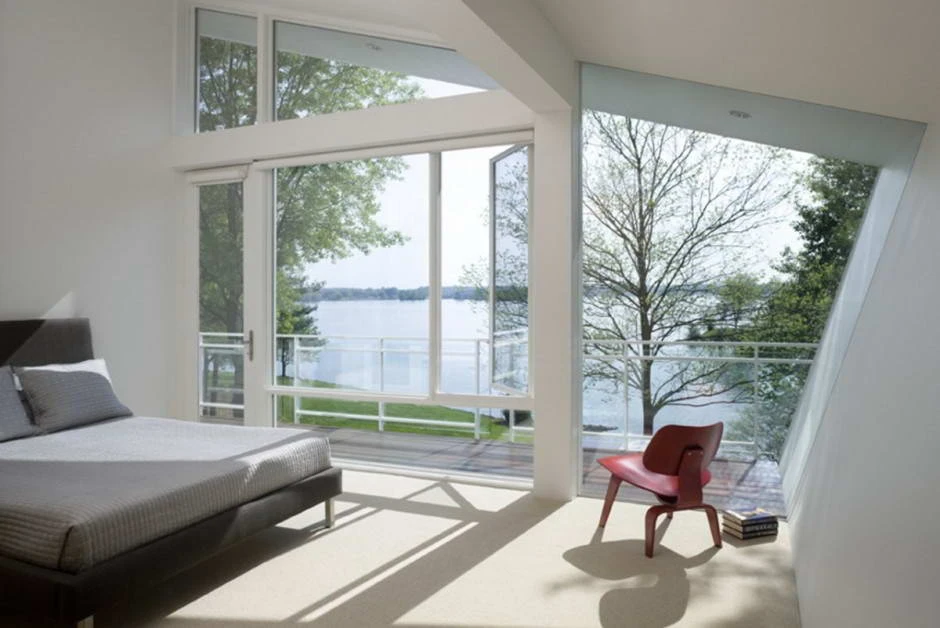 У дома светлое и развитое внутреннее пространство и линейная планировка, позволяющая обеспечить хороший вид из всех помещений, в нём две зоны для отдыха и общения (на цокольном и первом этажах), три спальни, в том числе две, выходящие непосредственно к озеру, кабинет и хозяйственная пристройка с гаражом.
