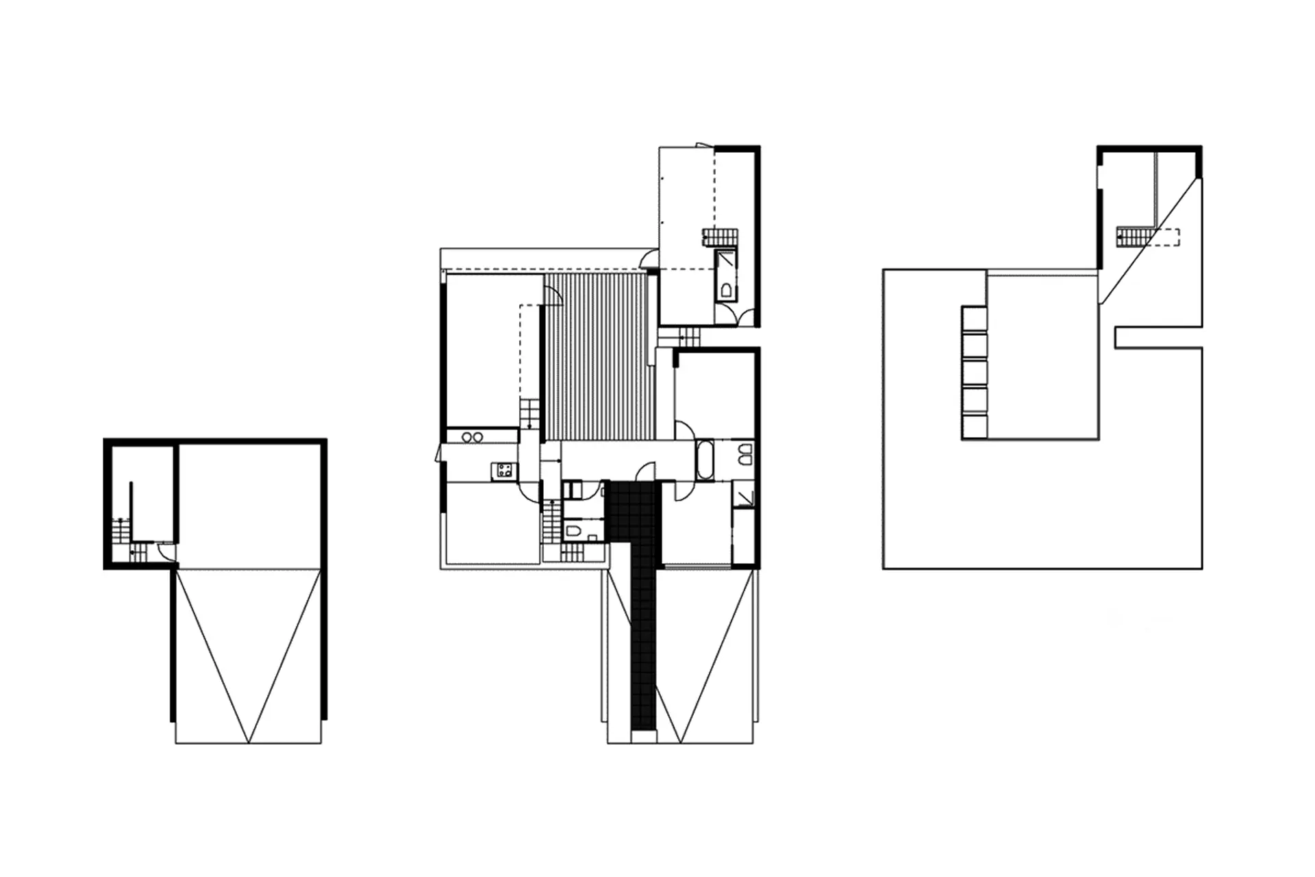 План этажа отличается от традиционного плана первого этажа полутораэтажного дома: здание открыто с обеих сторон и имеет выход на верхний этаж. В дом проникают лучи света, а окна создают рамки для окружающей природы. Одной из общих целей проектирования было создание «призматического» формального выражения, взаимодействия между объемами, которые остаются платоническими, без лишних элементов или деталей, уменьшающих масштаб.