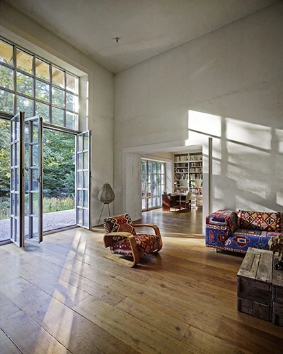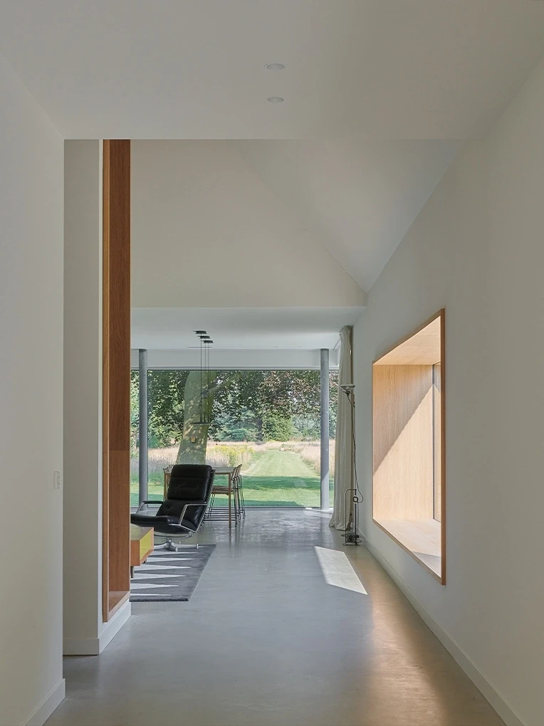 Гостиная на 1 1/2 этажа является пространственным центром дома, вокруг которого формируются все остальные помещения, включая центральное ядро с камином и лестницей. Дом задуман как пространственный континуум, допускающий самые разные пространственные решения.
