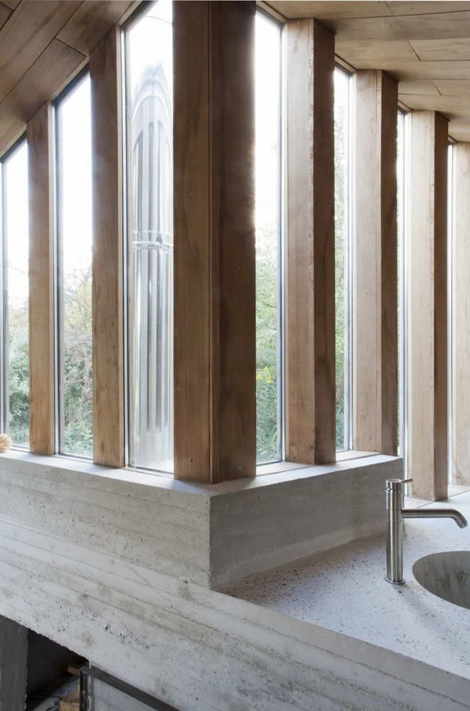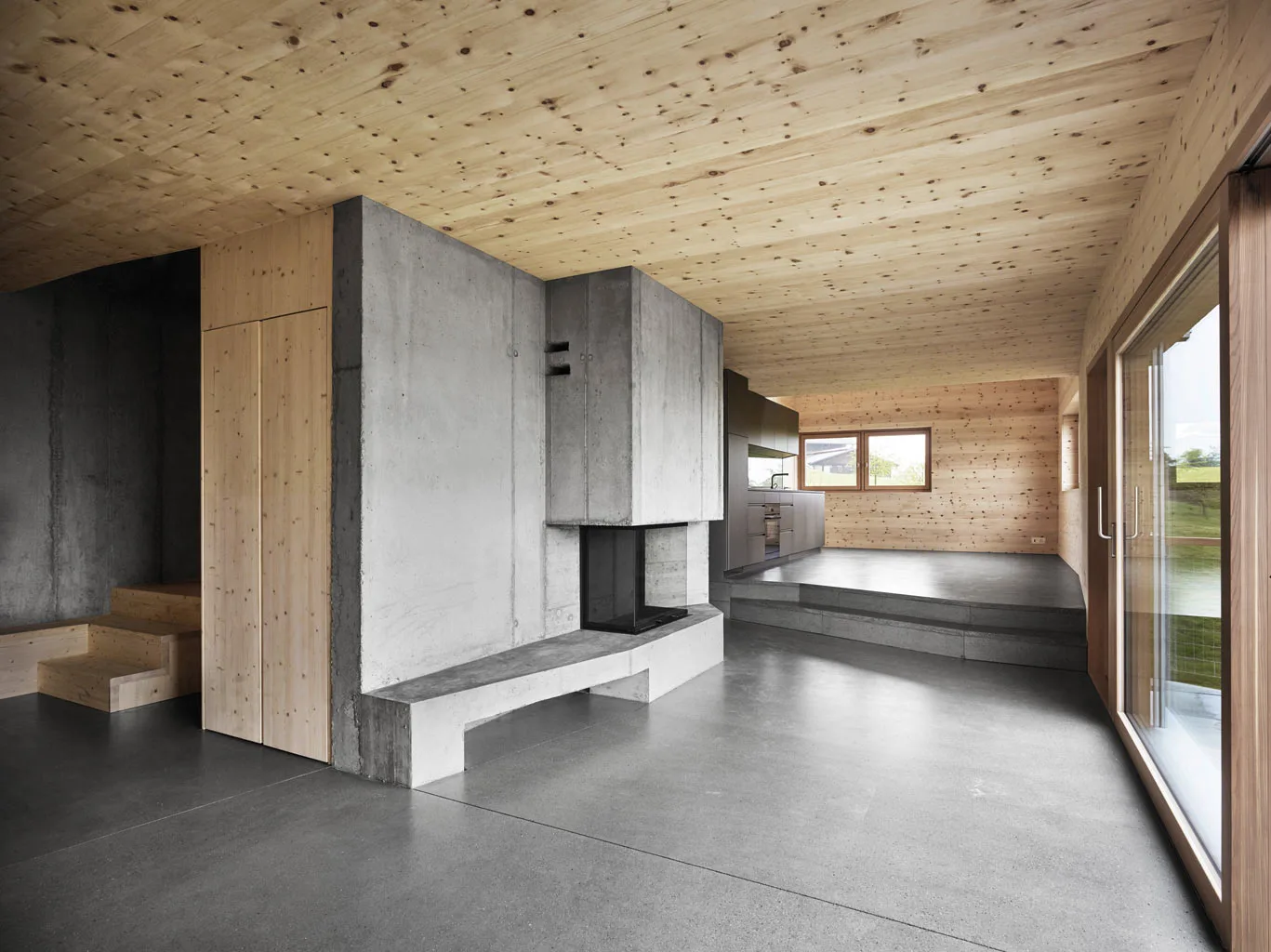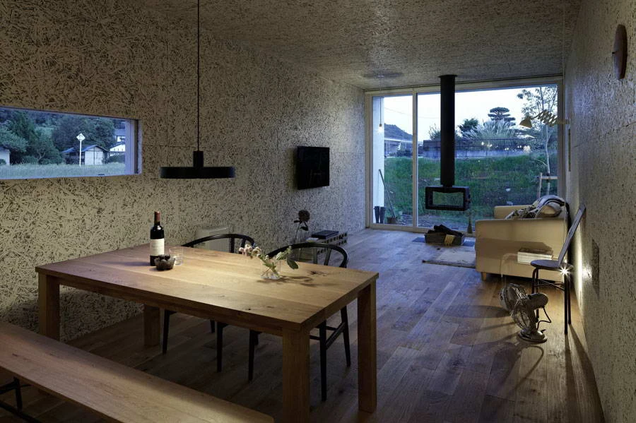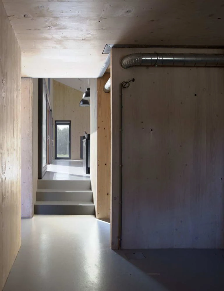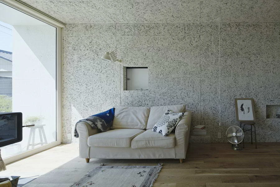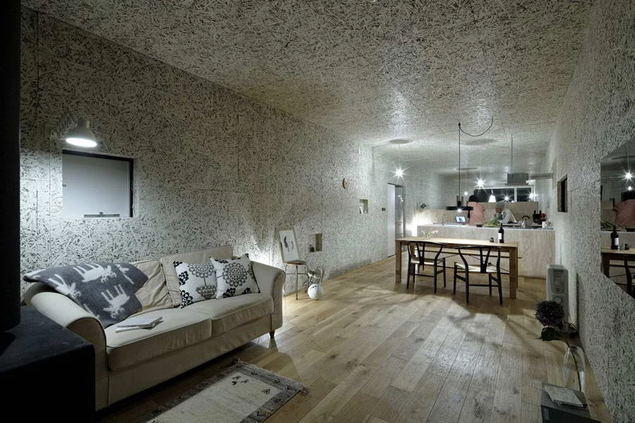 Снаружи дом отделан цементными крупноразмерными панелями, имеющими мягкую текстильную текстуру. В интерьере частично оставлен открытый бетон, частично стены и потолок закрыты декоративной фанерой.