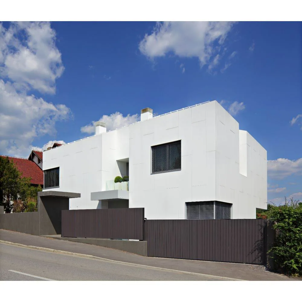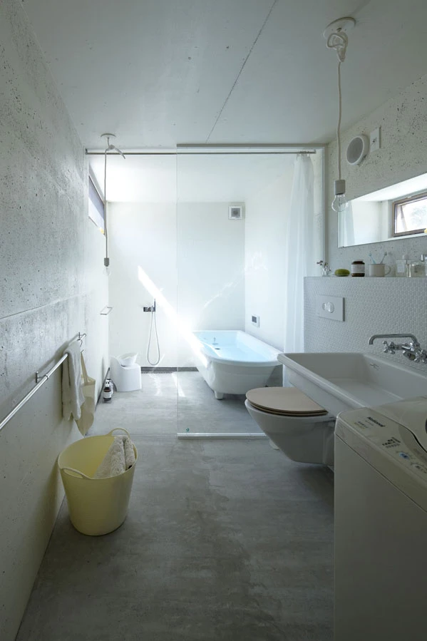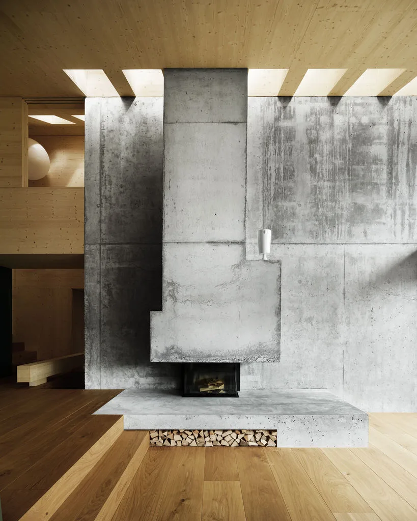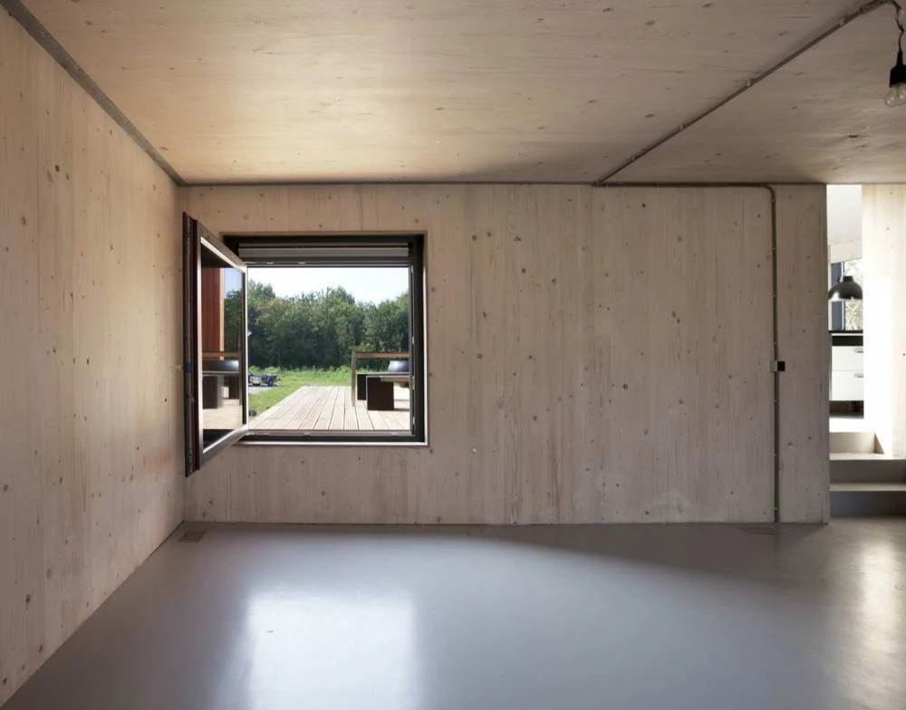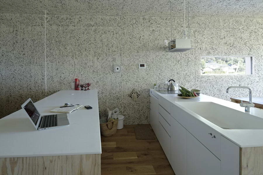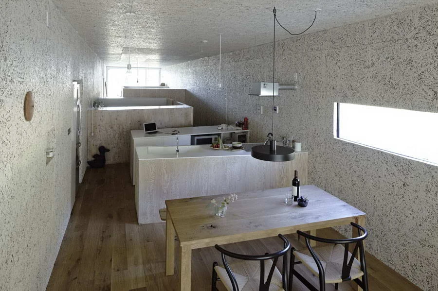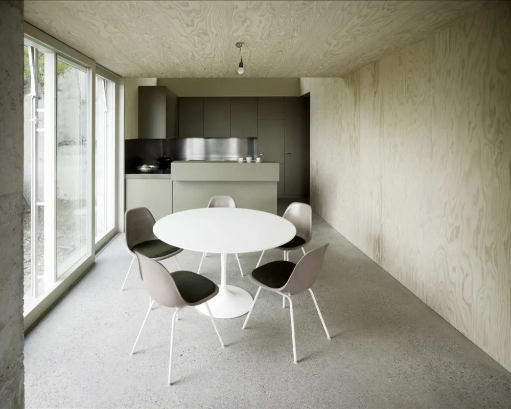 Снаружи дом отделан цементными крупноразмерными панелями, имеющими мягкую текстильную текстуру. В интерьере частично оставлен открытый бетон, частично стены и потолок закрыты декоративной фанерой.