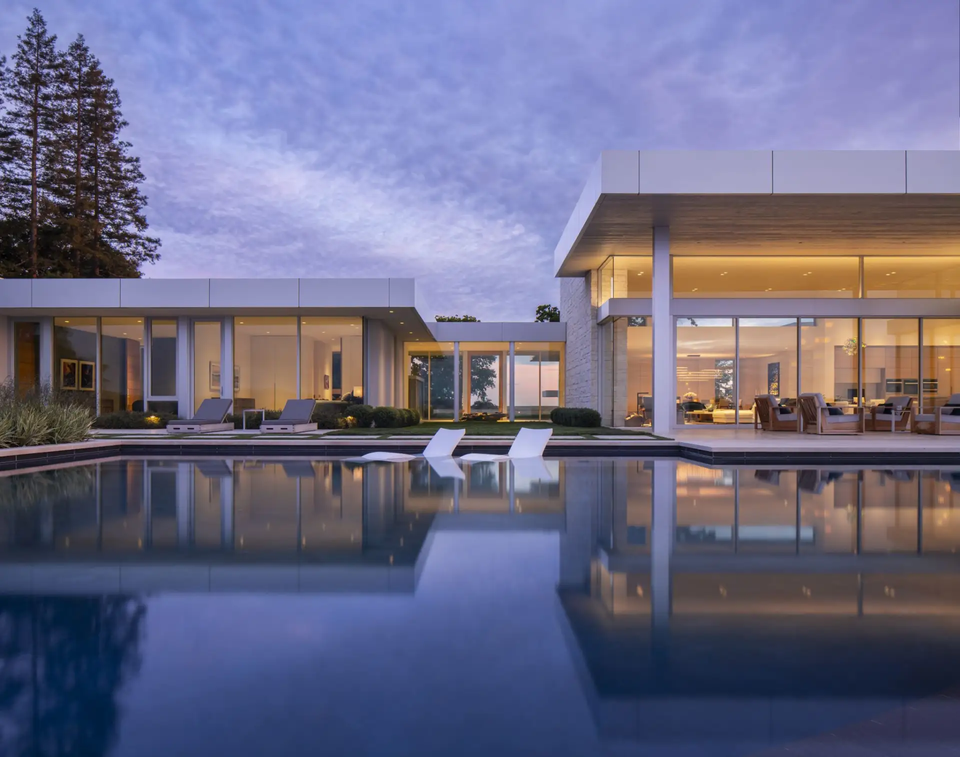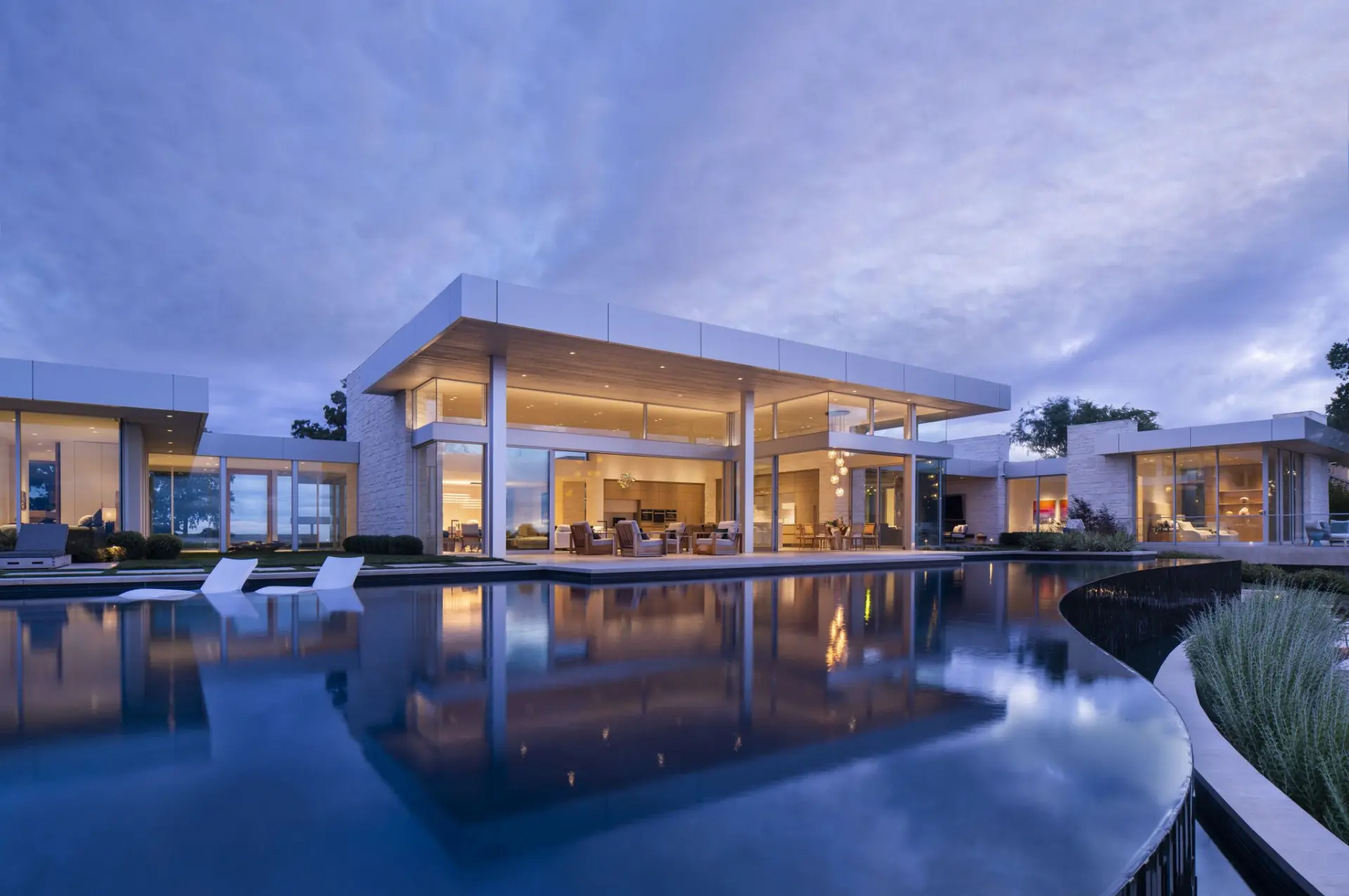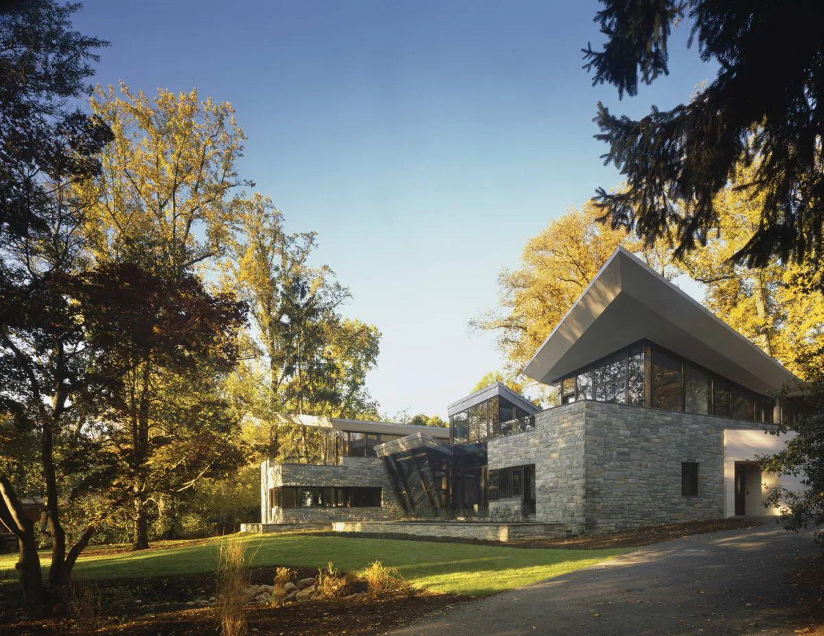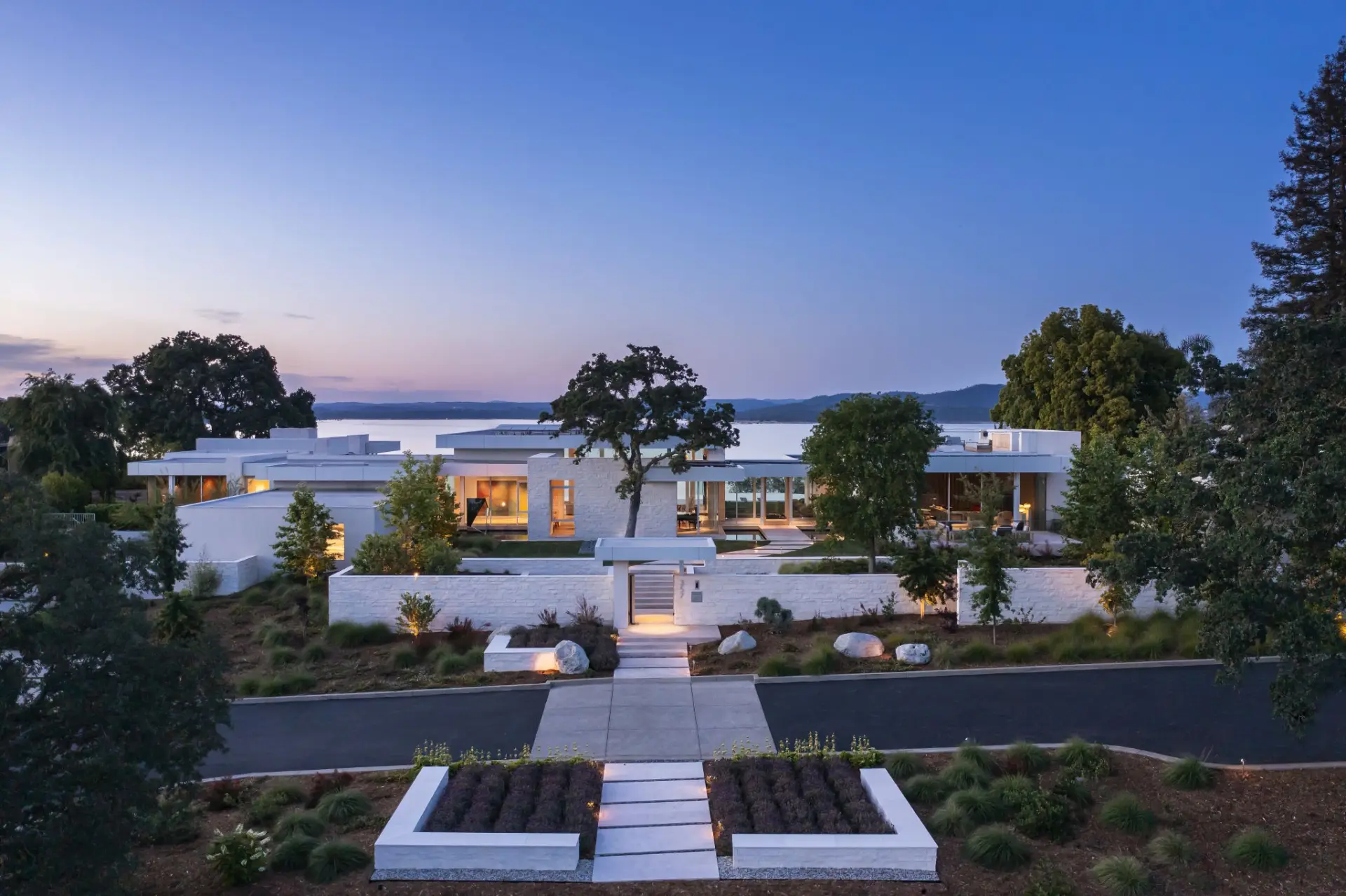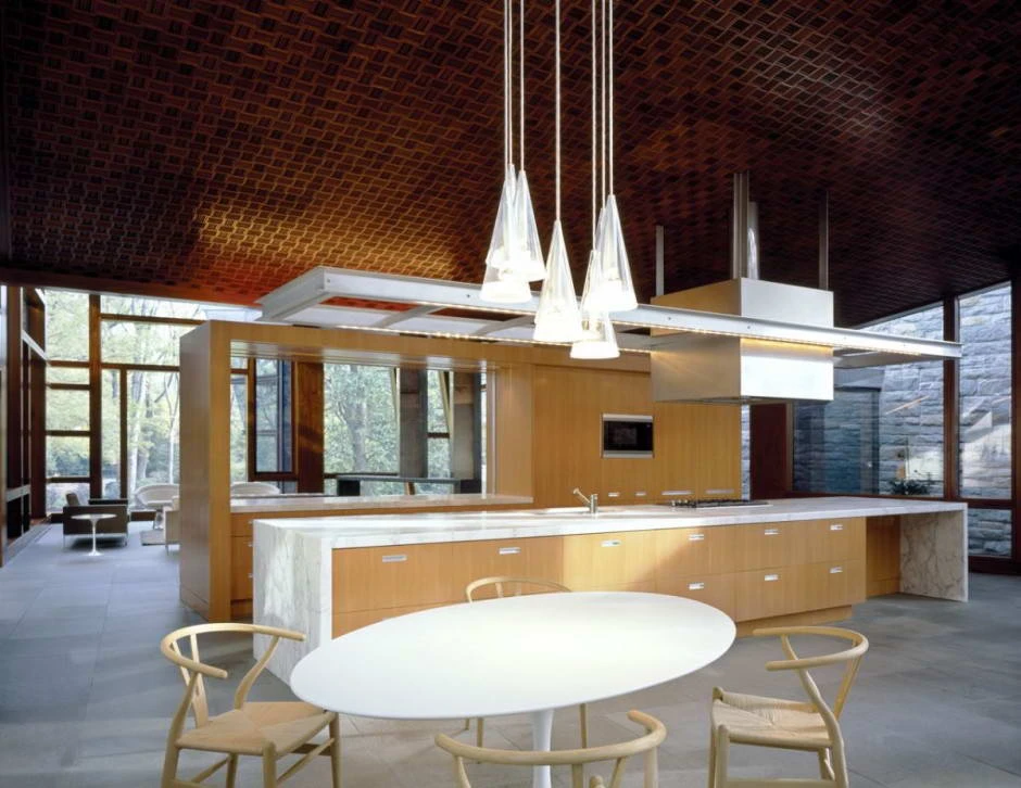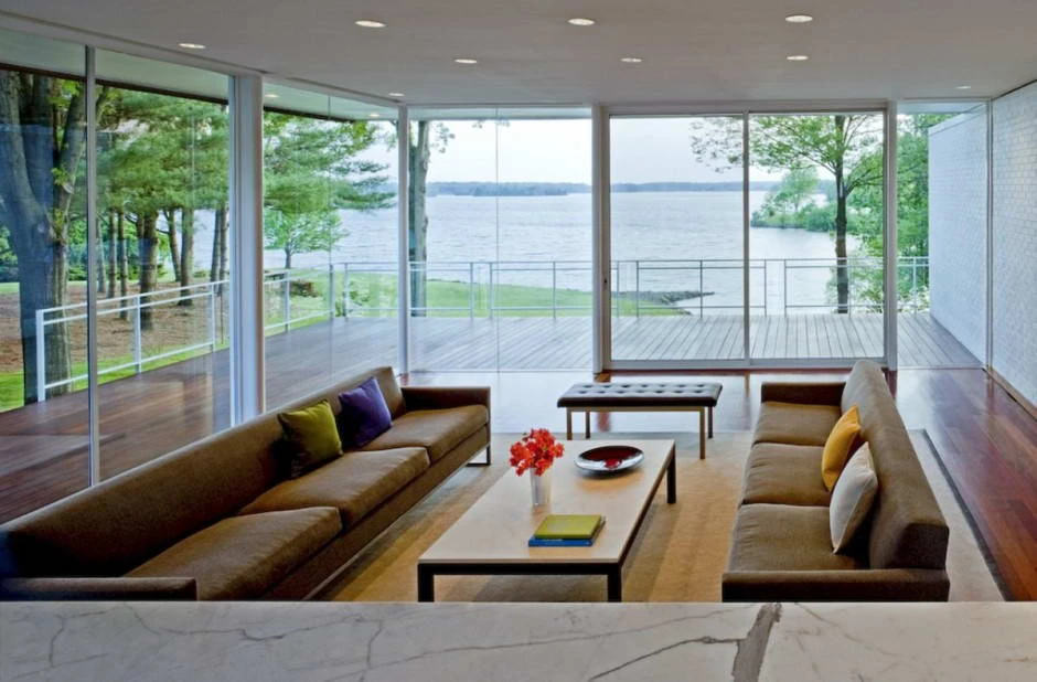 Дом разделен на три отдельные зоны. В северной части расположены главная спальня и приватные помещения. В центральной зоне находятся общая гостиная и столовая, а в южной — гостевое крыло и семейная комната. Вход оформлен в виде путешествия: посетители проходят через ворота с навесом, поднимаются по короткой лестнице и следуют по извилистой дорожке между двумя сохранившимися дубами. Это приводит к кульминационному моменту: прежде чем дойти до входной двери, нужно пересечь водоем, а за ним — полностью застекленный вестибюль, из которого открывается вид на озеро.