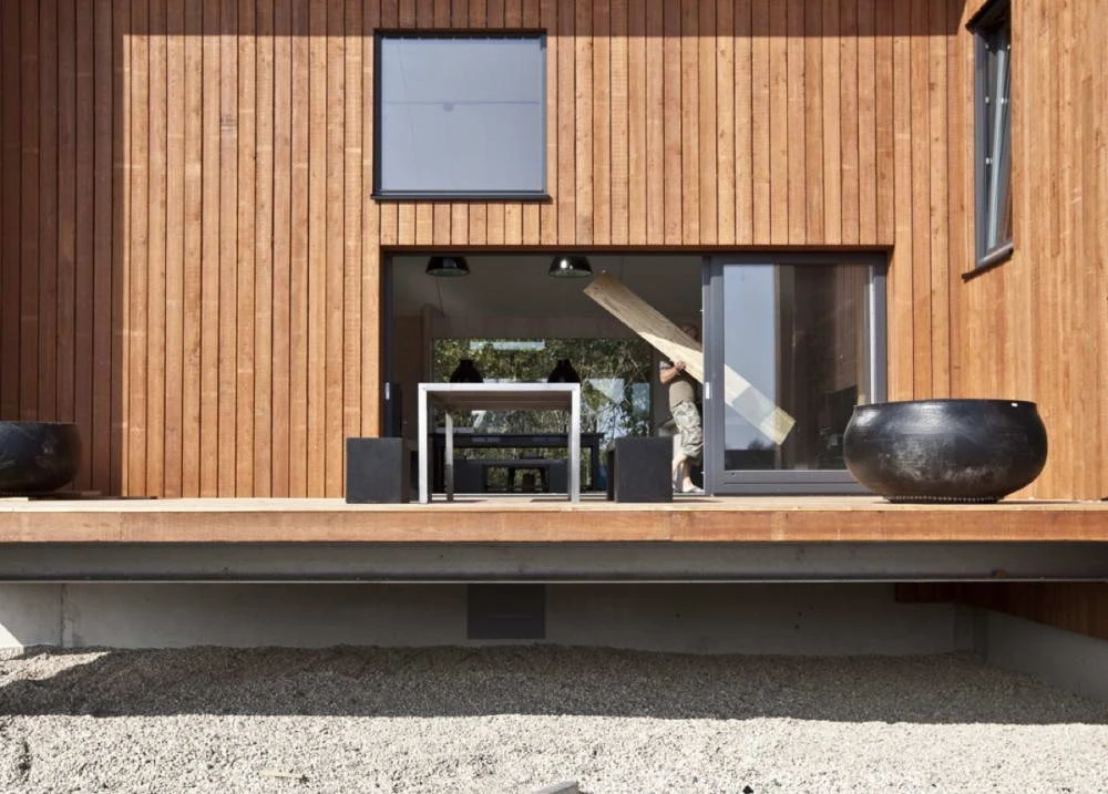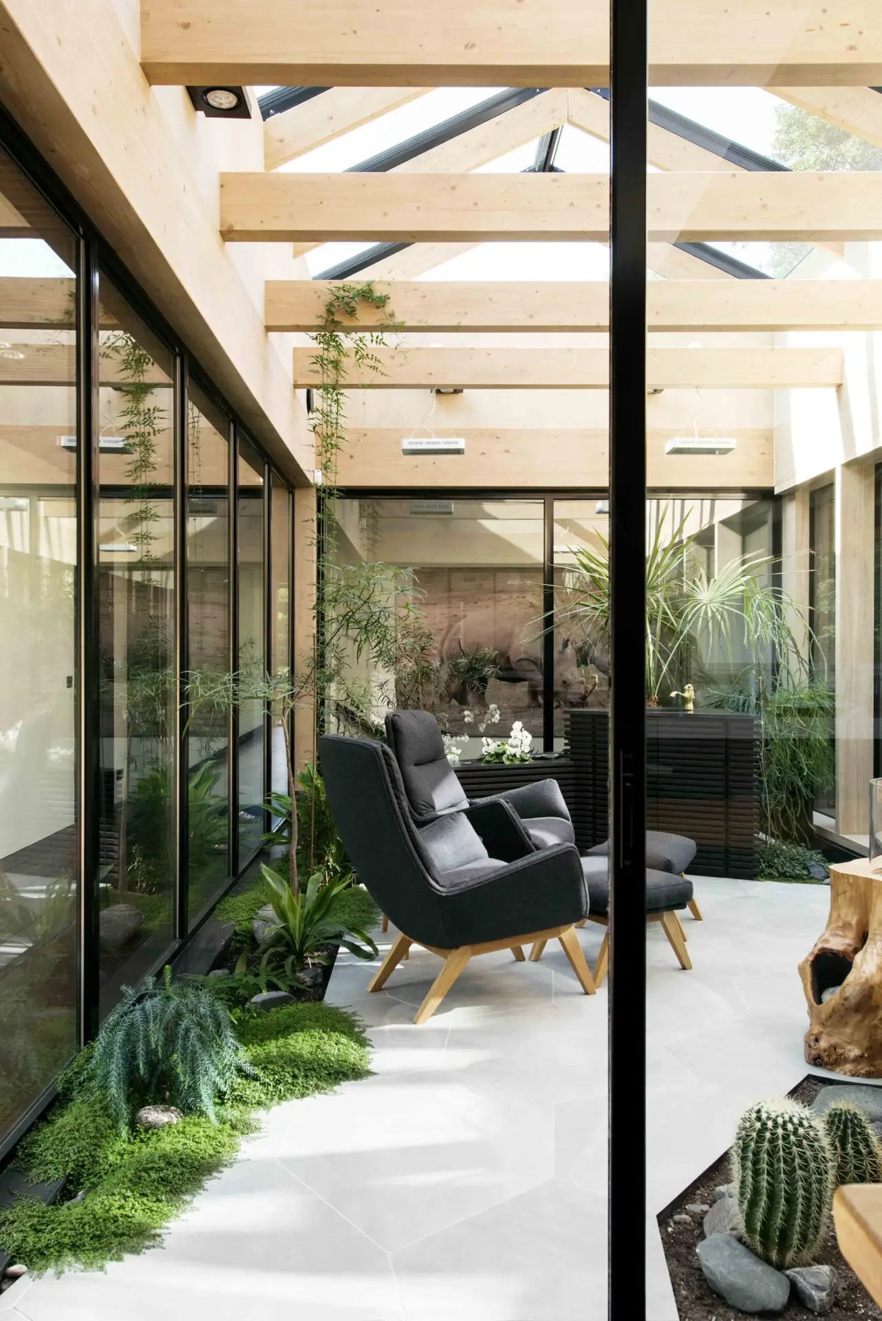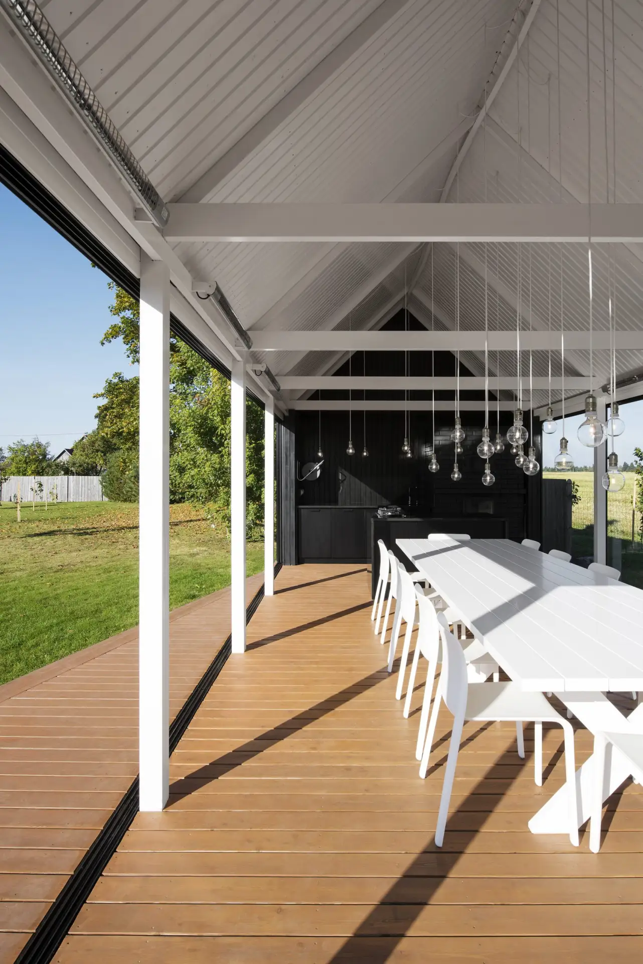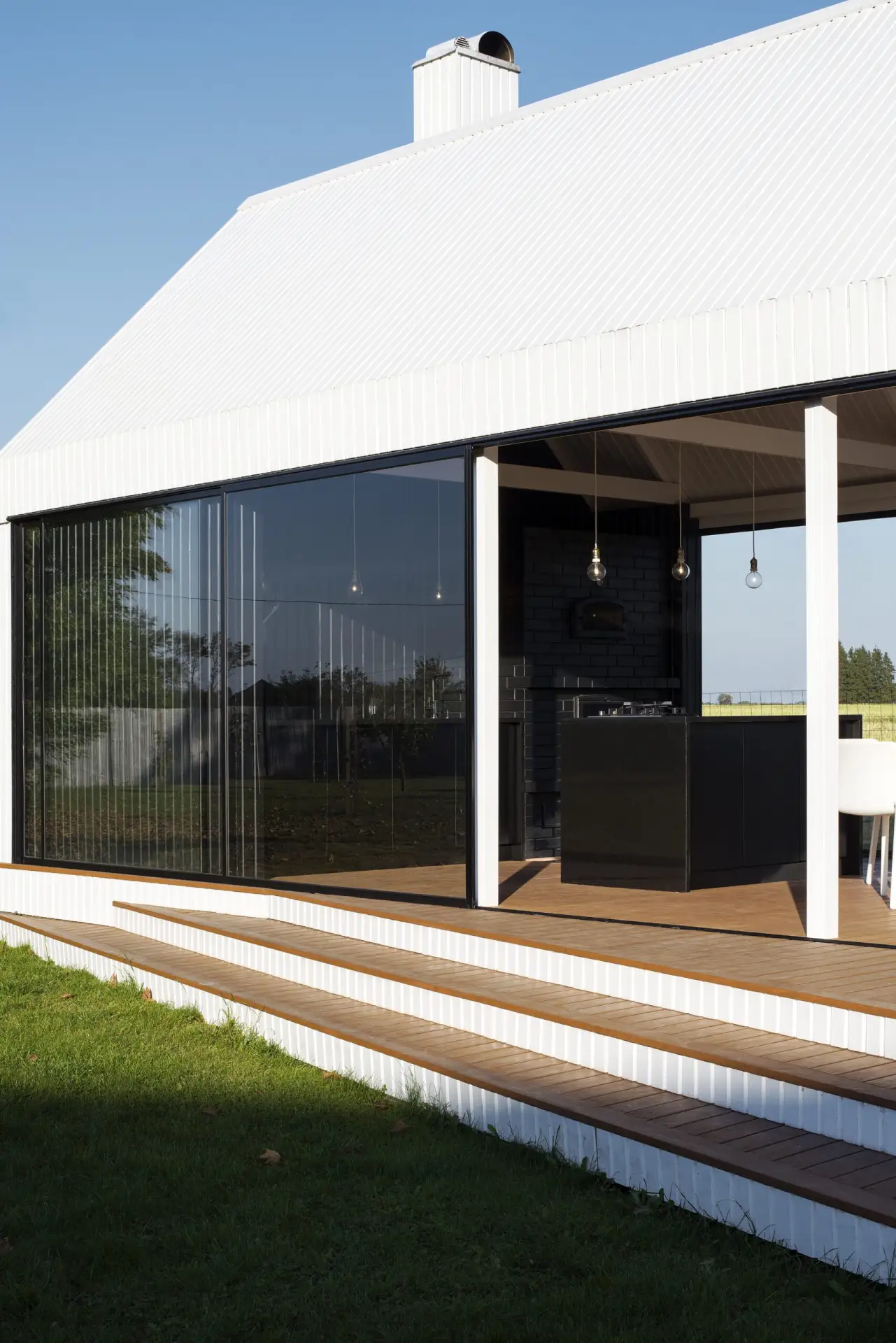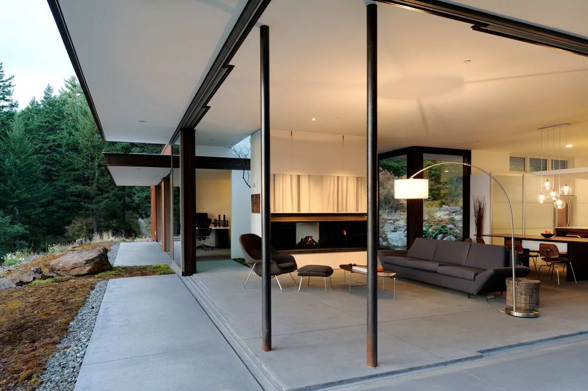 Закрытая стена с западной стороны создает ощущение внутреннего дворика, защищенного от посторонних взглядов. Внешнее пространство становится частью интерьера, расширяя гостиную в летние месяцы.