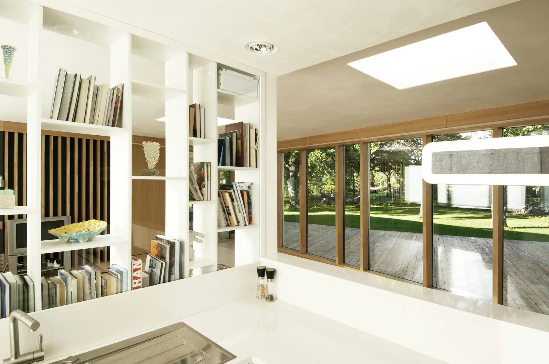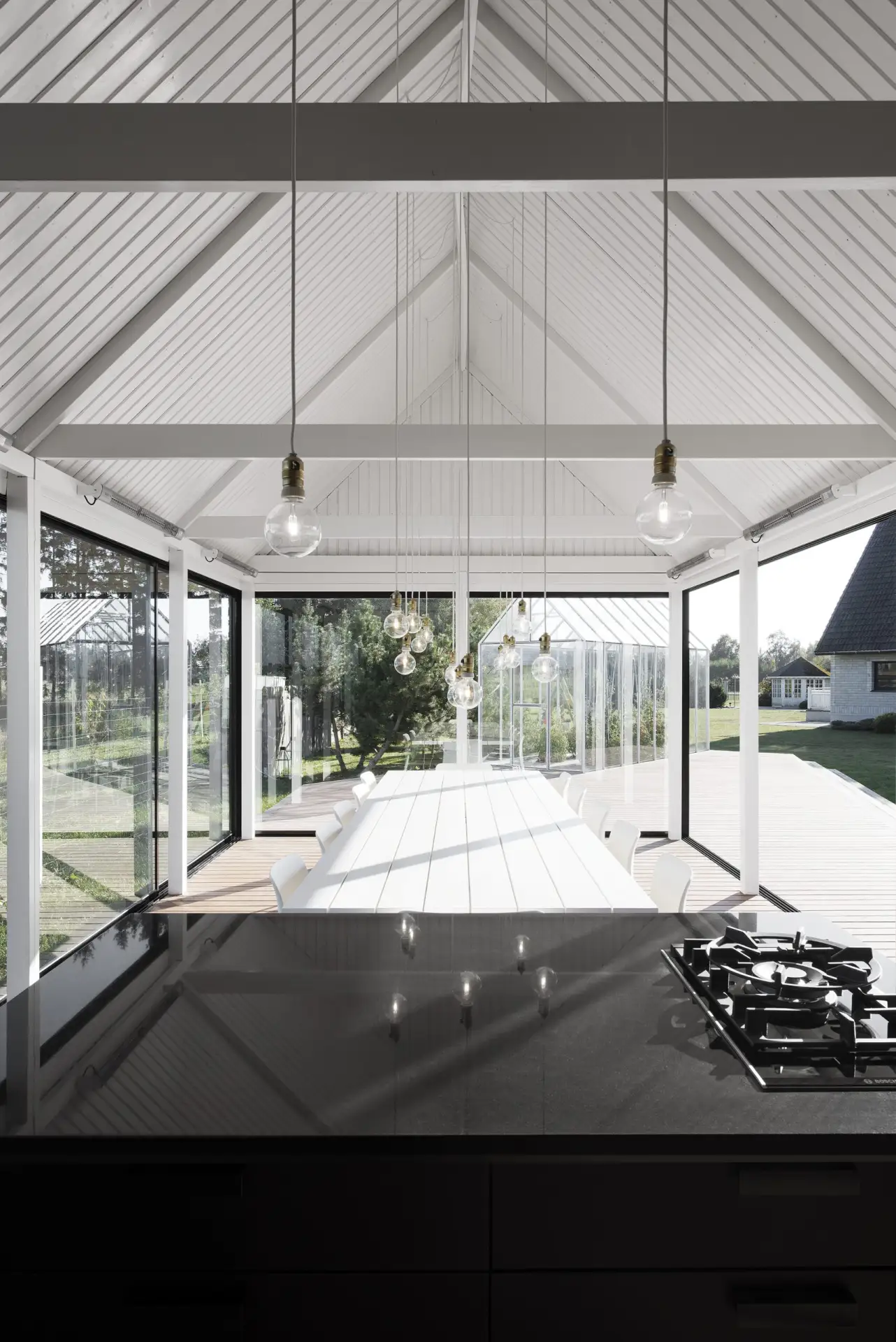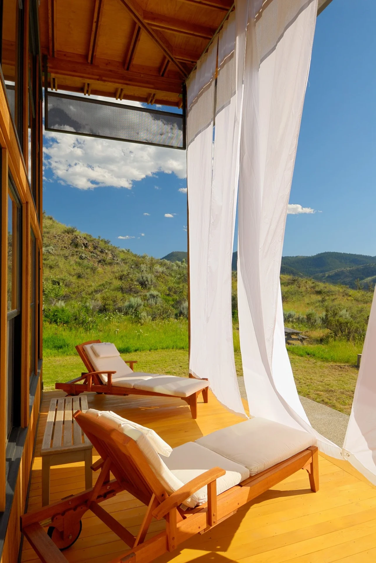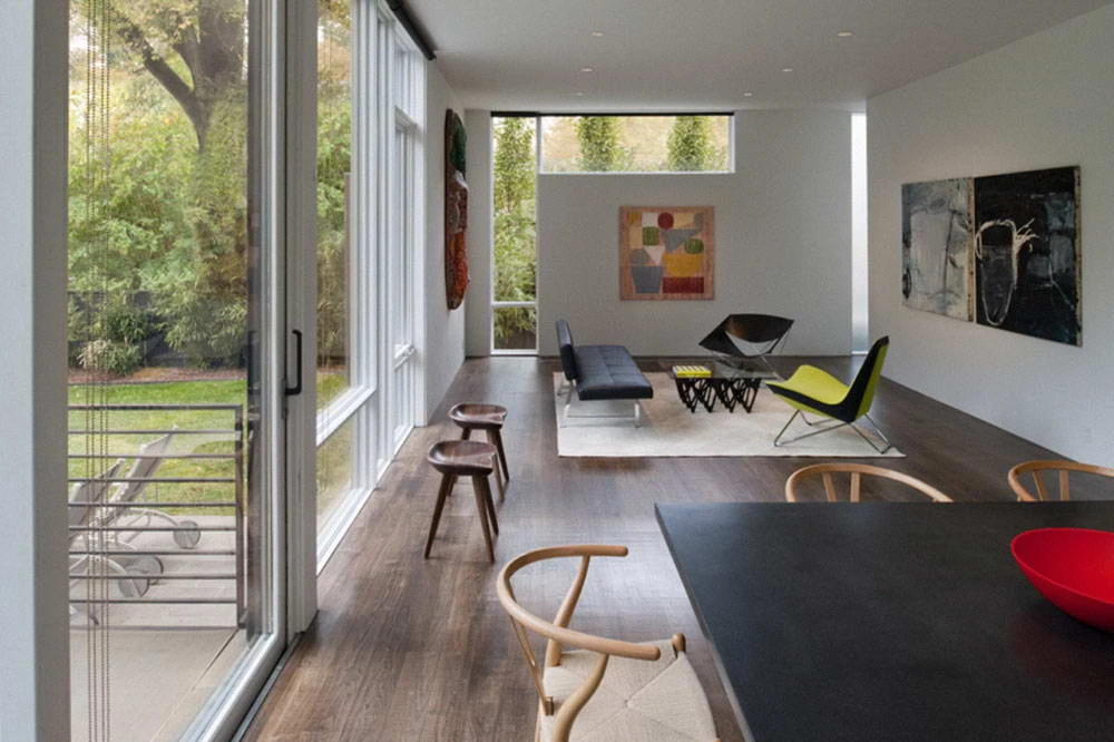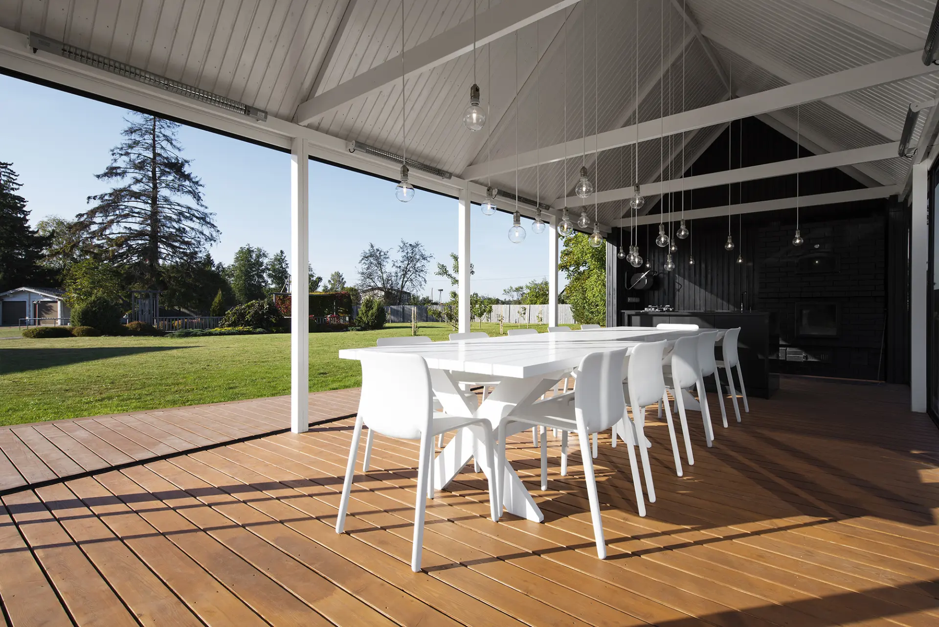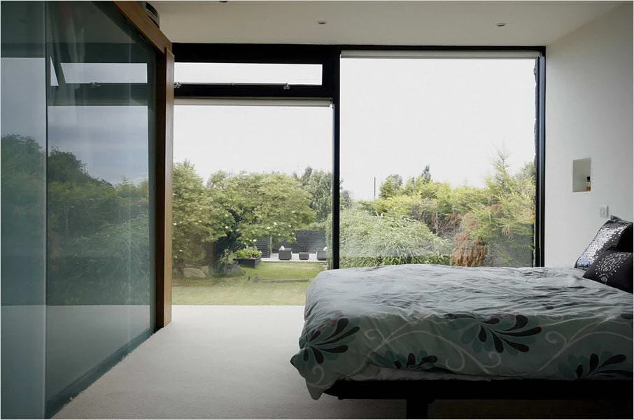 Закрытая стена с западной стороны создает ощущение внутреннего дворика, защищенного от посторонних взглядов. Внешнее пространство становится частью интерьера, расширяя гостиную в летние месяцы.