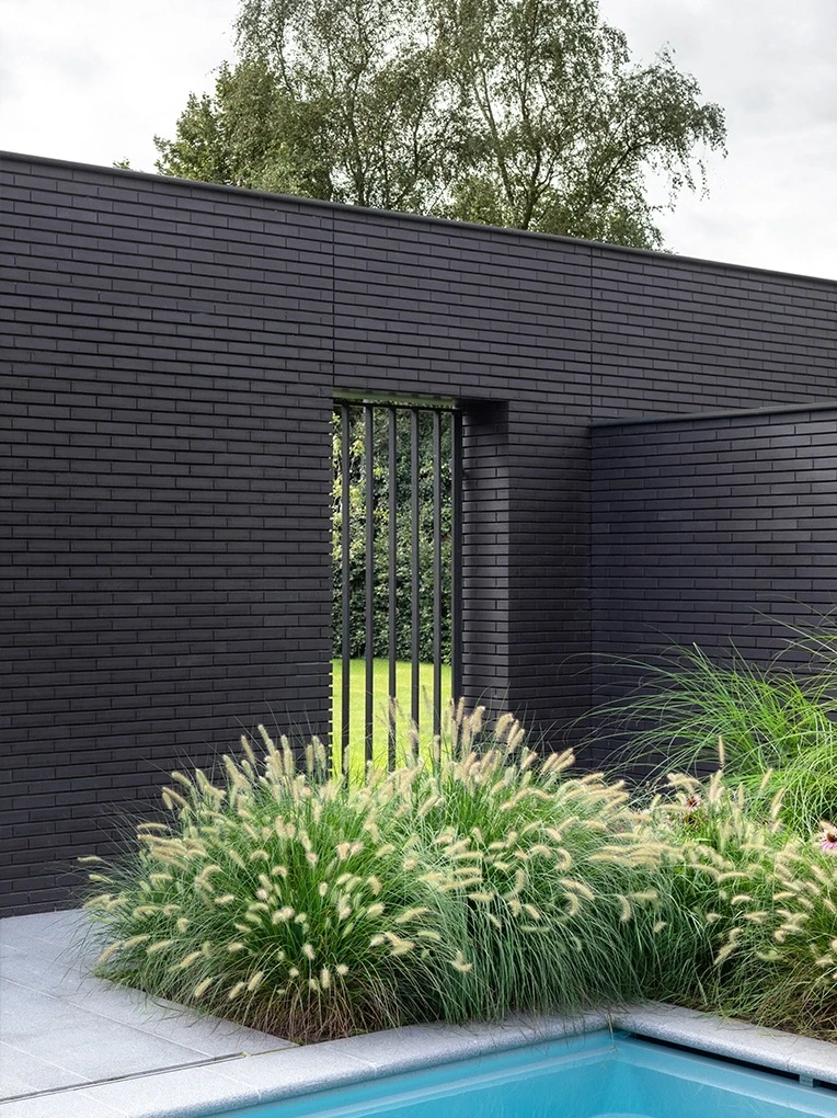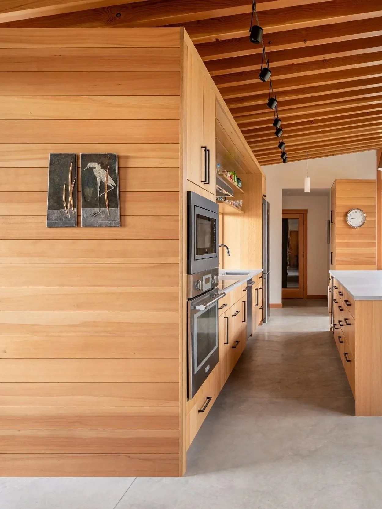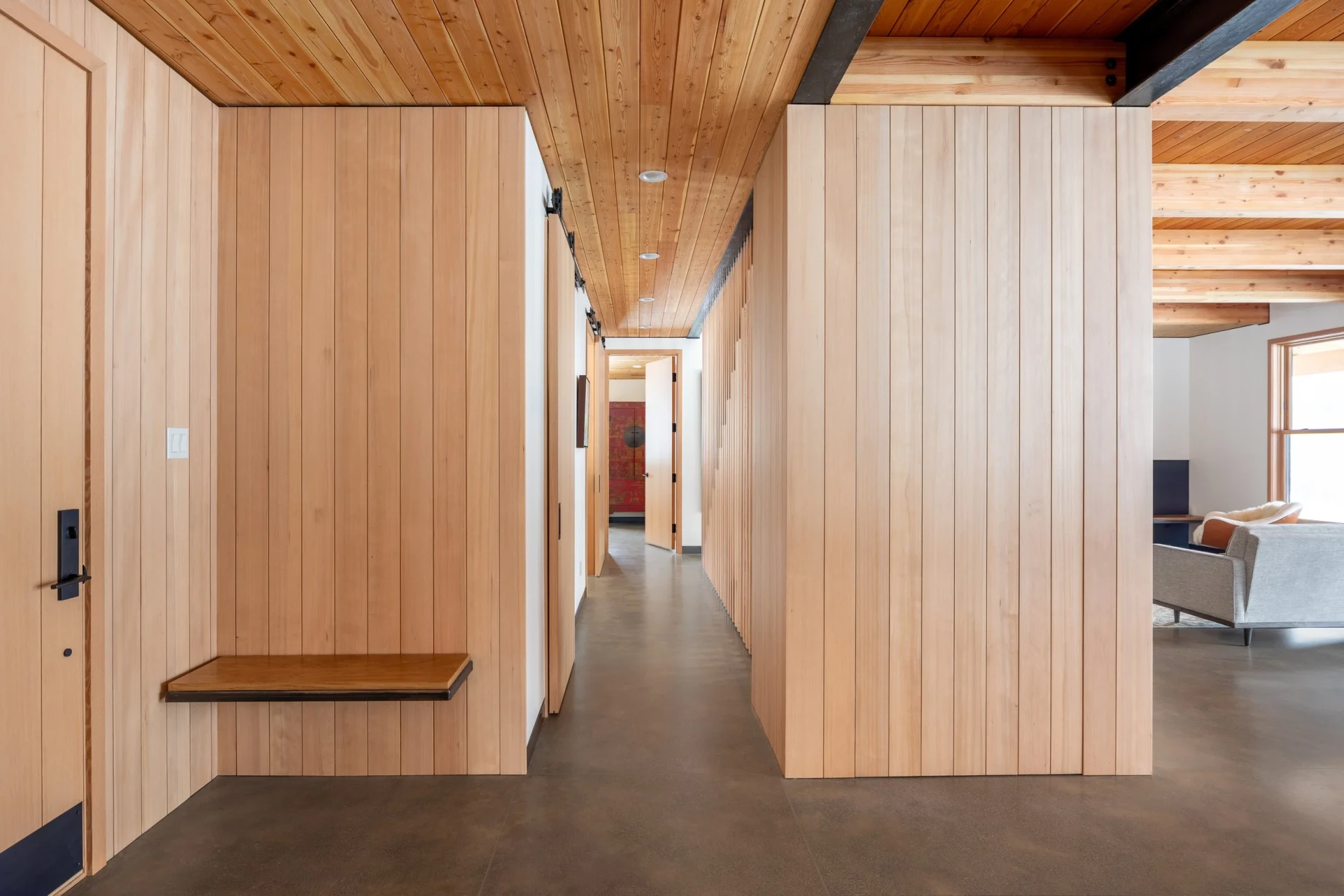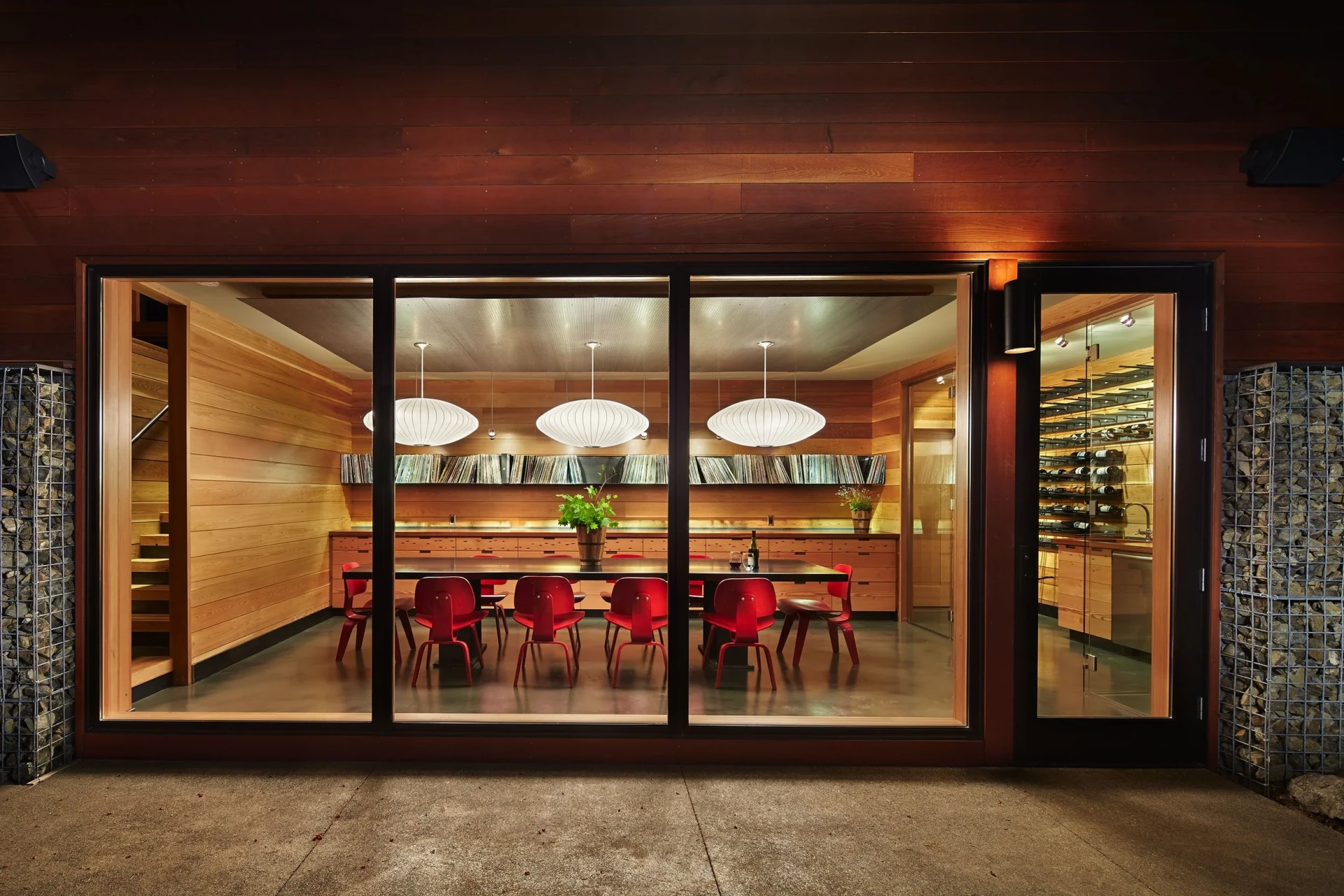 Закрытая стена с западной стороны создает ощущение внутреннего дворика, защищенного от посторонних взглядов. Внешнее пространство становится частью интерьера, расширяя гостиную в летние месяцы.