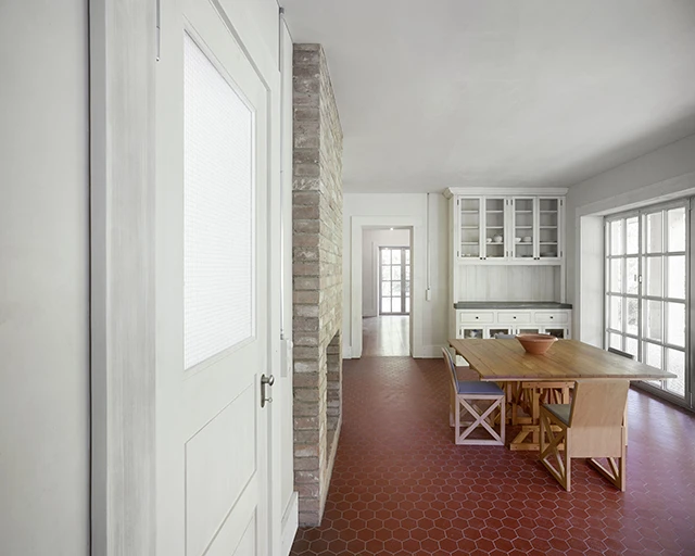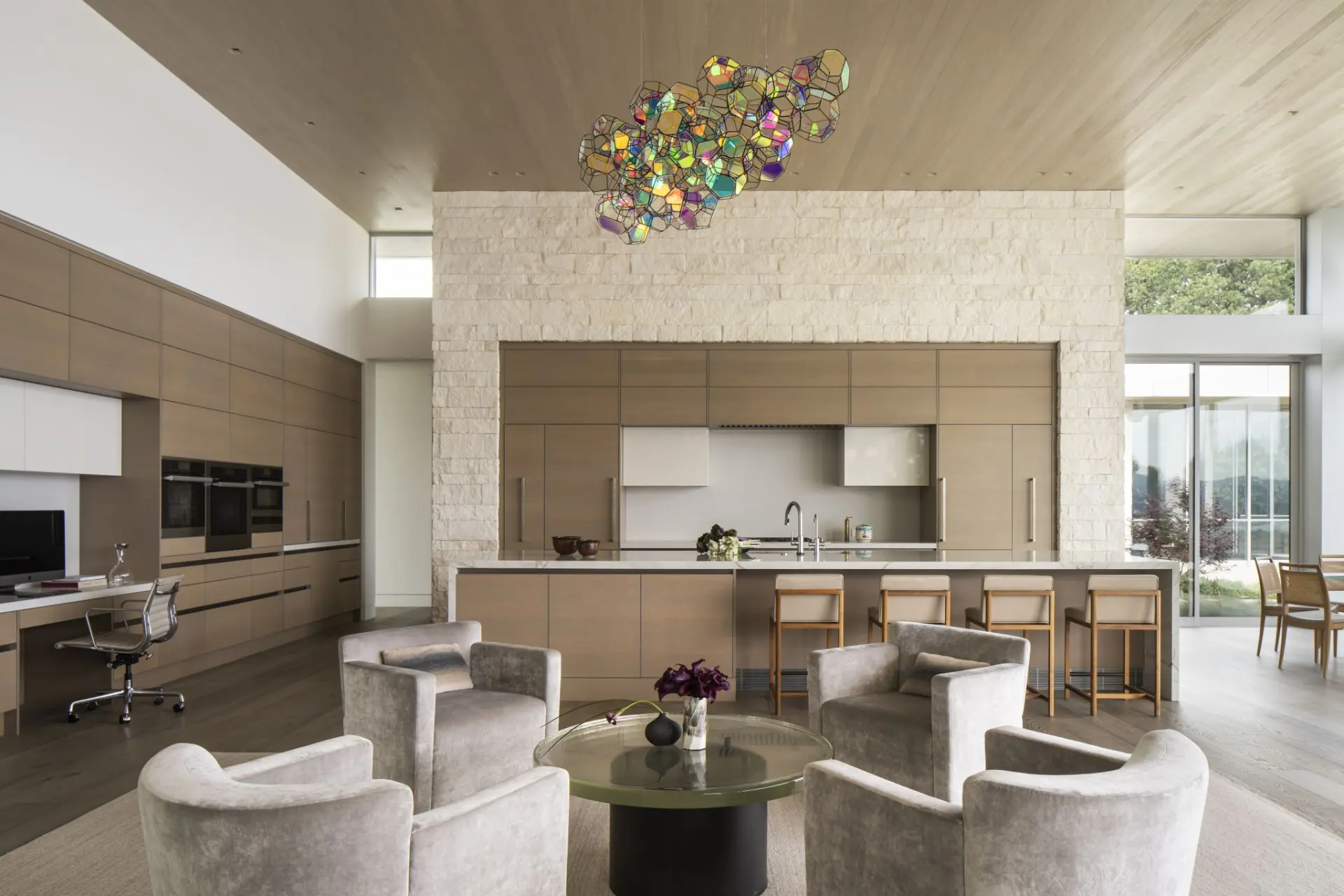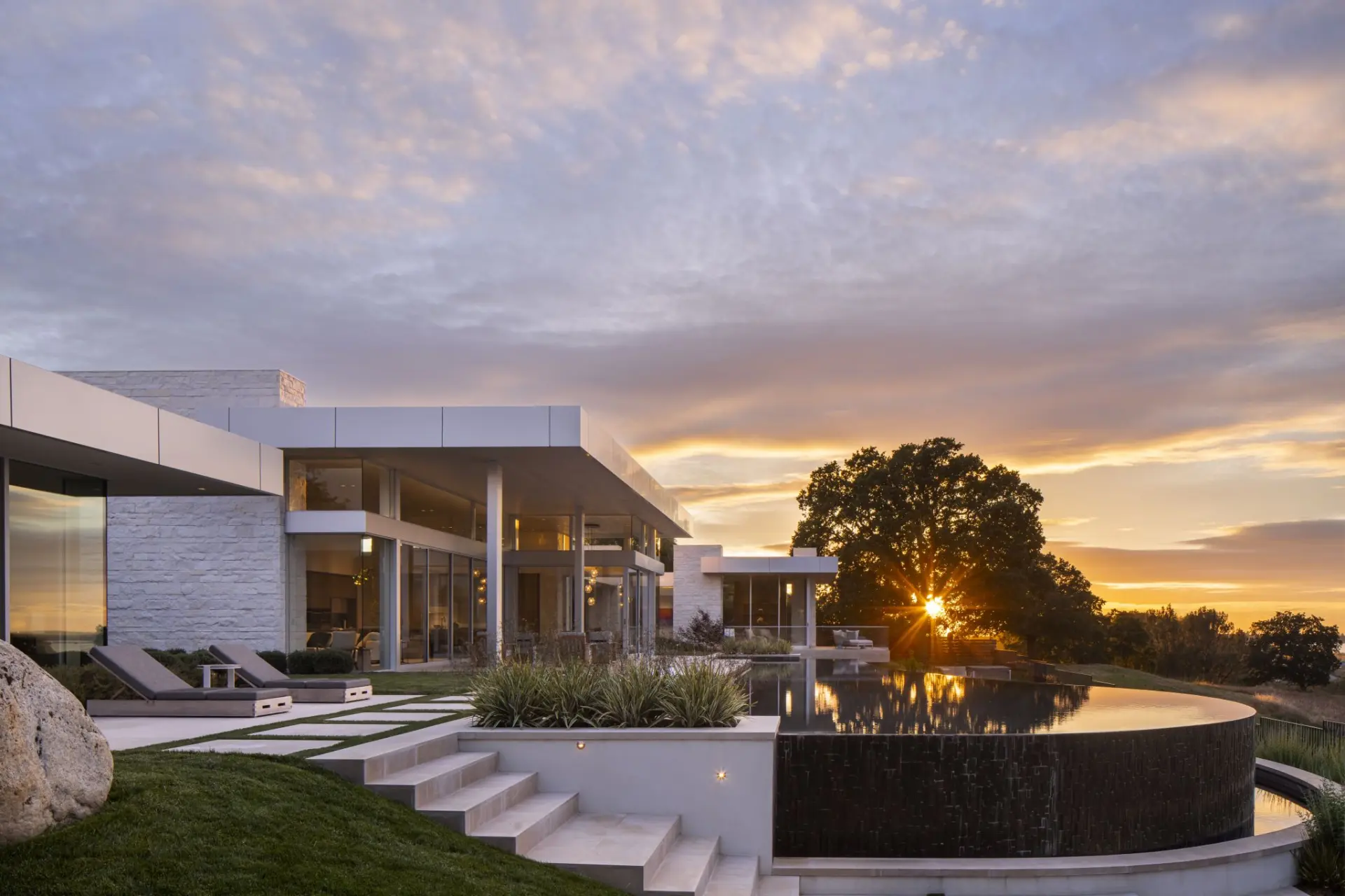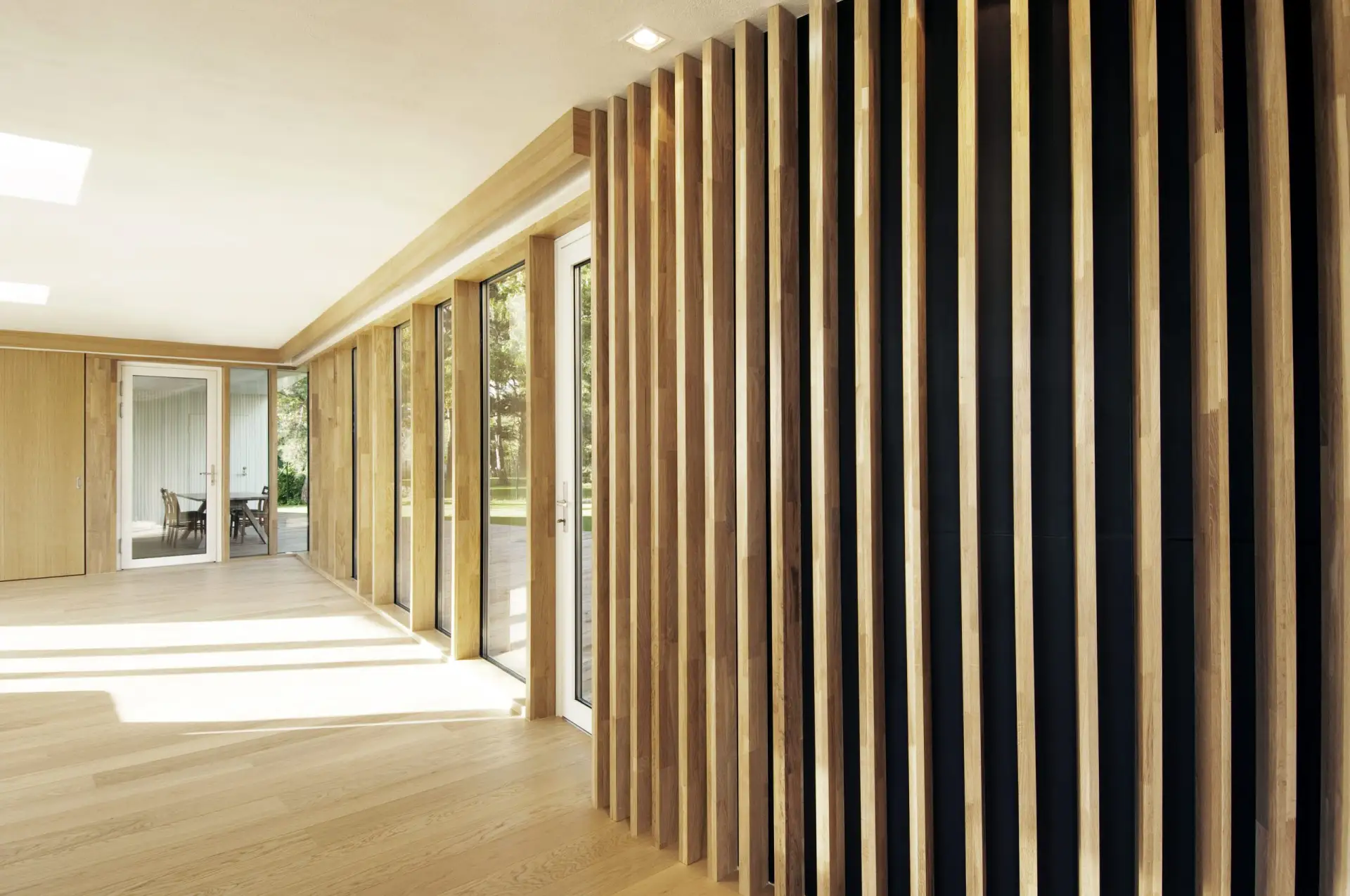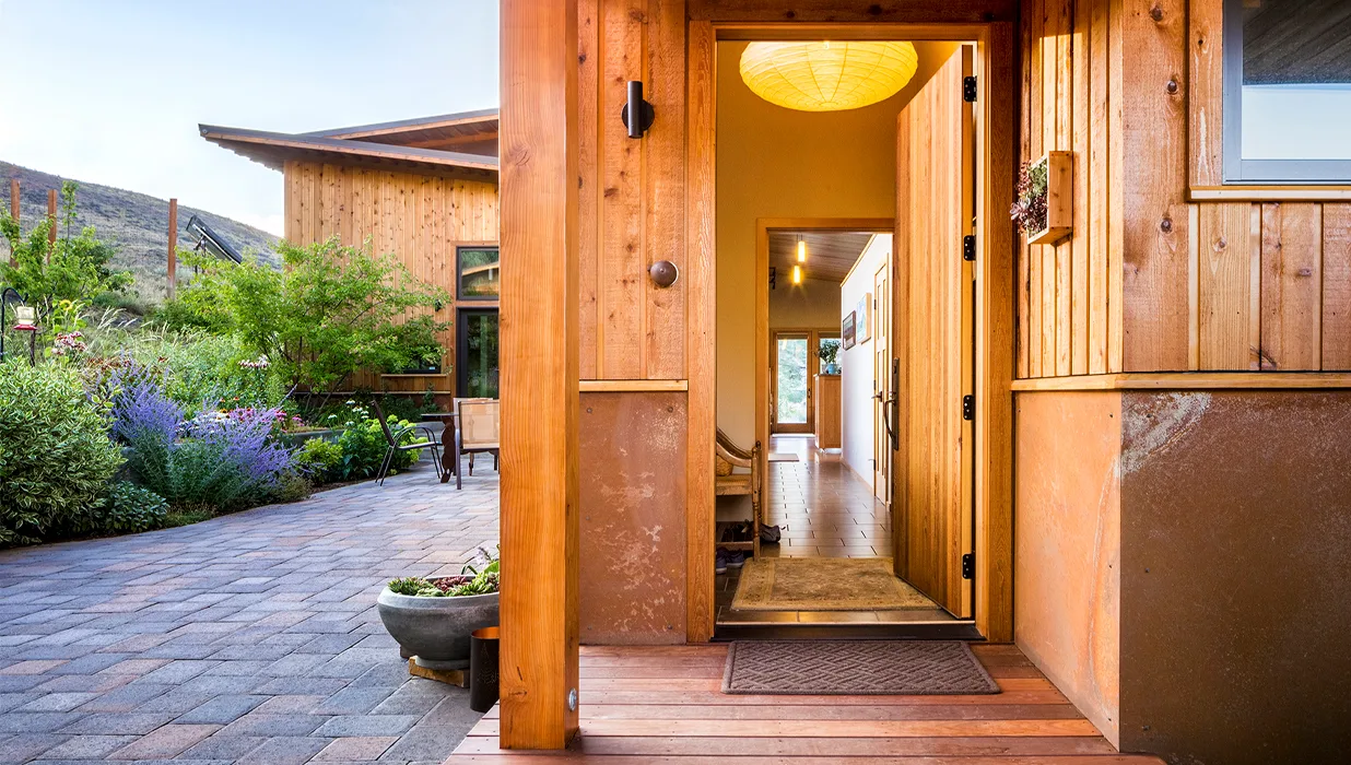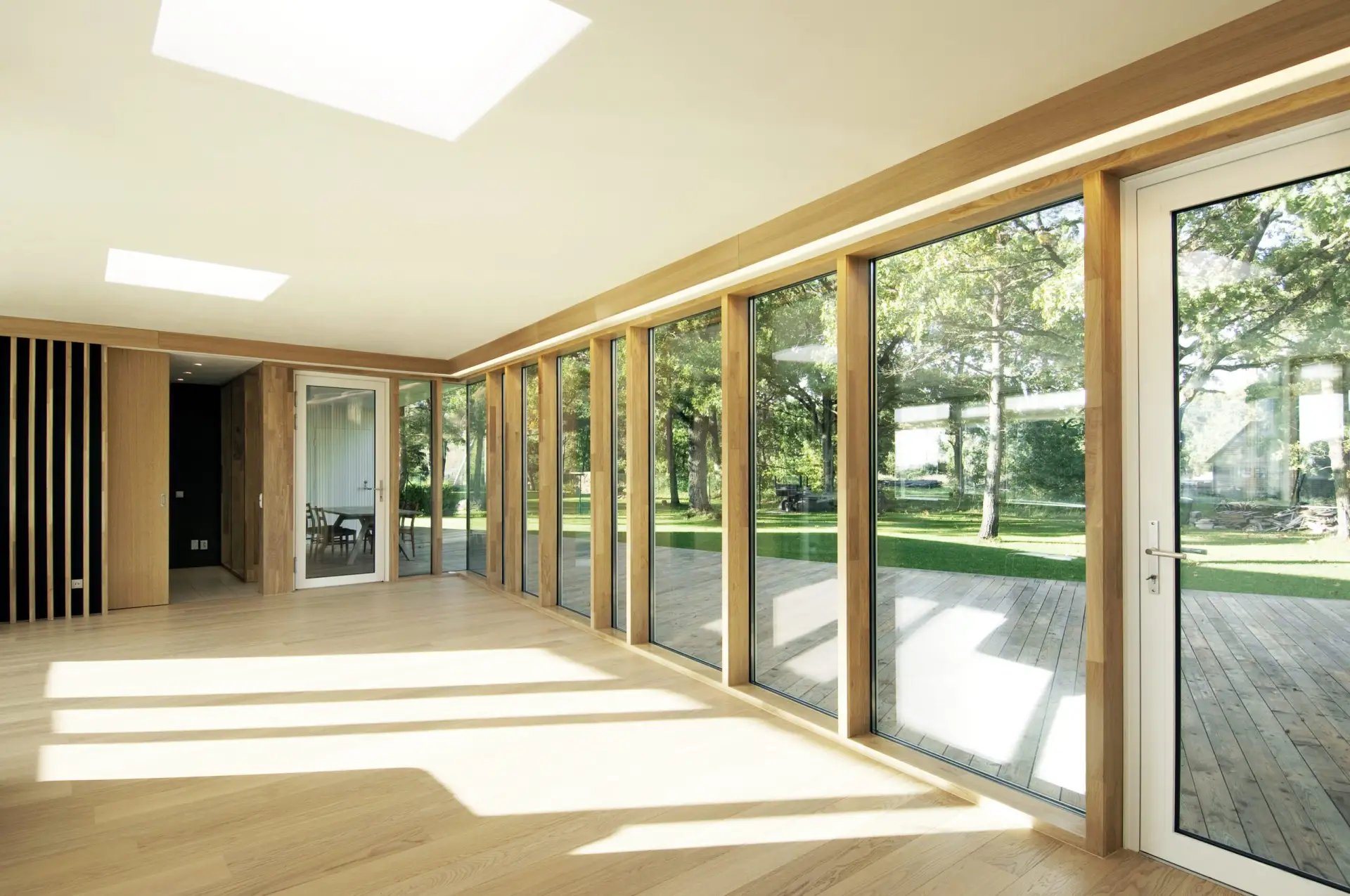 Закрытая стена с западной стороны создает ощущение внутреннего дворика, защищенного от посторонних взглядов. Внешнее пространство становится частью интерьера, расширяя гостиную в летние месяцы.
