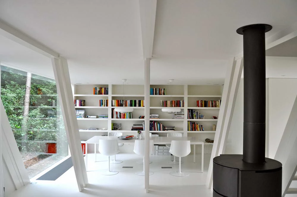 Этот дом-кабинет — от выбора месторасположения и до мелких элементов внутреннего убранства — подчинён основной идее заказчика: чтобы здание выглядело таким, словно изначально находилось в гуще деревьев приусадебного участка, и чтобы в нём не было никаких лишних элементов — лишь только то, что по-настоящему необходимо.