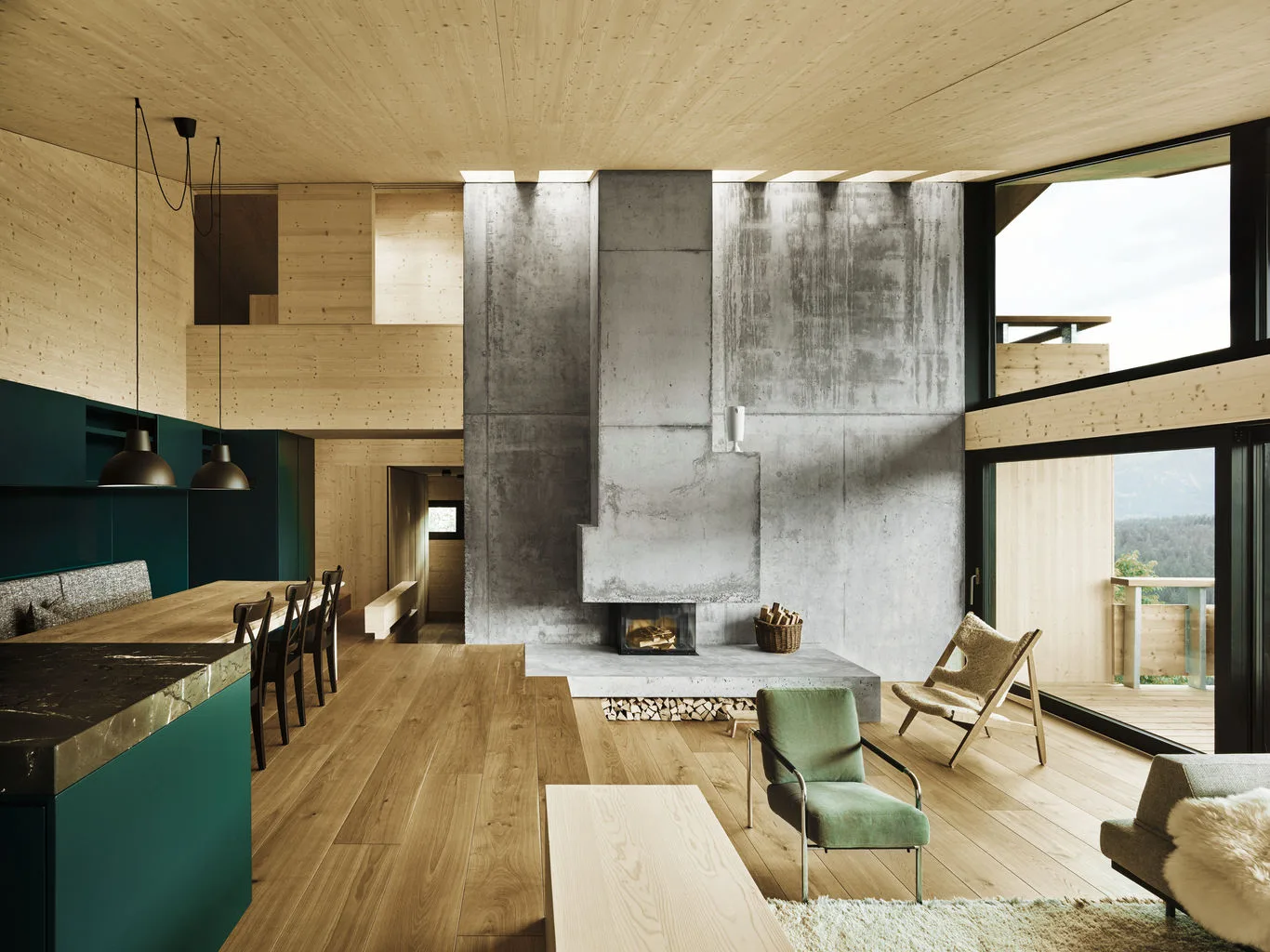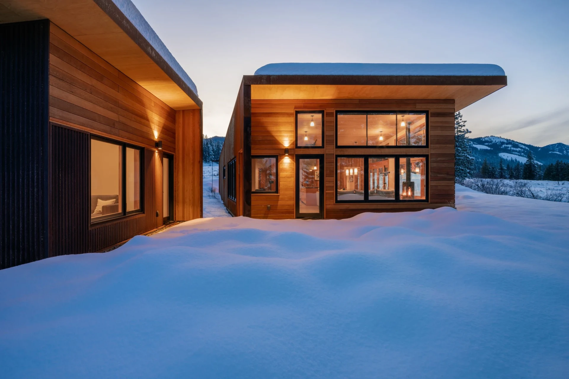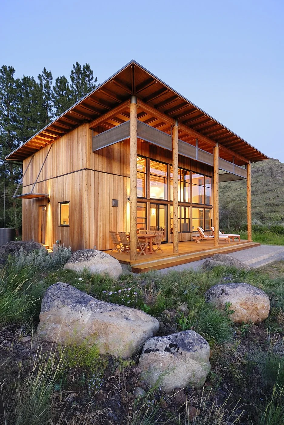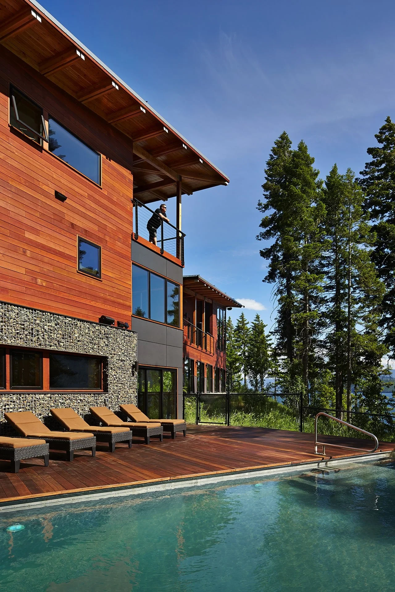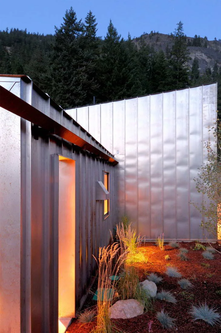 Жилые помещения выходят на южную сторону, откуда открывается панорамный вид на горы. В экстерьере сочетаются кедр и состаренная сталь, что создает ощущение тепла и прочности.