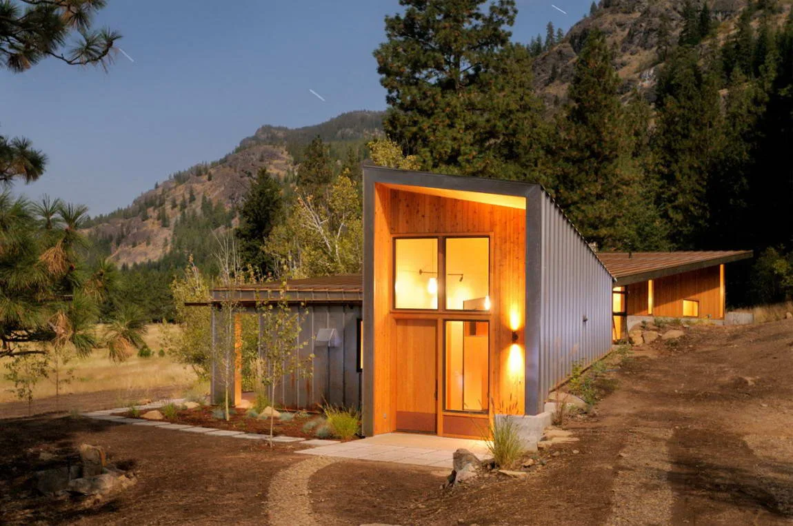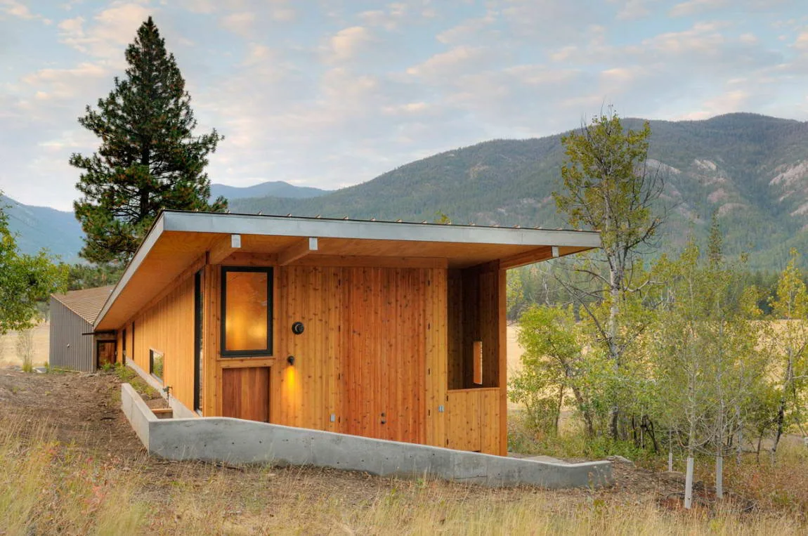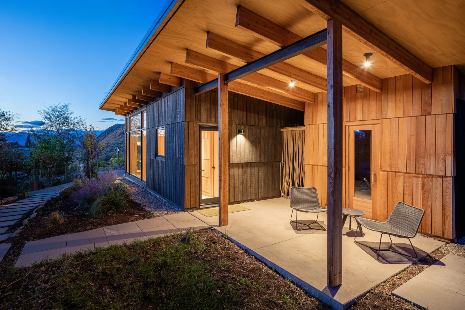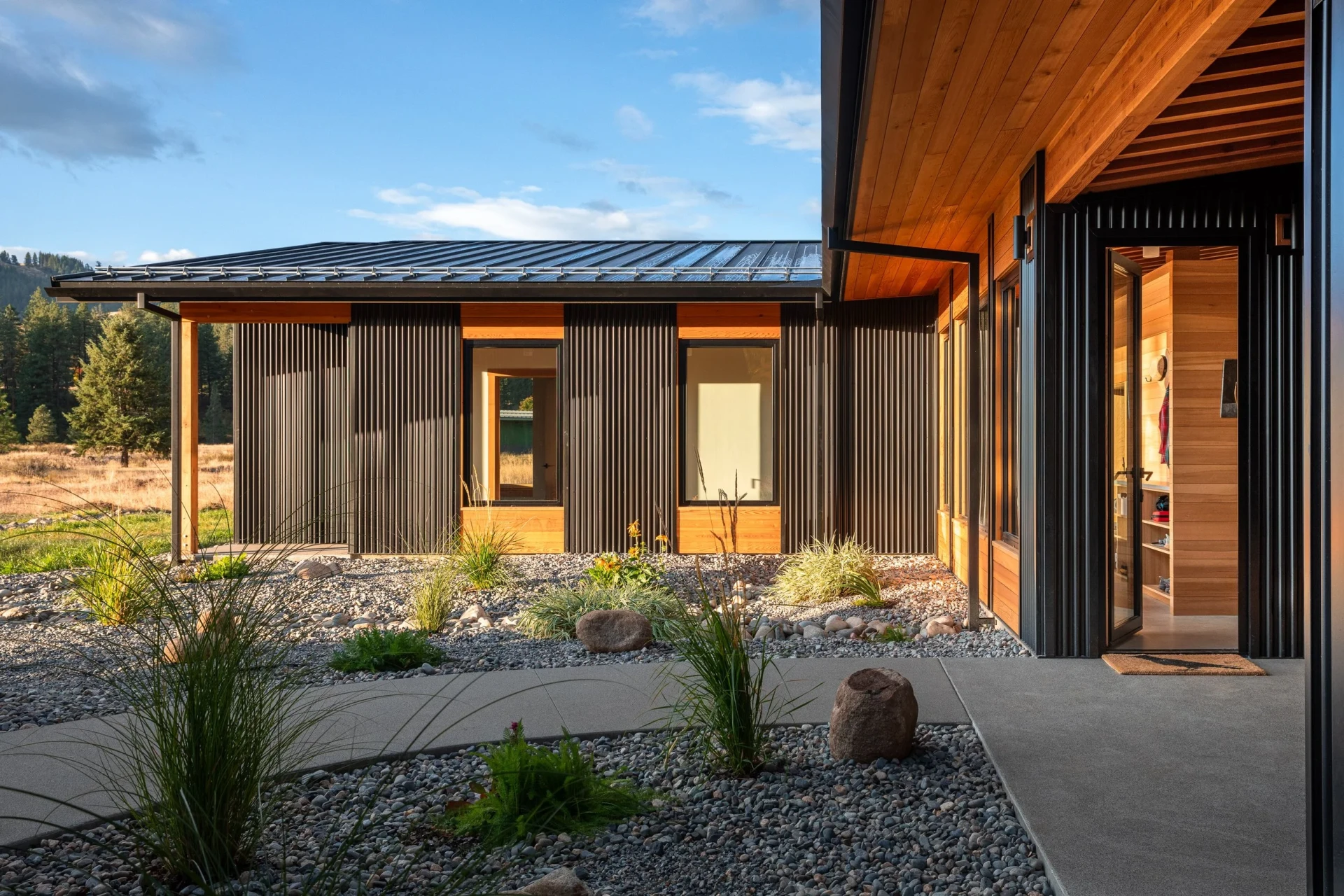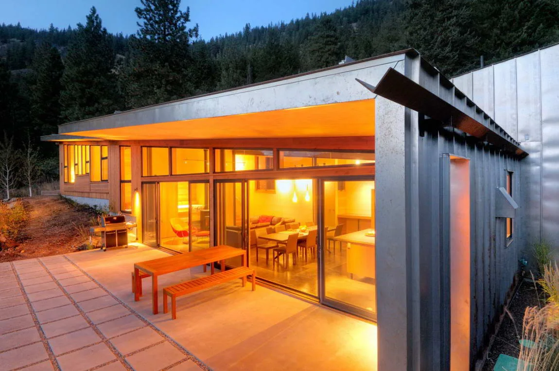 Жилые помещения выходят на южную сторону, откуда открывается панорамный вид на горы. В экстерьере сочетаются кедр и состаренная сталь, что создает ощущение тепла и прочности.