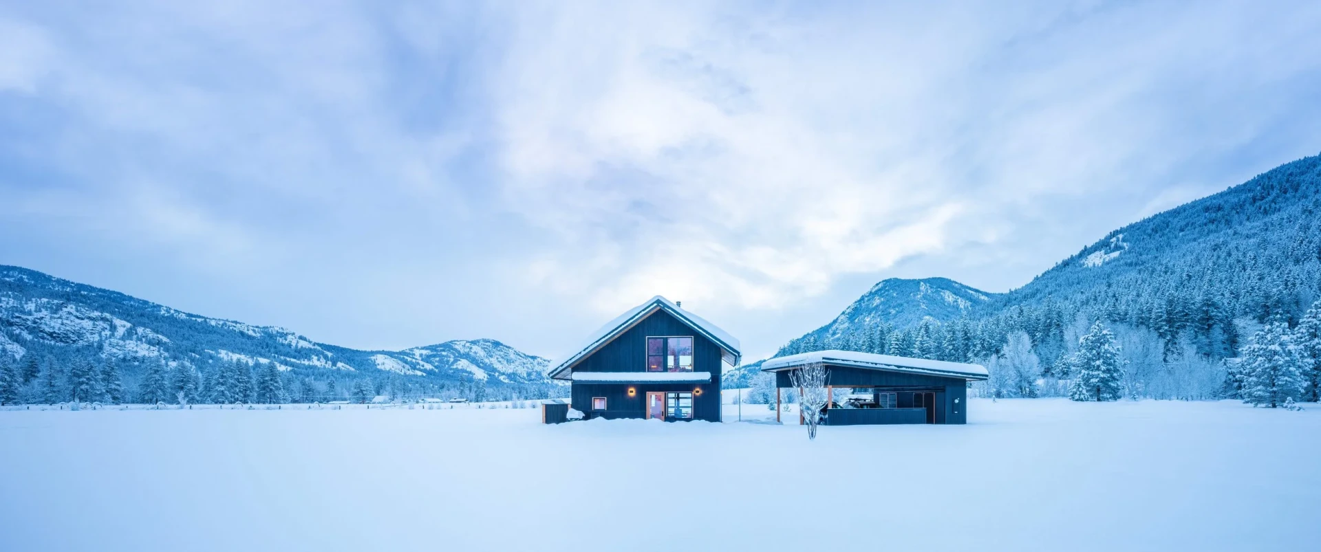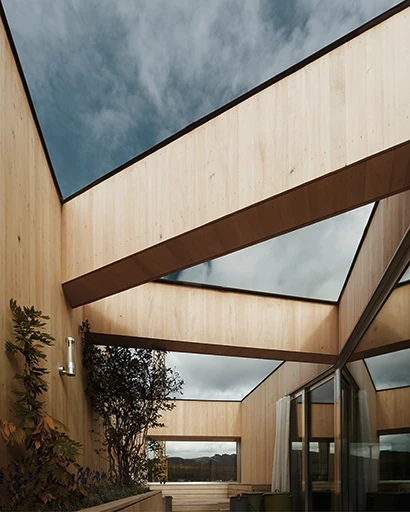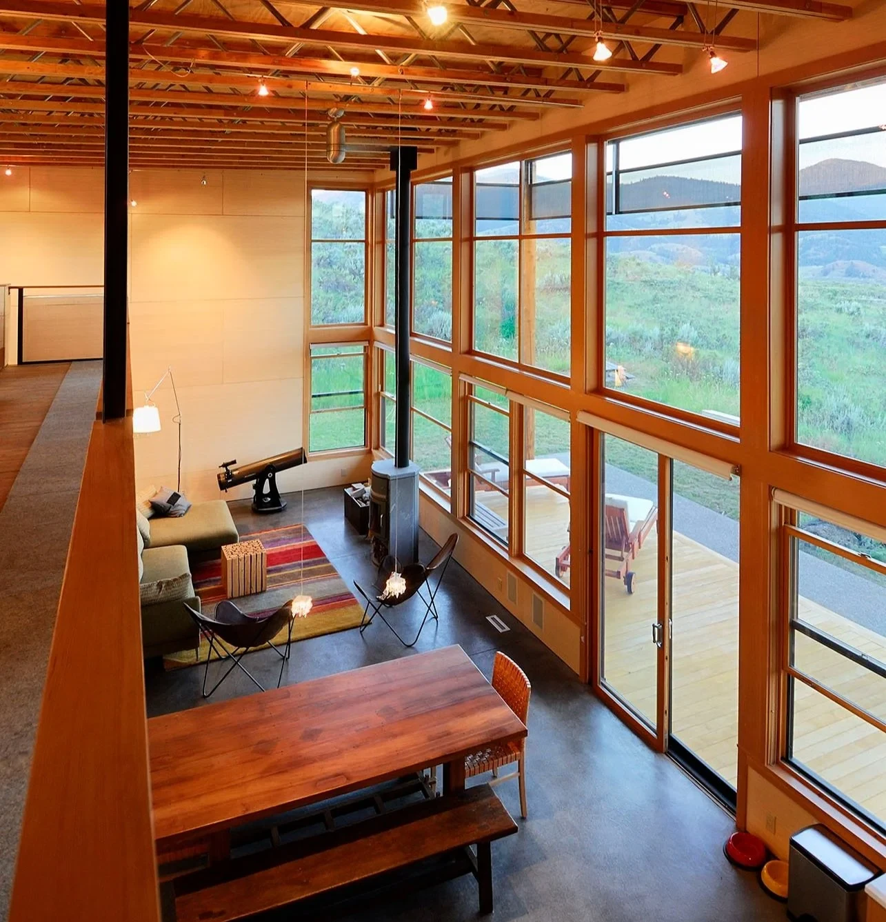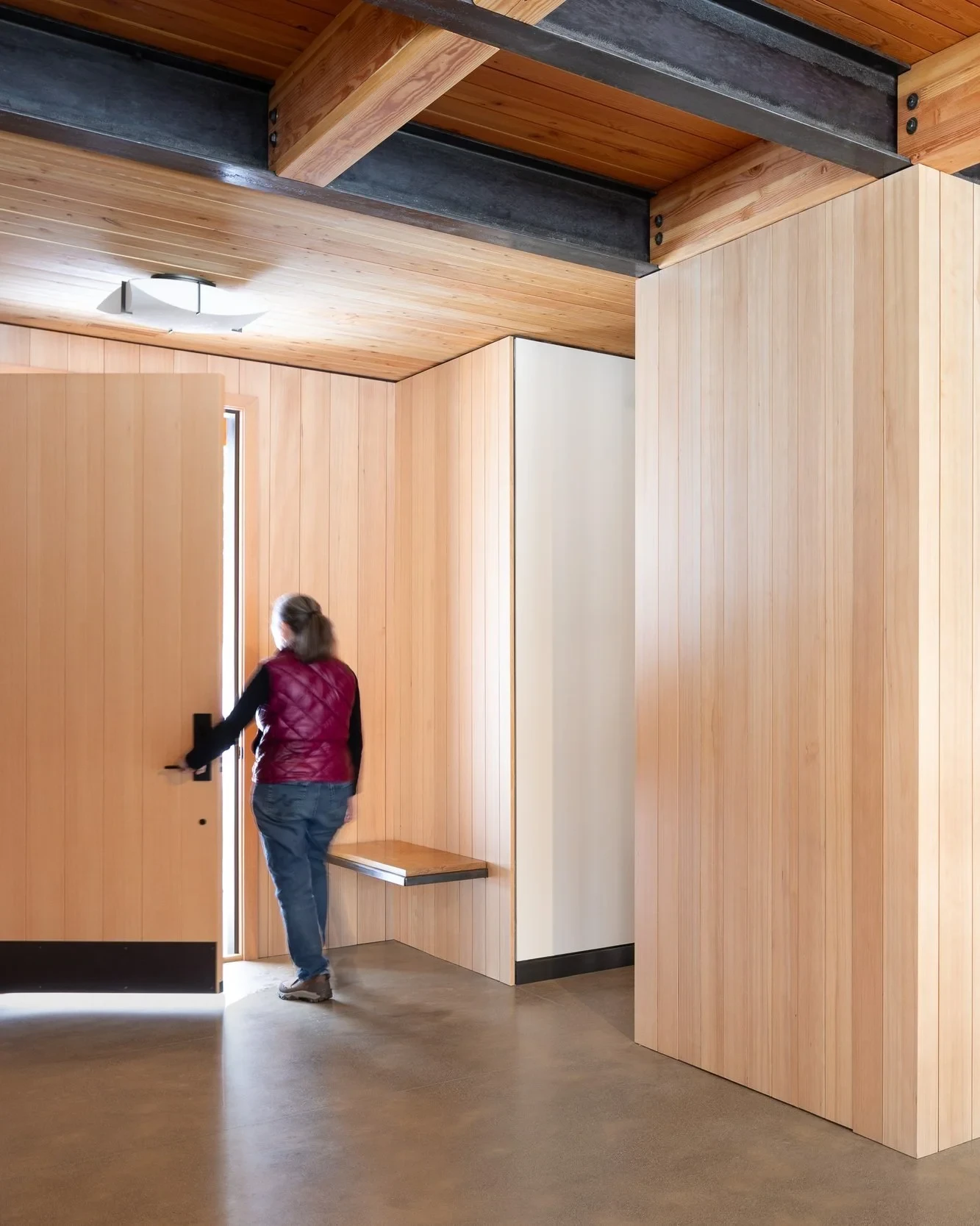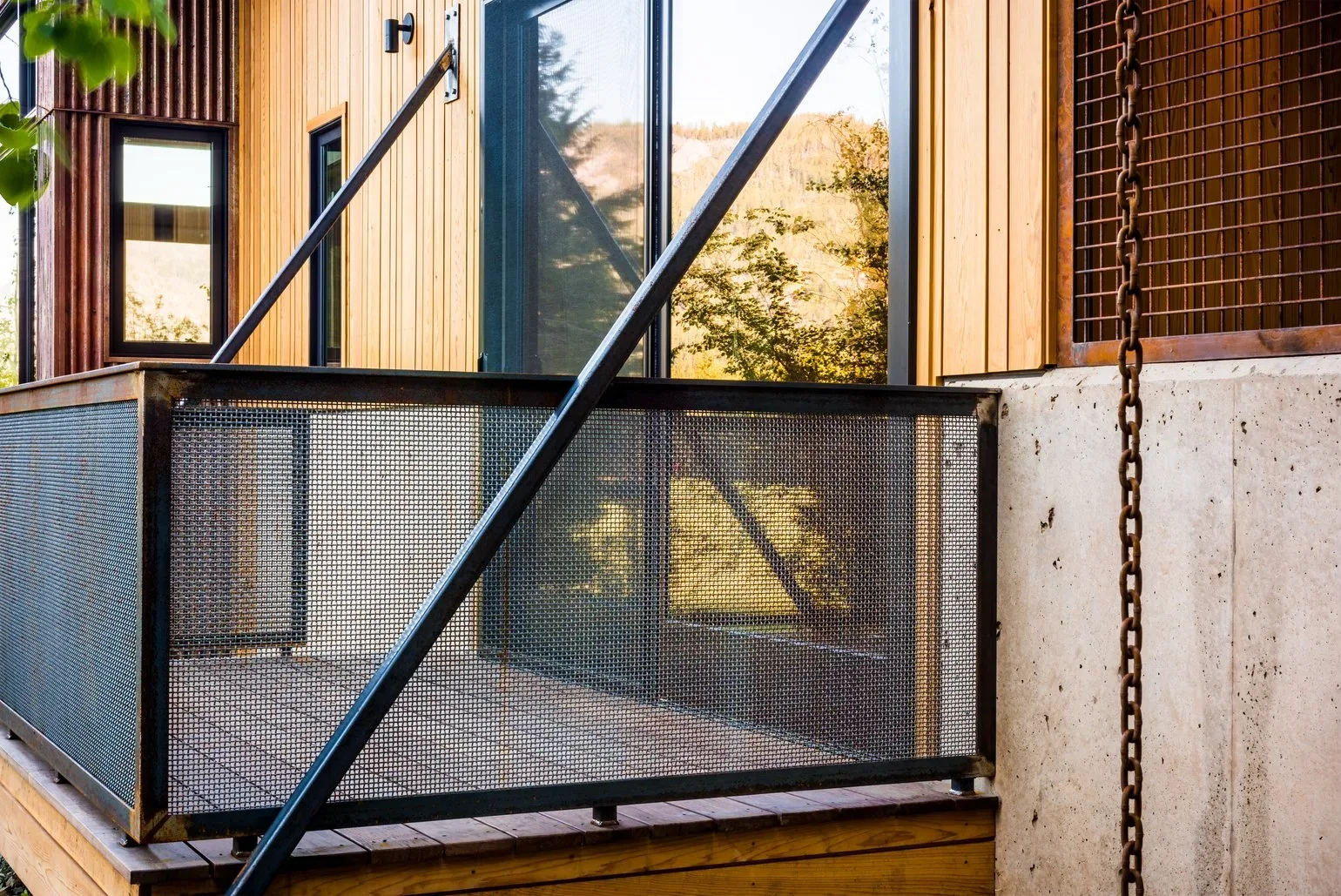 Жилые помещения выходят на южную сторону, откуда открывается панорамный вид на горы. В экстерьере сочетаются кедр и состаренная сталь, что создает ощущение тепла и прочности.