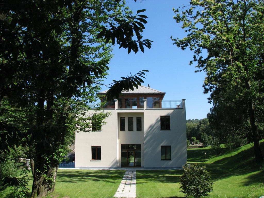Квадратный в плане дом построен на краю террасы. У него четыре почти одинаковых центрально-симметричных фасада, вследствие чего практически с любой точки он находится в центре пейзажа. В доме два полноценных этажа, большой цоколь с гаражом и хозпомещениями и пентхаус в виде башенки.