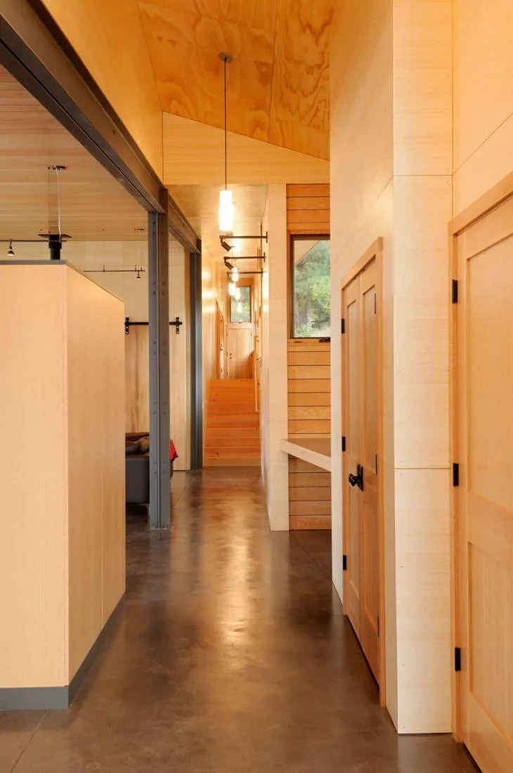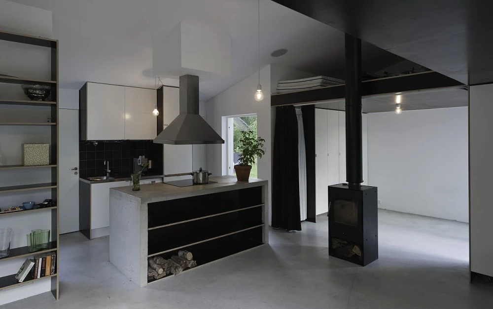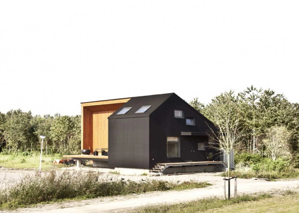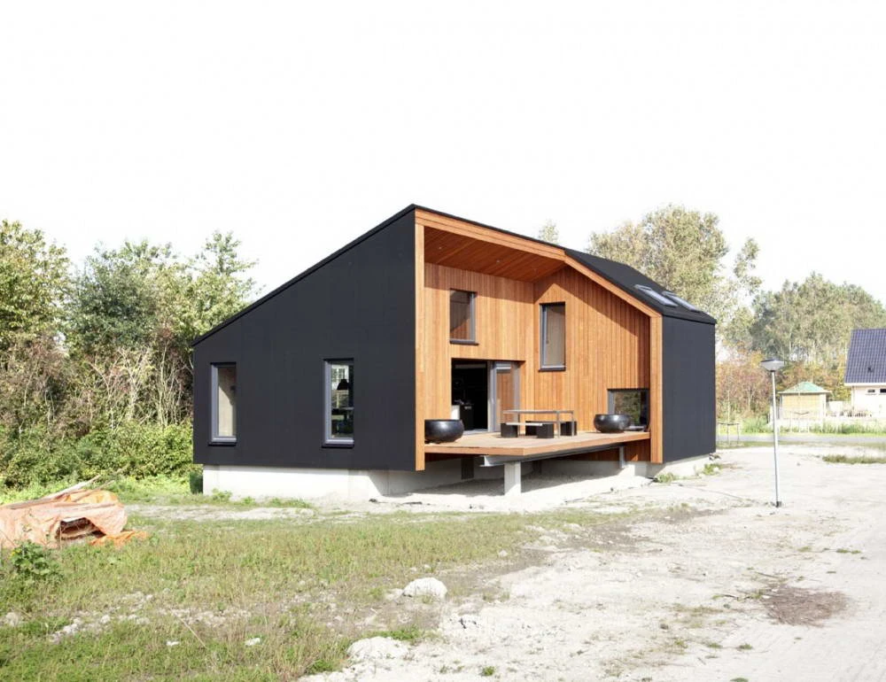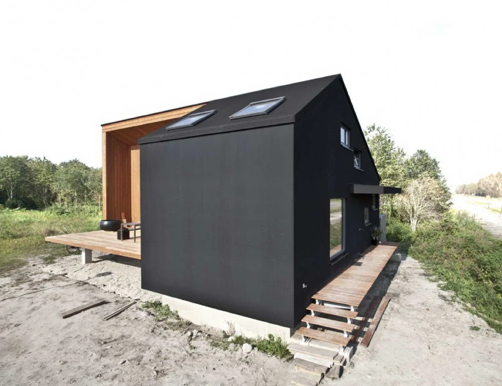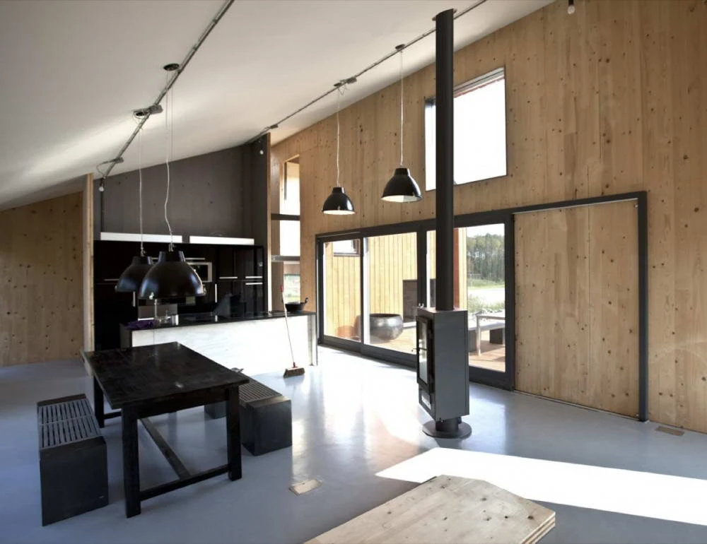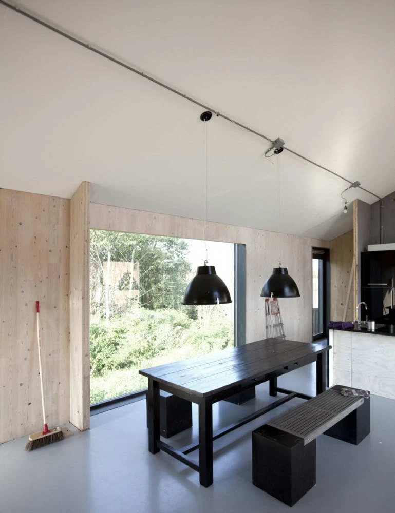 Как фасады, так и двускатная крыша покрыты черными крашеными досками. Интерьер этого дома в основном выполнен из дерева