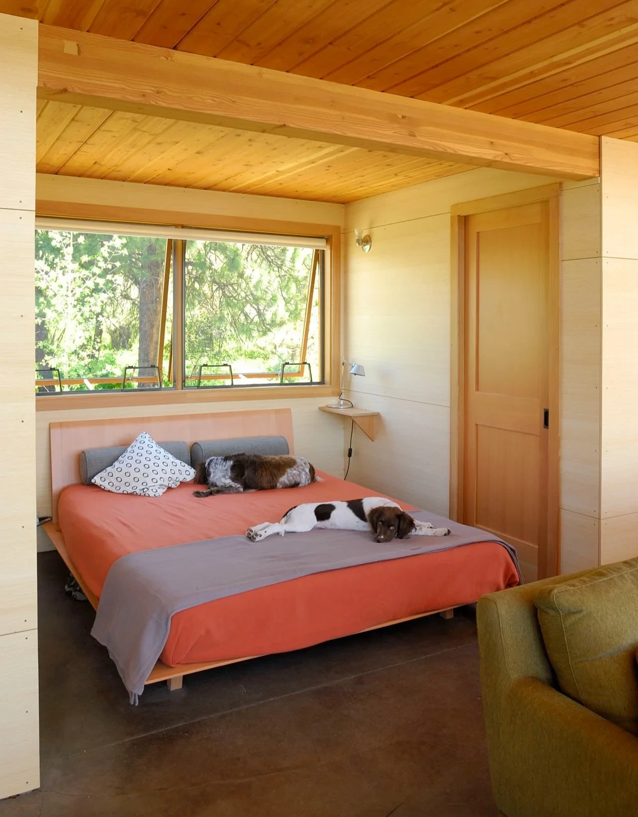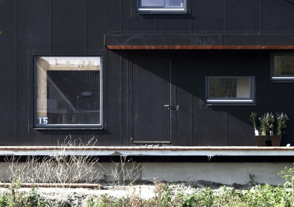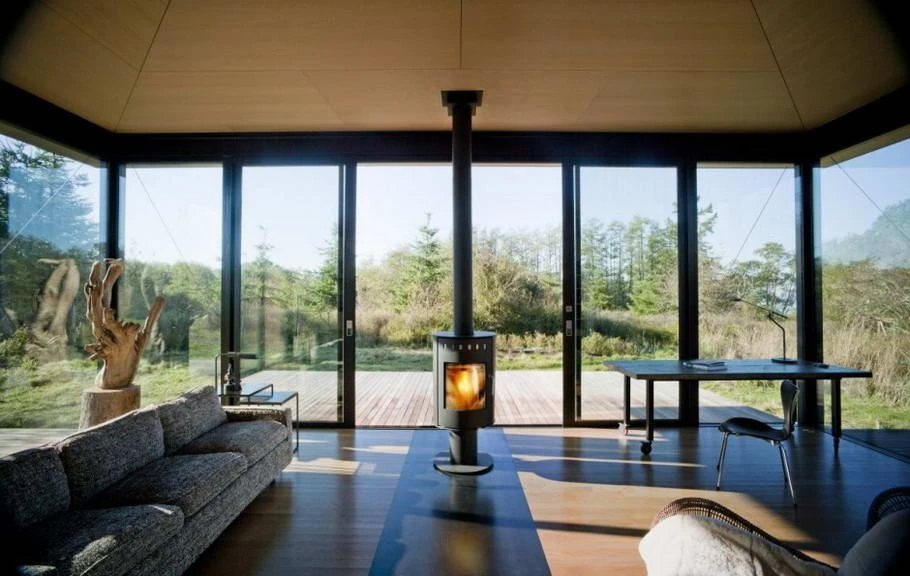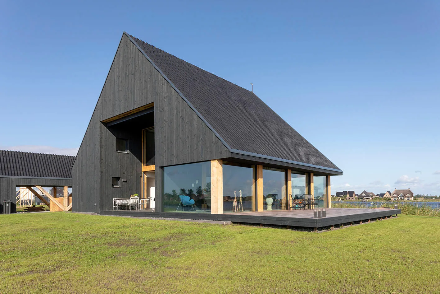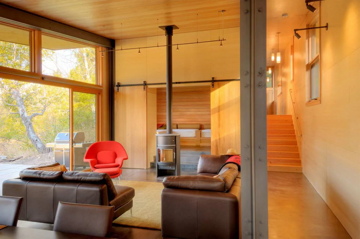 Как фасады, так и двускатная крыша покрыты черными крашеными досками. Интерьер этого дома в основном выполнен из дерева