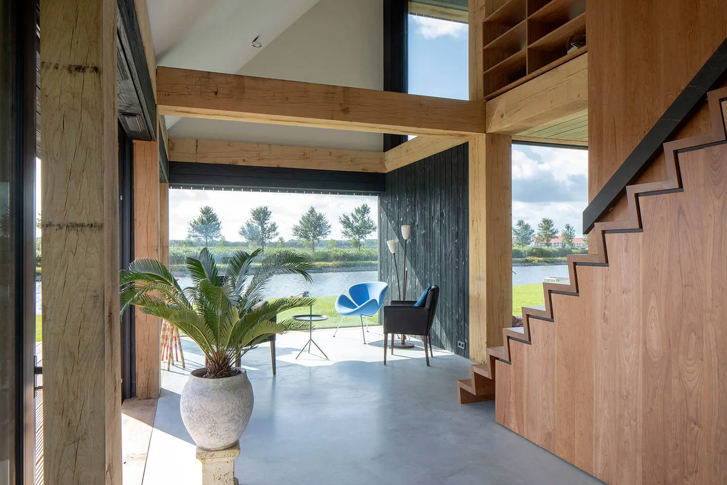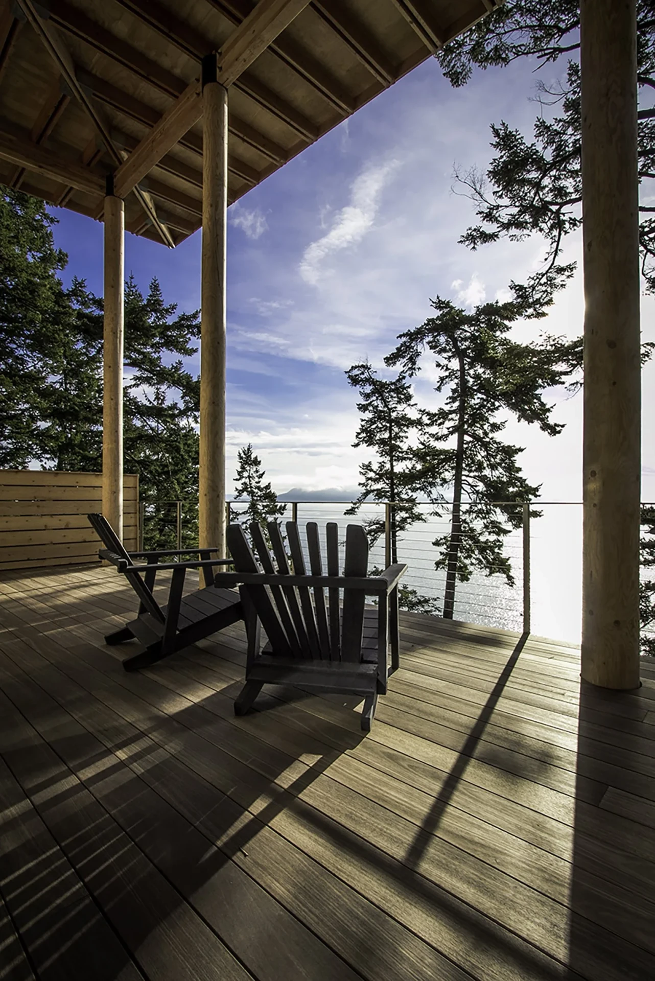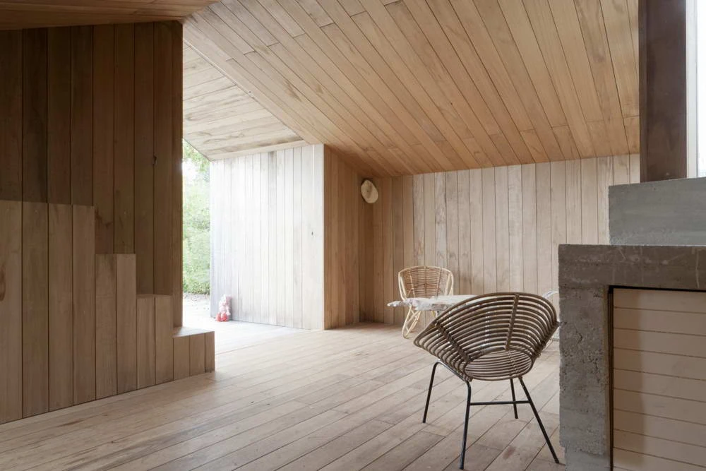 Этот компактный дом, расположенный на берегу озера, имеет просторную крытую веранду, которая выходит за пределы основного объема здания. Колонны и балки образуют промежуточную зону между внутренним пространством и внешним, регулируя освещение и использование пространства в зависимости от времени года.