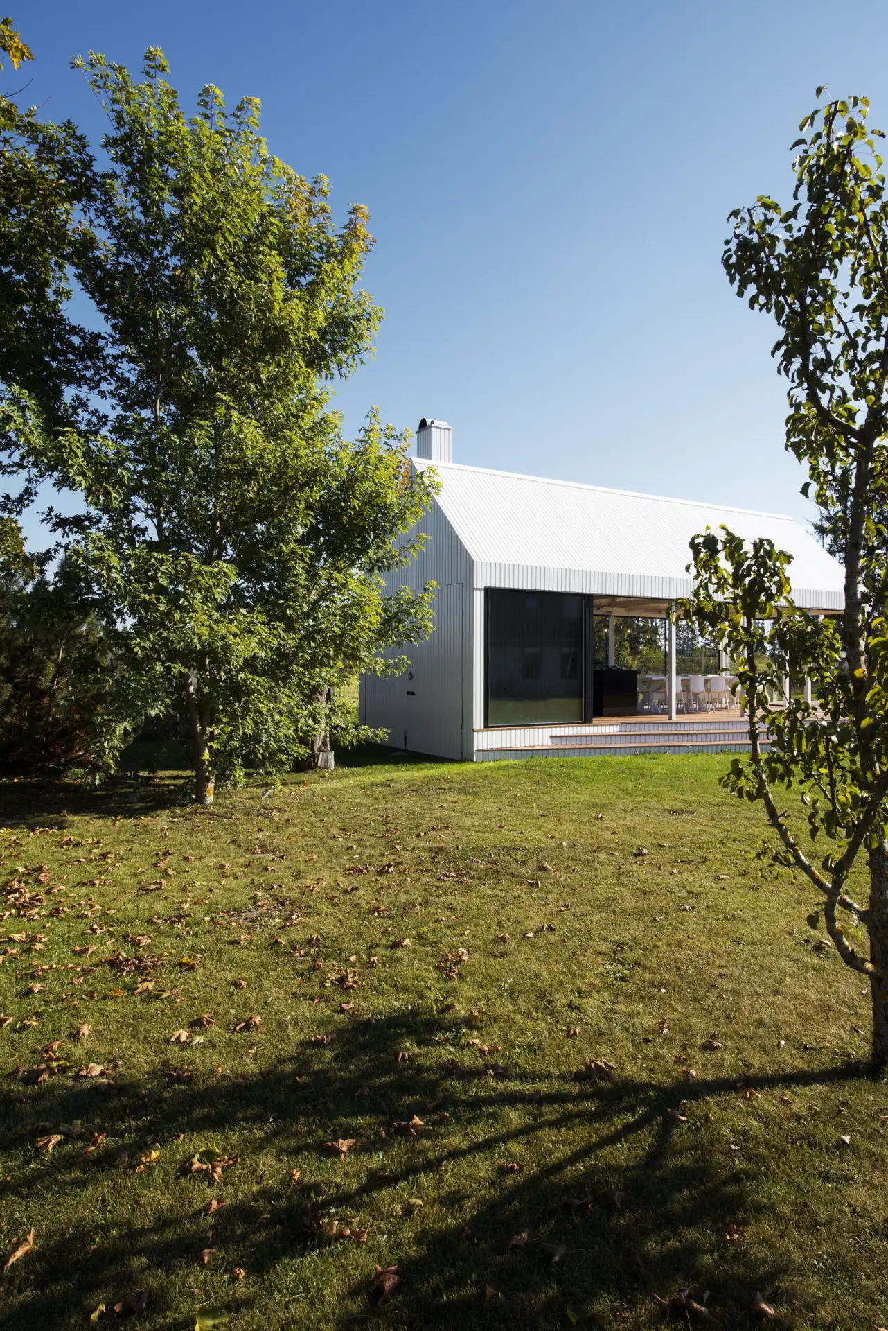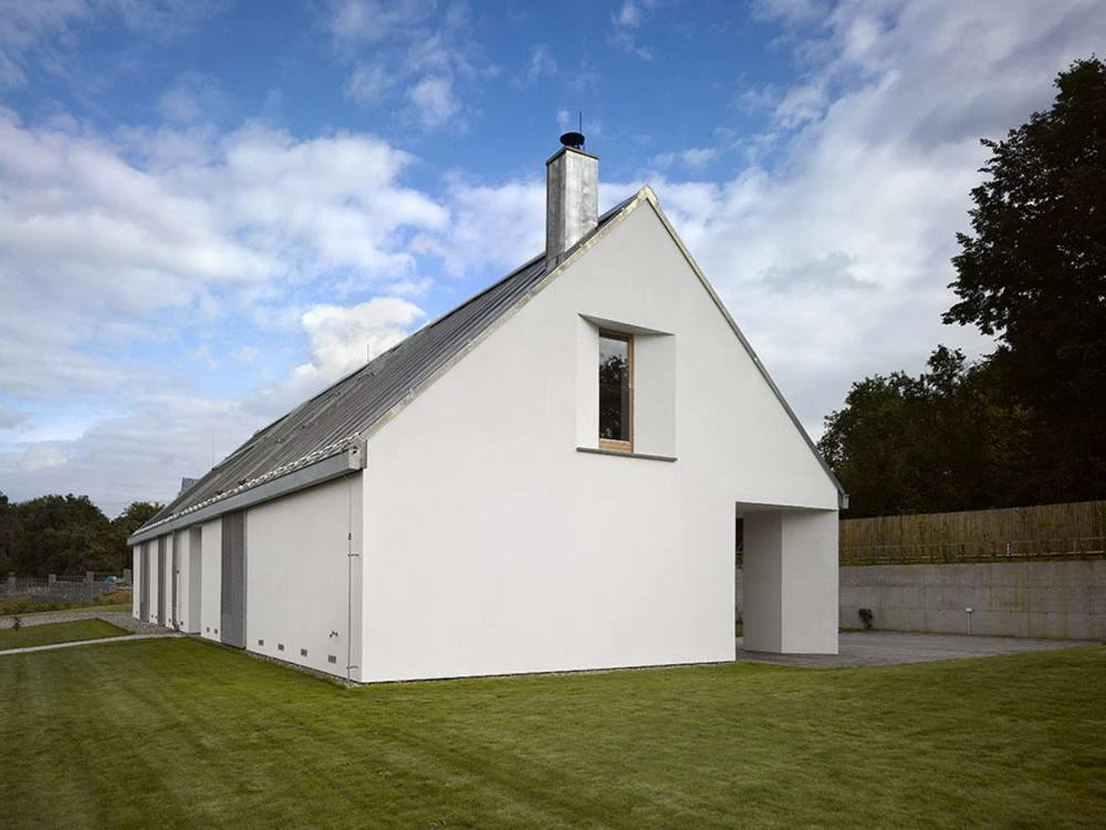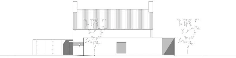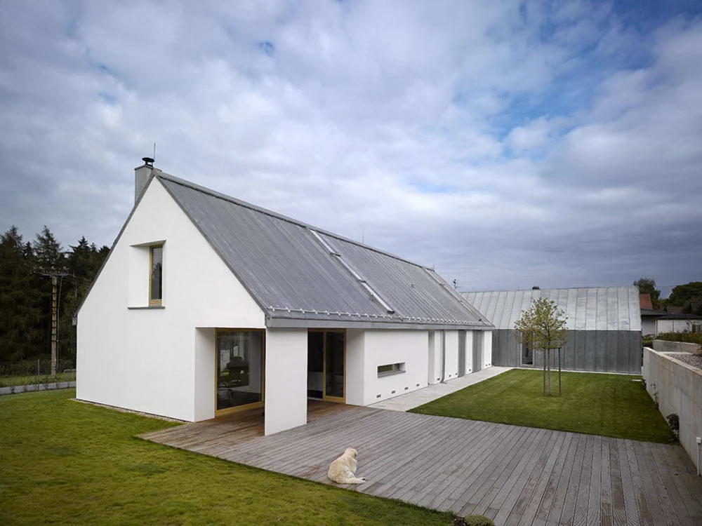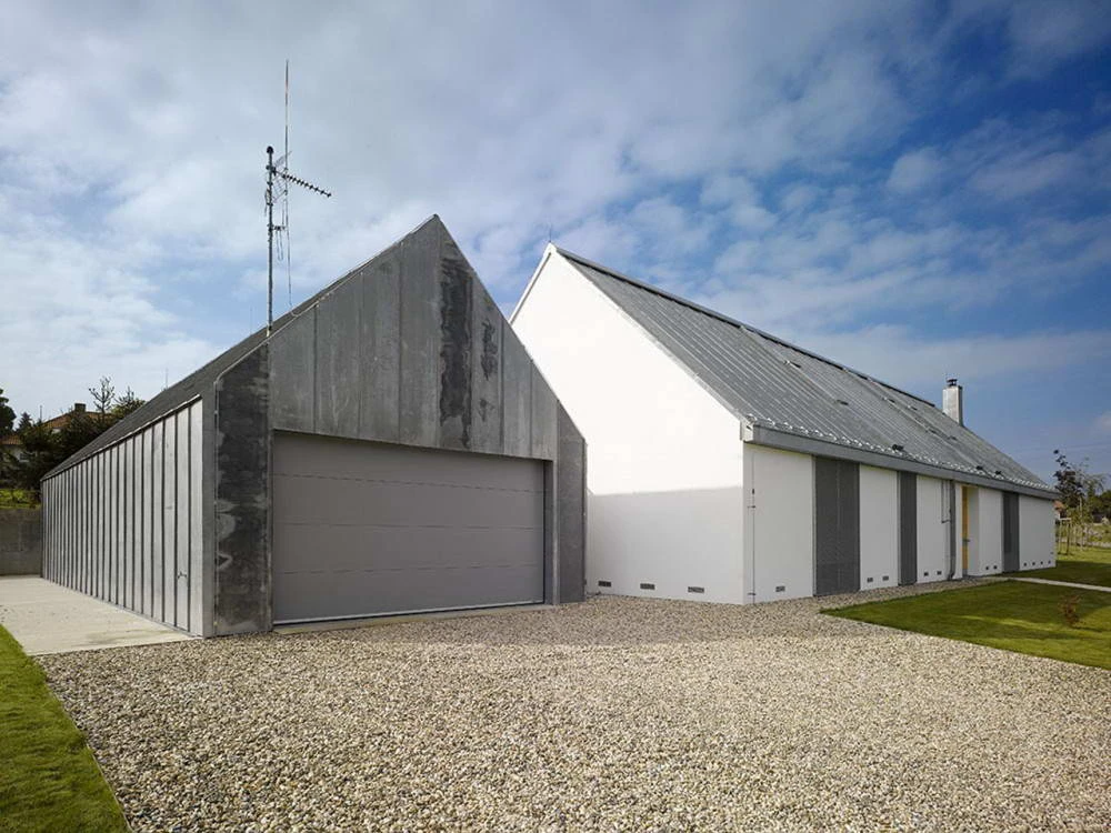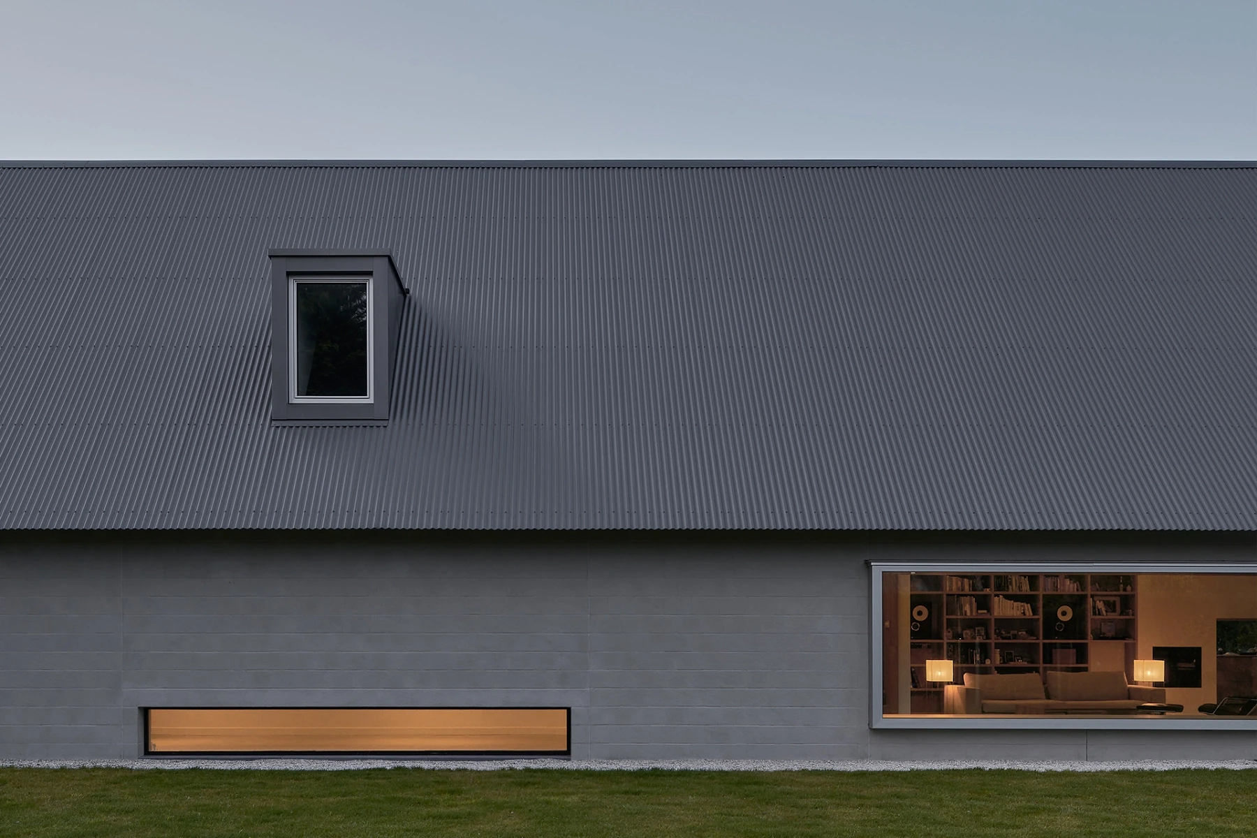 Дом практически скопировал образ существующего сарая, который тоже был обновлён и стал частью общей композиции. Два здания соединены друг с другом стеклянным переходом.