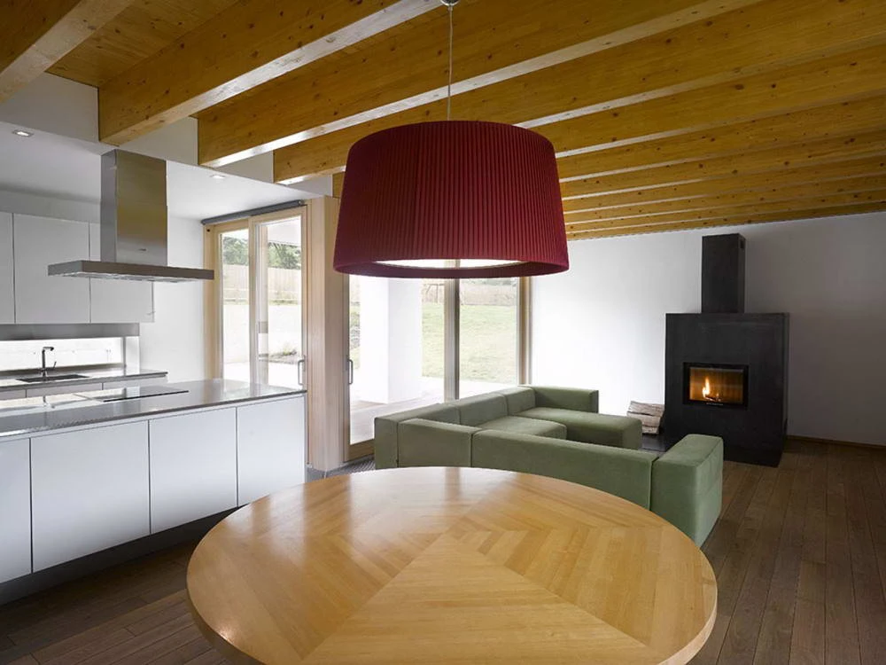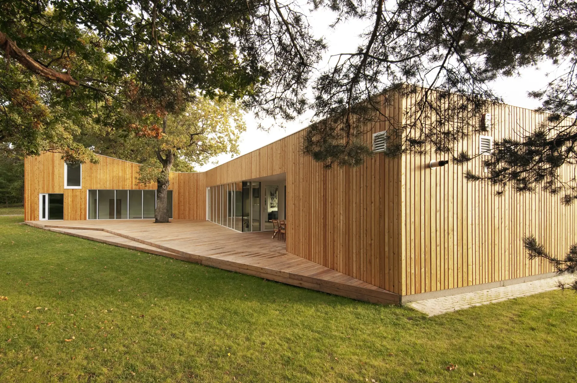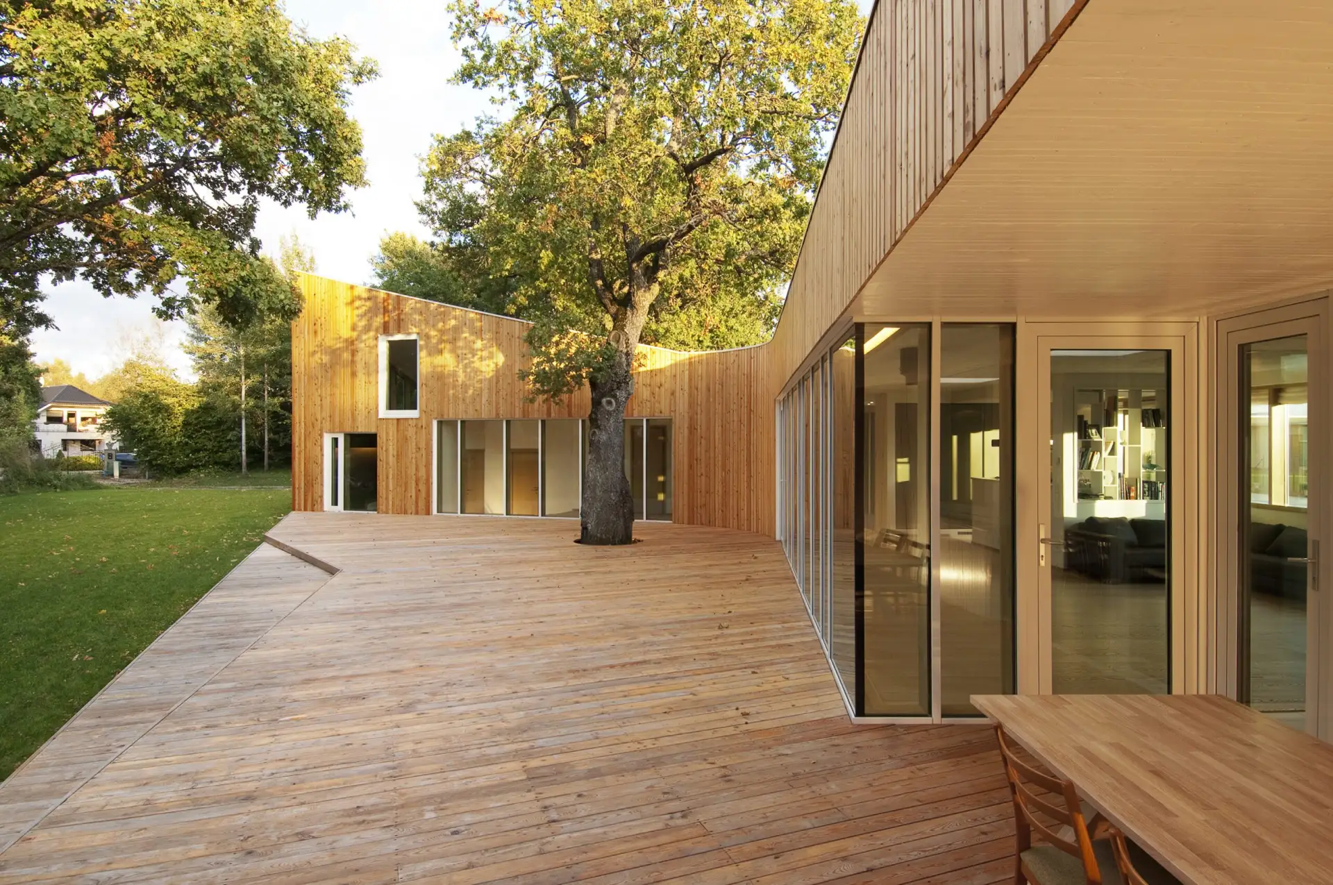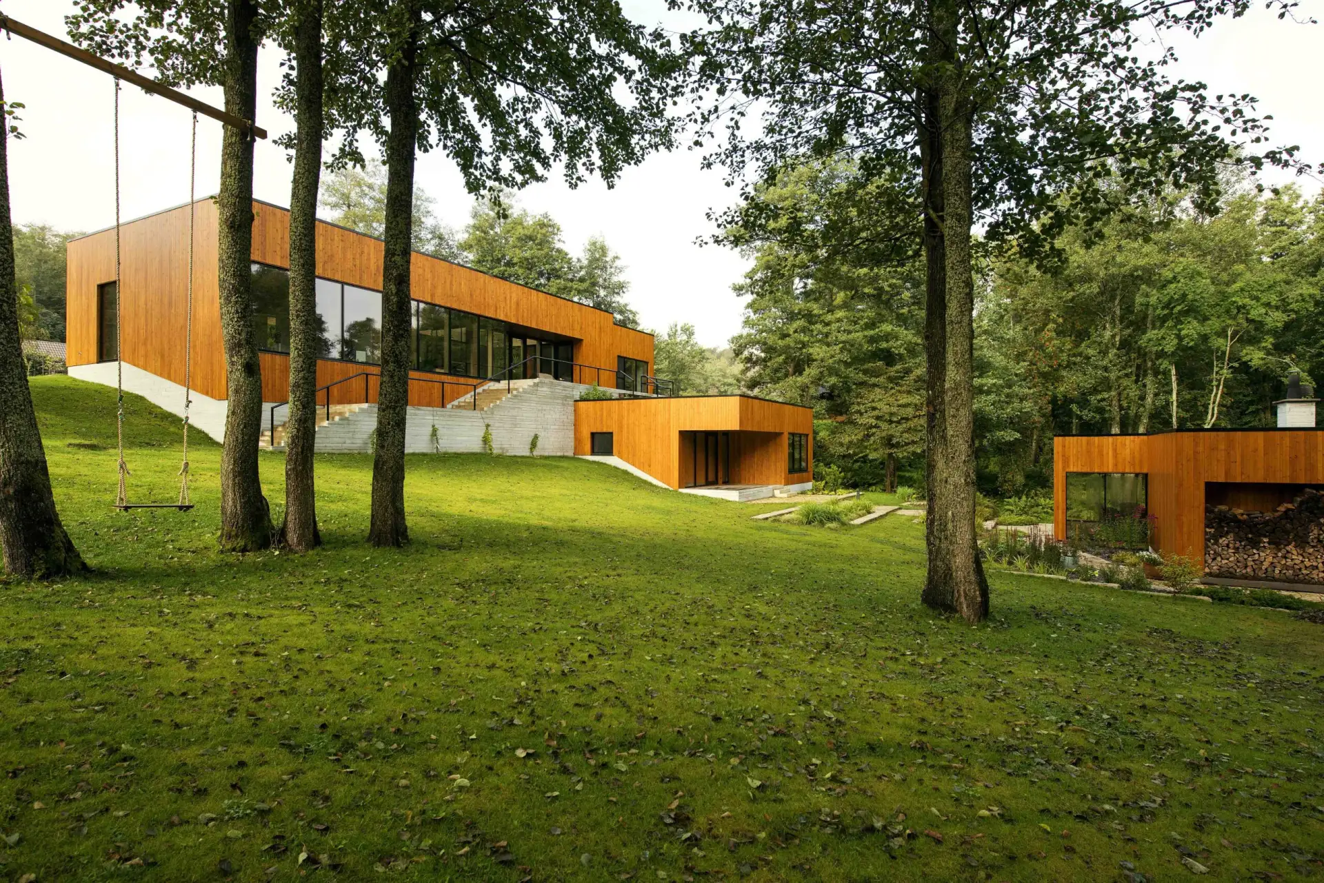 Здание небольшого объема, придающее L-образную форму дубу, чтобы следовать детальному плану с заранее определенным расположением. Жилой и спальный блоки очень четко расположены отдельно, средний - это главный вход. Семейный дом - из лиственницы.