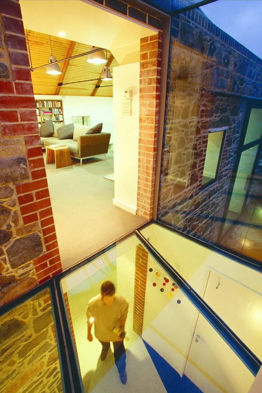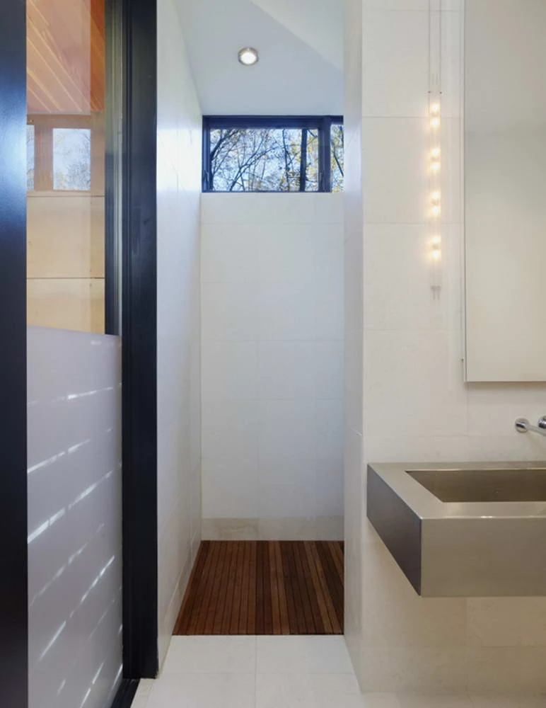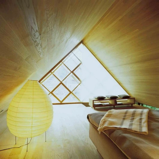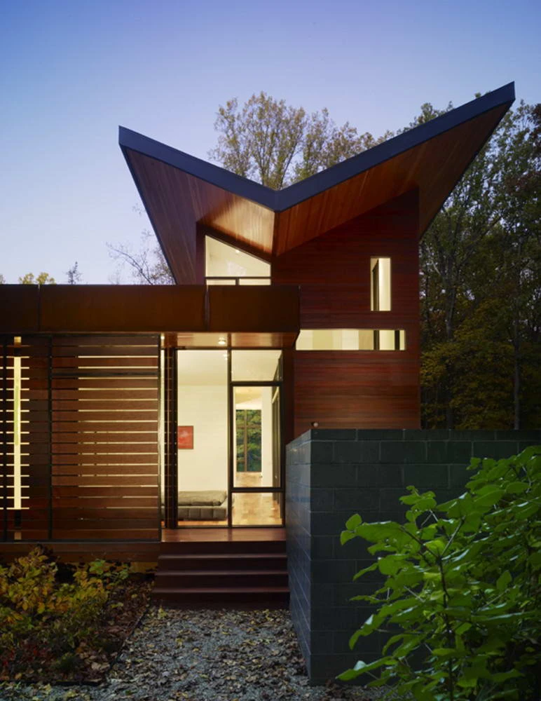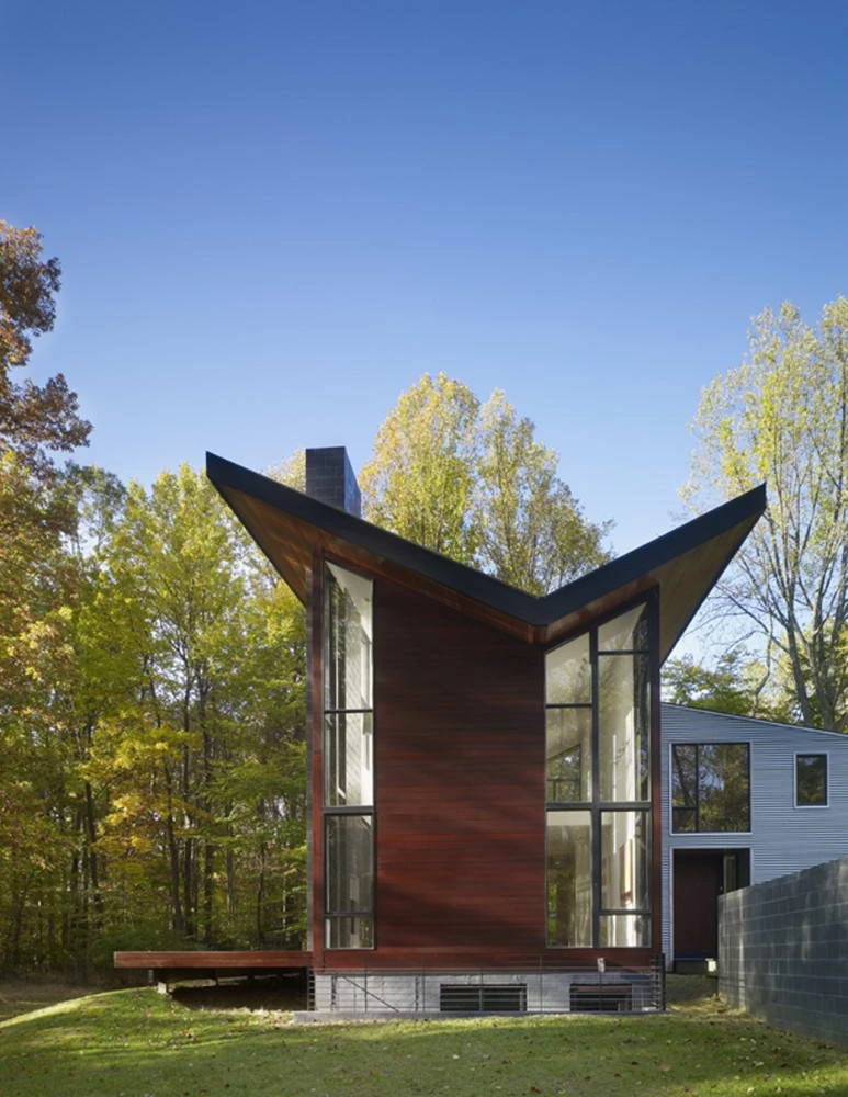 Фасад, расположенный в восточной части, представляет собой, по сути, всего лишь… стеклянную дверь в деревянной раме. Образованное северной и южной стенами V-образное помещение стало вестибюлем двойной высоты с лестницей, ванной и кухней.