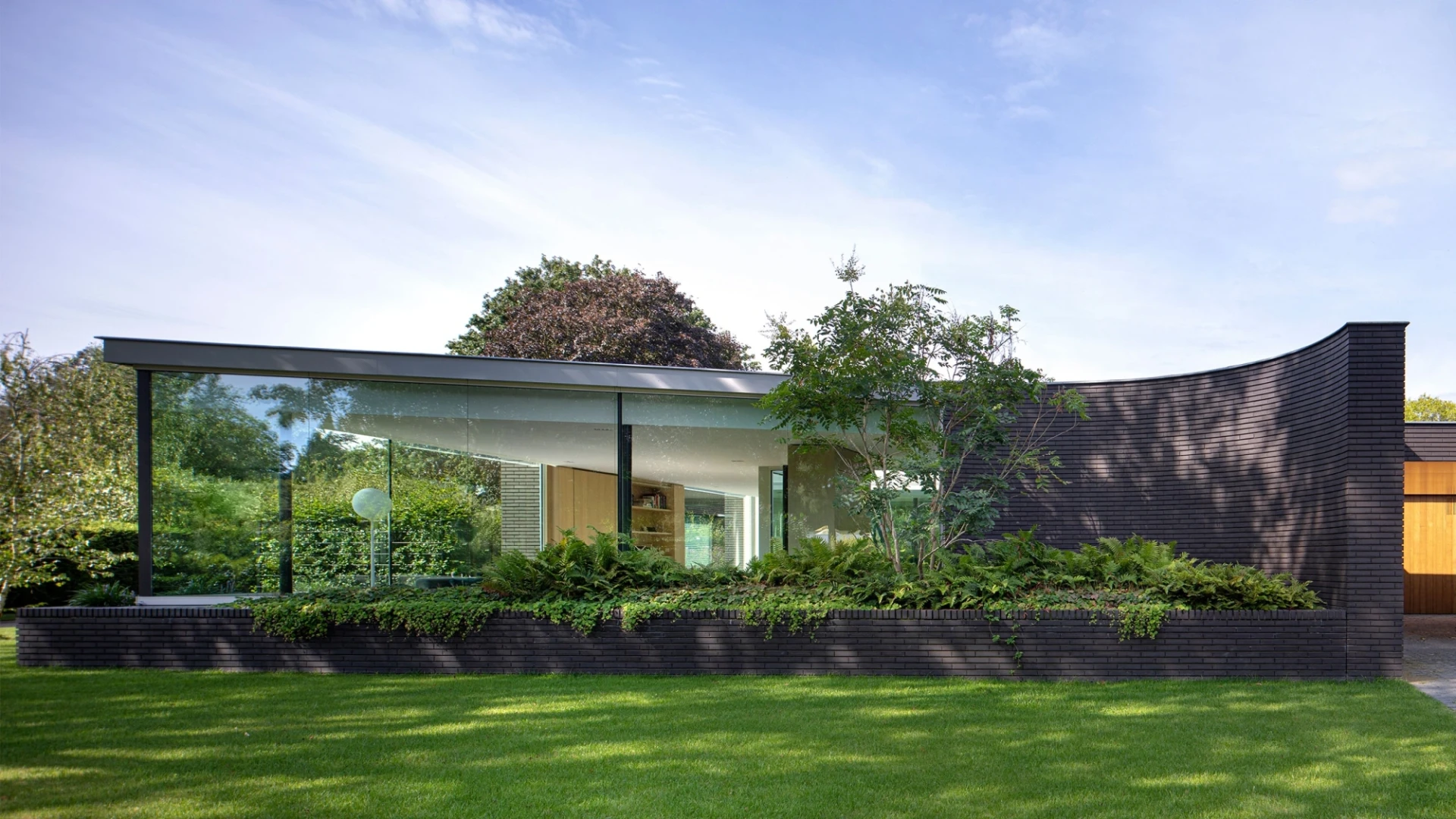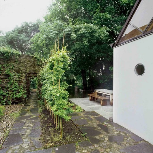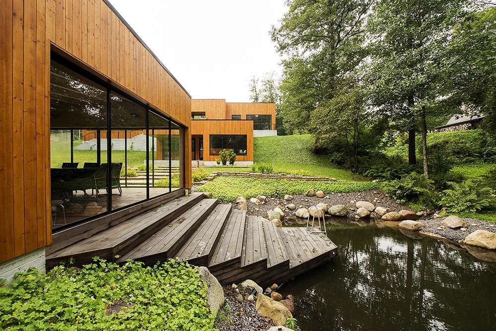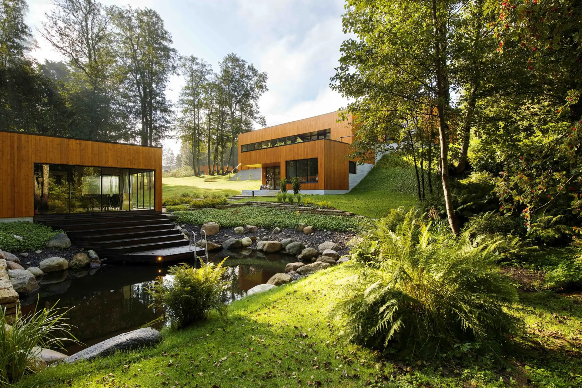 Прямоугольный дом стоит на склоне, его короткие стороны обращены к дороге и ручью, а длинные — перпендикулярны склону, благодаря чему образуются две просторные садовые зоны.
