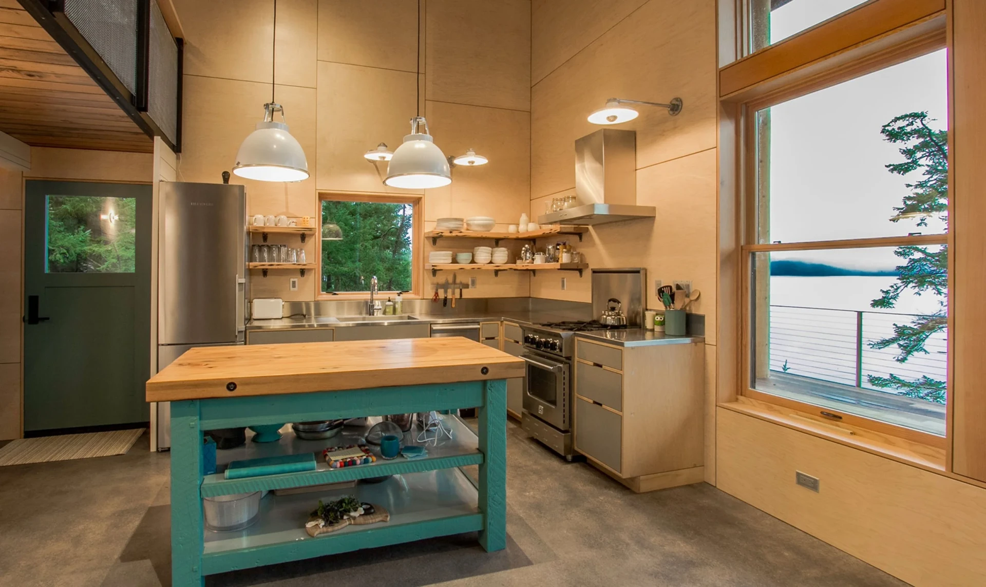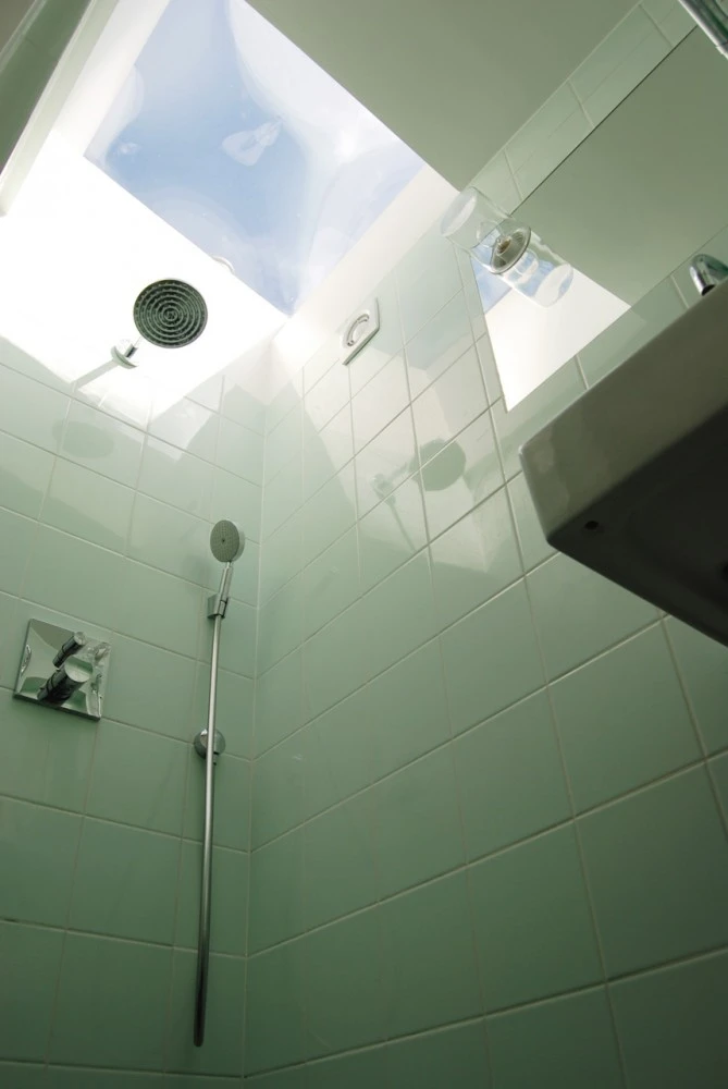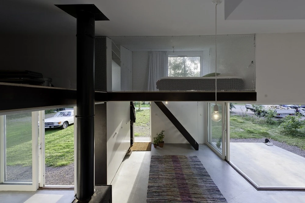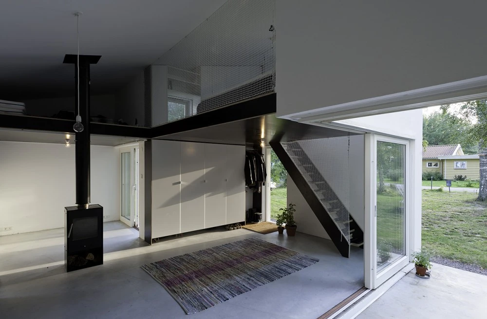 Спроектирован как дом-студия с мини-кухней, полноценной ванной комнатой и паровой сауной.