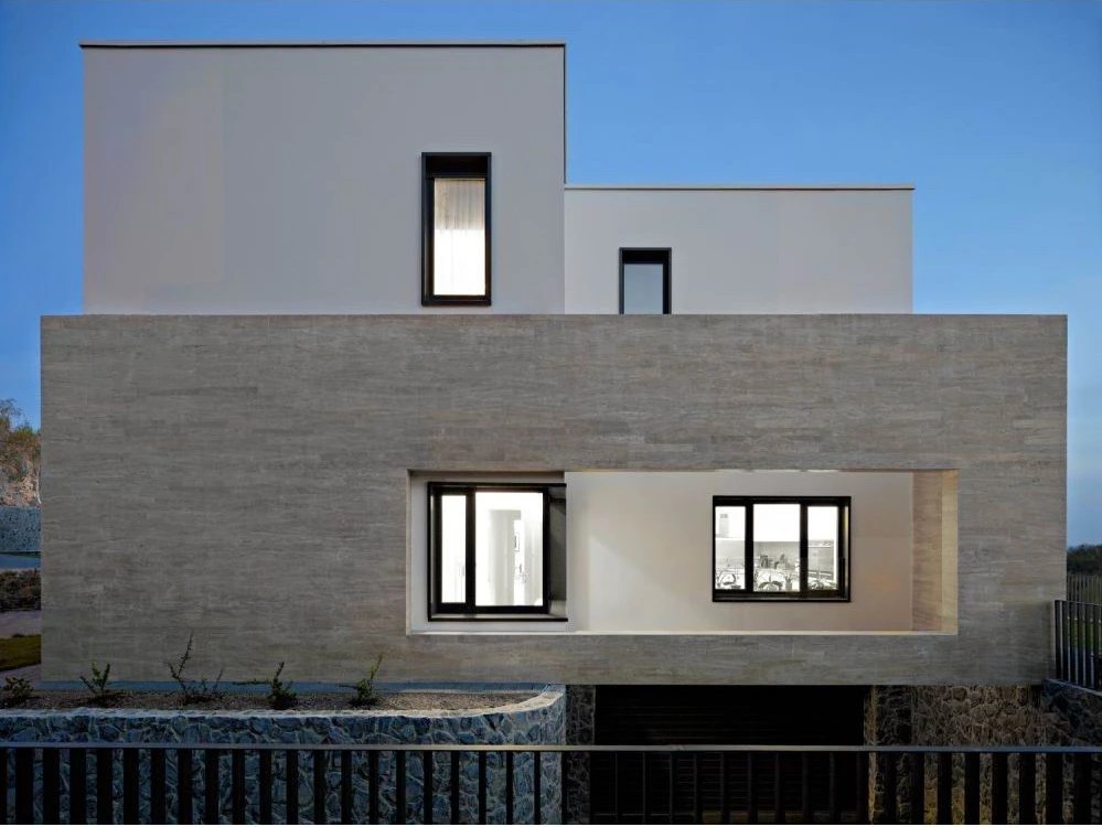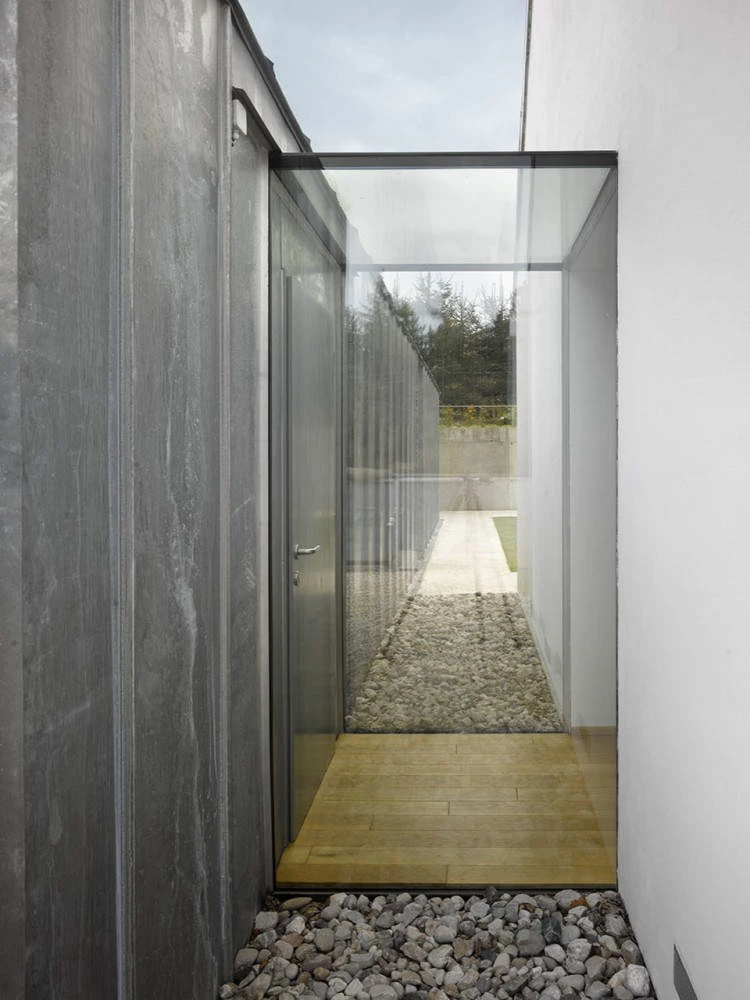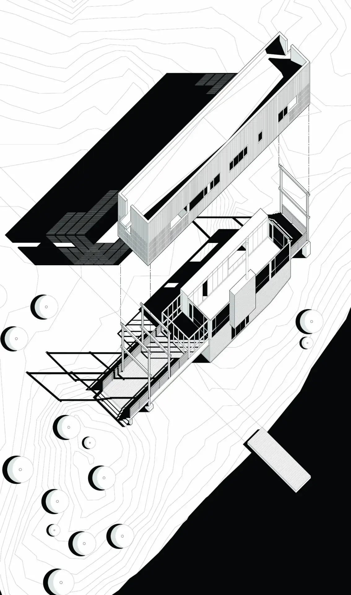 Этот семейный дом с четырьмя спальнями расположен между двумя скальными выходами, идущими параллельно озеру, и тем самым обрамляет подход к озеру с «брюха» скал. В дом можно попасть с обеих сторон, со стороны скал. Основная форма дома деконструирована таким образом, чтобы создать множество вариантов взаимодействия внутреннего и внешнего пространства.