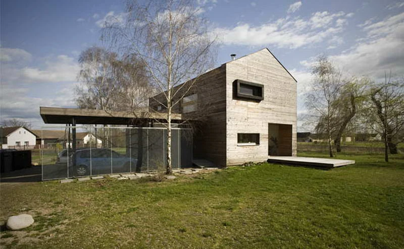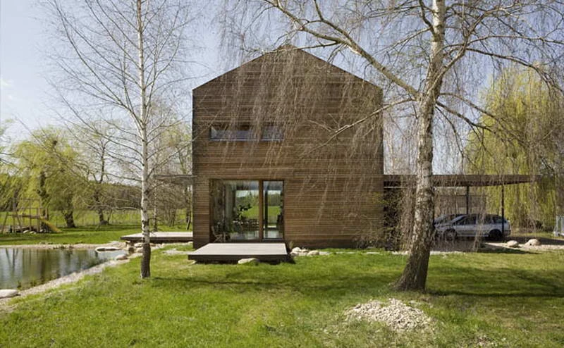 Дом по оси восток-запад открывается большими проёмами в направлении поселения, южной стороной — к небольшому декоративному пруду и полю, а с севера, являющегося тылом, устроена крытая стоянка для автомобиля.