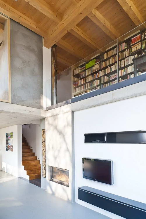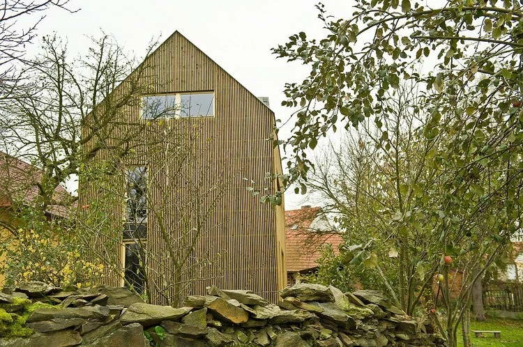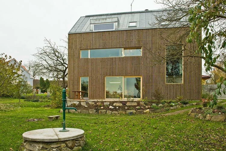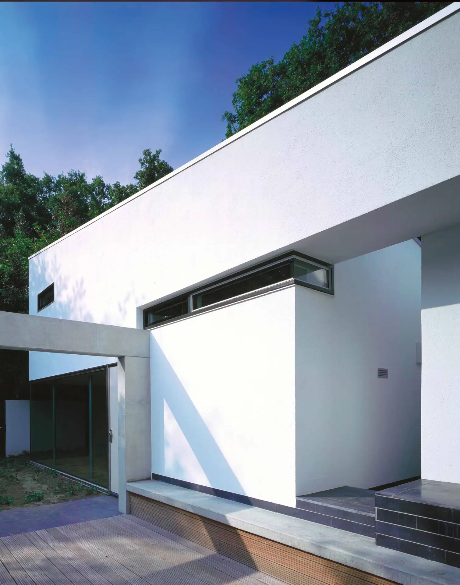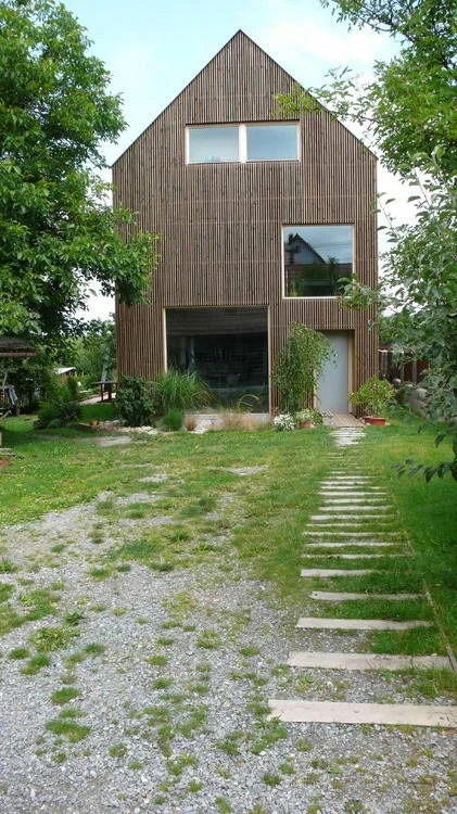 За счет последующего повышения уровня пола дома относительно уровня улицы под домом создается пространство для навеса для машины, которое муниципалитет не учитывает в объеме здания. Кроме того, поверхность крыши нового здания постепенно поднимается – незаметно с улицы, она не мешает фасаду. В пристройке с левой стороны u-образной формы крыша самая высокая и поднимается круче всего.