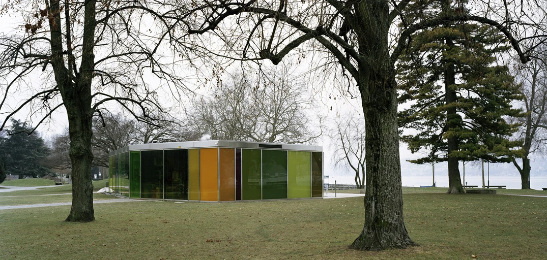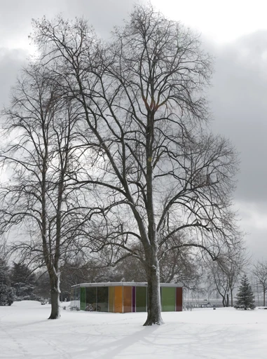 Отдельные панели окрашены и имеют разную степень прозрачности, что делает павильон светящимся в темное время суток и привлекает внимание гуляющих. Окраска придает павильону колорит и индивидуальность.