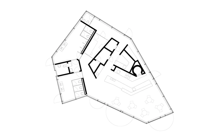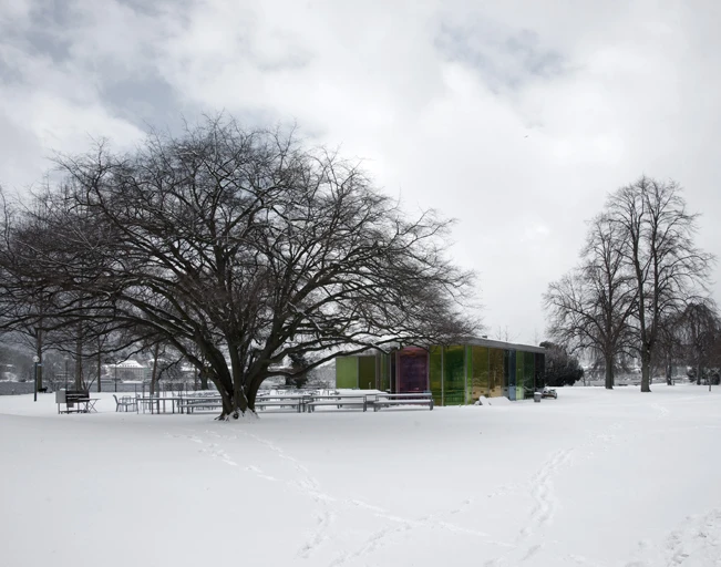 В кафе есть сквозная торговая зона, которую летом можно расширить. Входы в общественные туалеты отделены от помещений особой геометрией здания, что обеспечивает достаточный уровень социального контроля. Многогранный объем здания задуман не как элемент формального дизайна, а как рабочий материал, позволяющий гибко и ситуативно использовать пространство, программу и контекст.