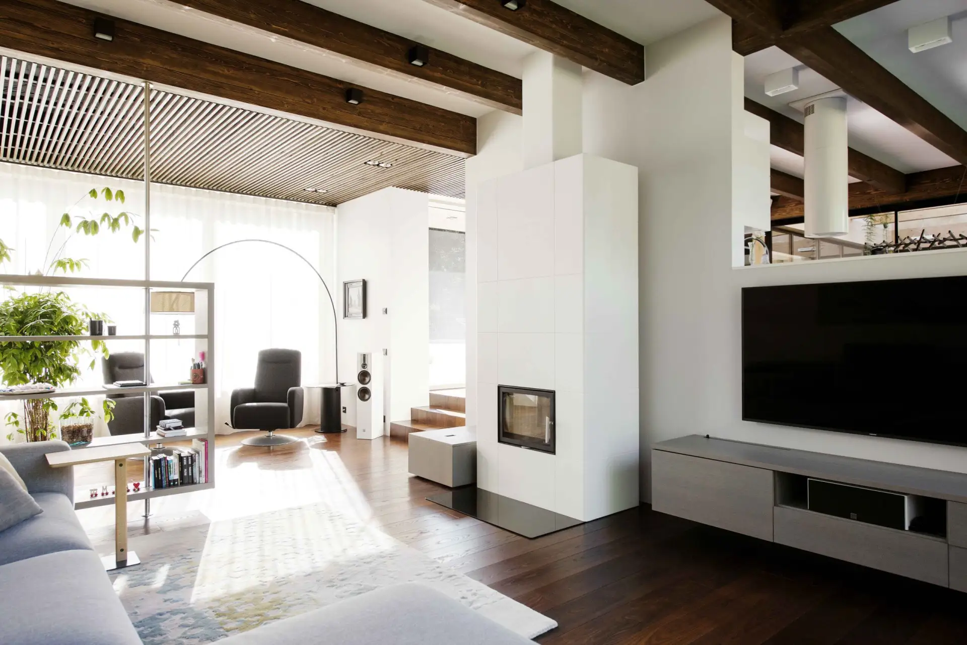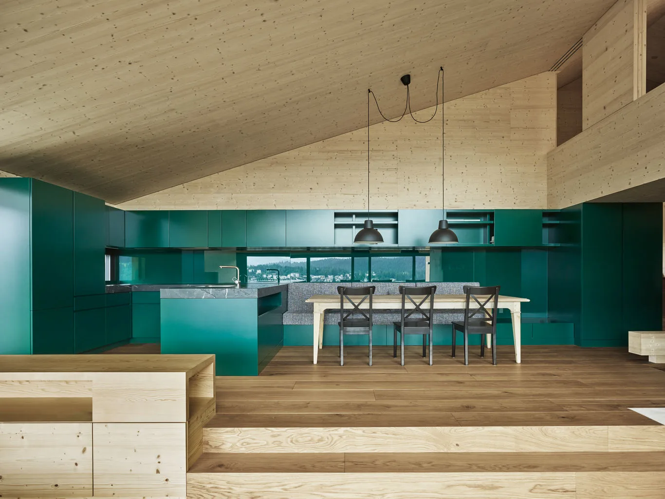 Из холла на жилой этаж ведет винтовая лестница. Мансардный этаж представляет собой единое пространство с кухней, выходящей на южную сторону, центральной обеденной зоной и гостиной с камином и великолепным видом на город. Атриум занимает треть общей площади и также представляет собой единое пространство, из которого открывается вид на город и лес.