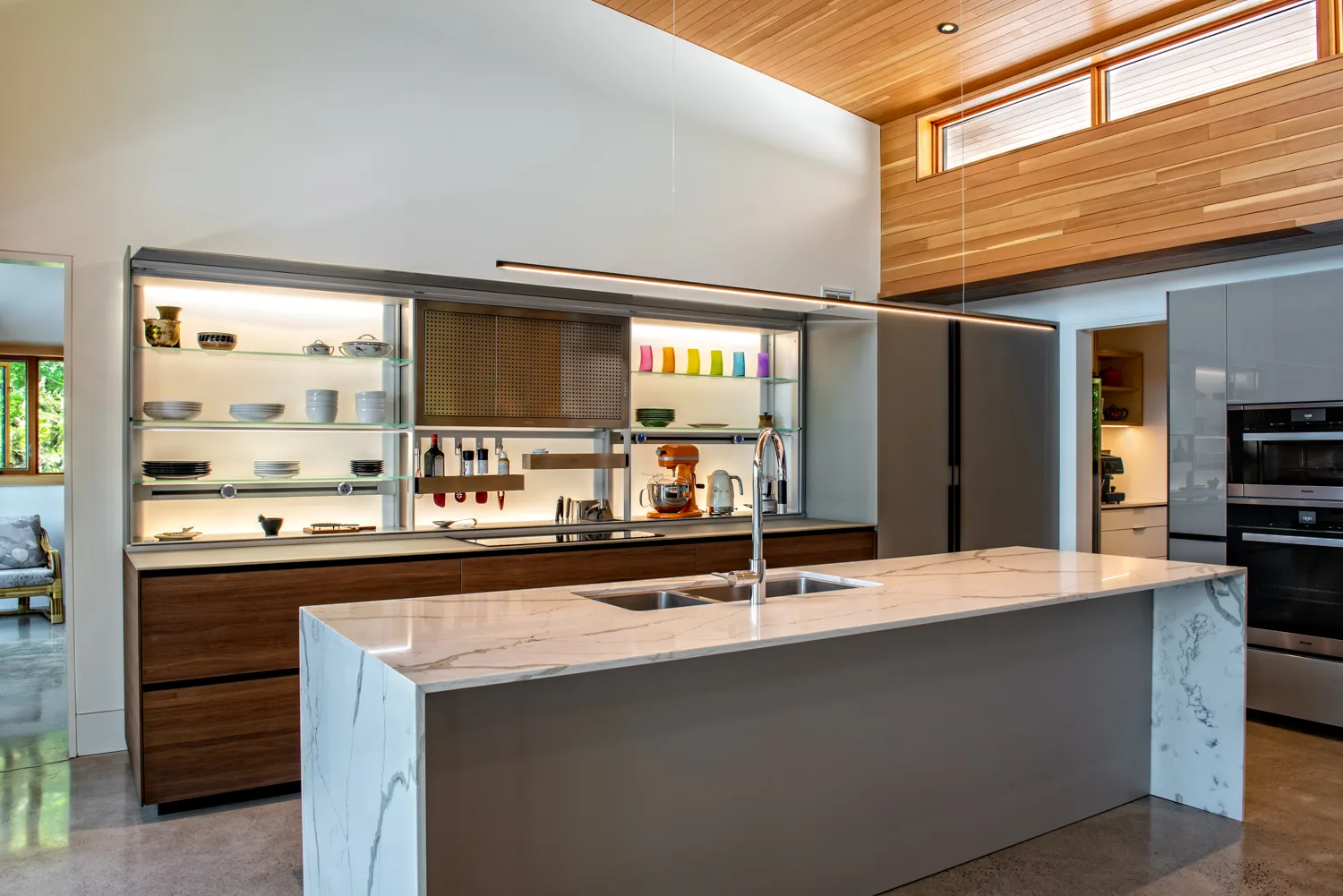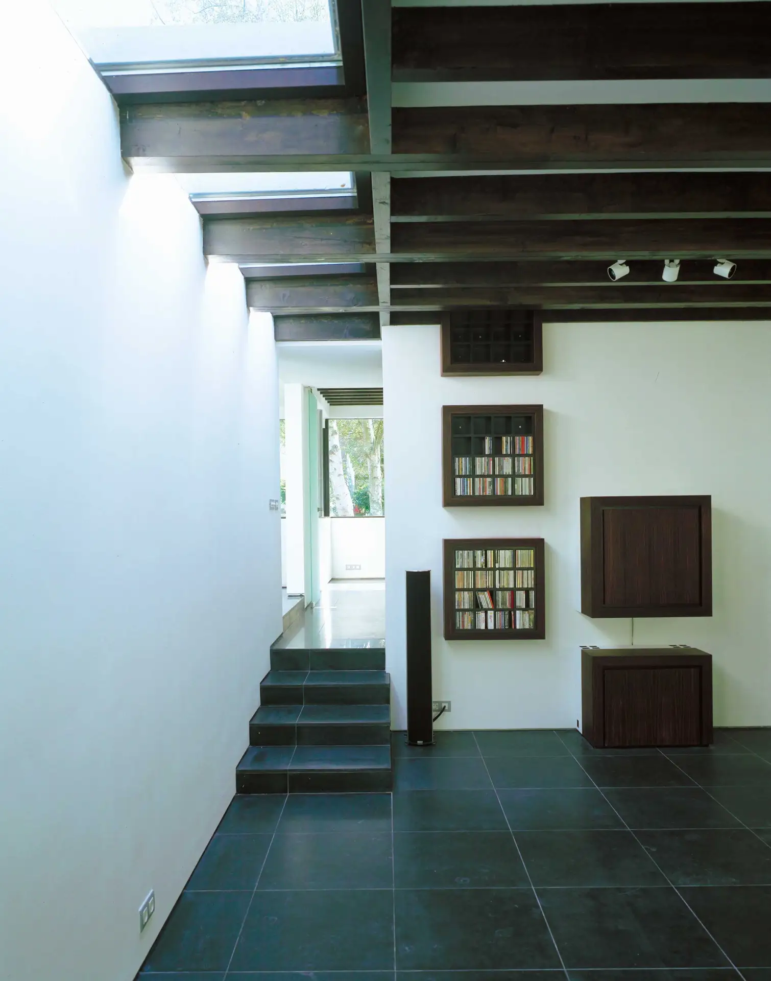 Кухня, столовая и гостиная расположены вокруг большого центрального зала, который, в свою очередь, выходит за пределы камина в зимний сад с раздвижными дверями в обе стороны.