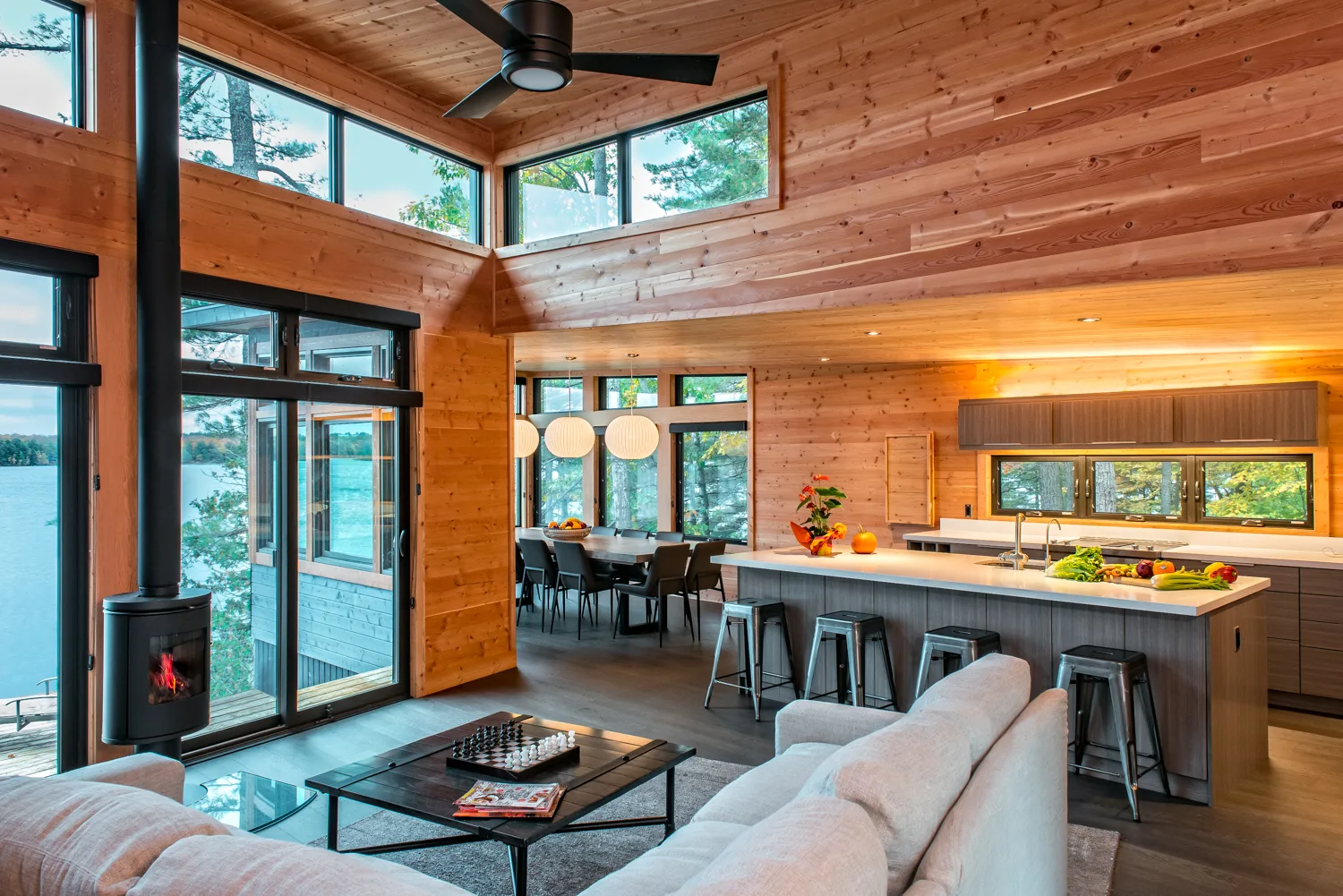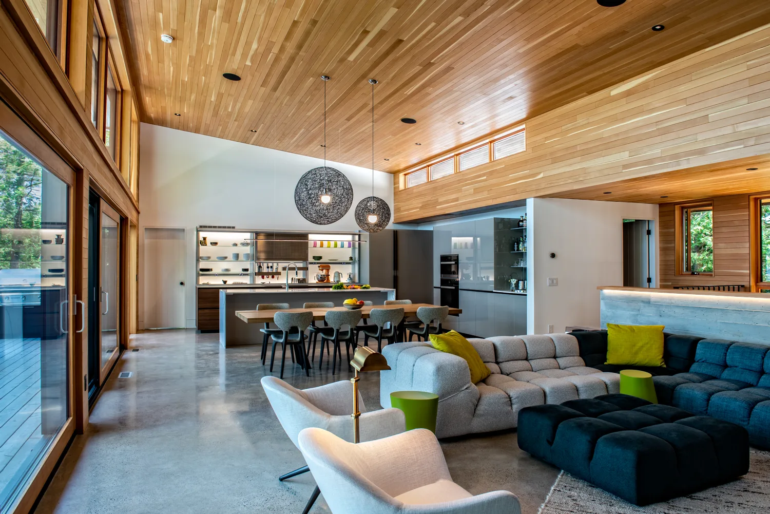 Большие окна в жилых помещениях позволяют единению с природой во всех направлениях. Большие навесы защищают дом от летнего солнца и сохраняют тепло и уют в коттедже круглый год.