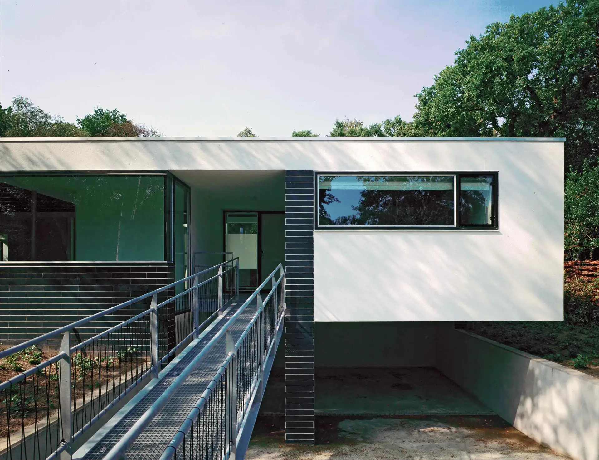 На крутом склоне стоит летний домик. Двенадцать стальных опор поднимают дом над землёй и устанавливают его на одном уровне с верхушками окружающих его деревьев, создавая впечатление, что он парит среди листвы. Такое расположение на возвышенности улучшает обзор и позволяет отгородиться от соседней улицы.