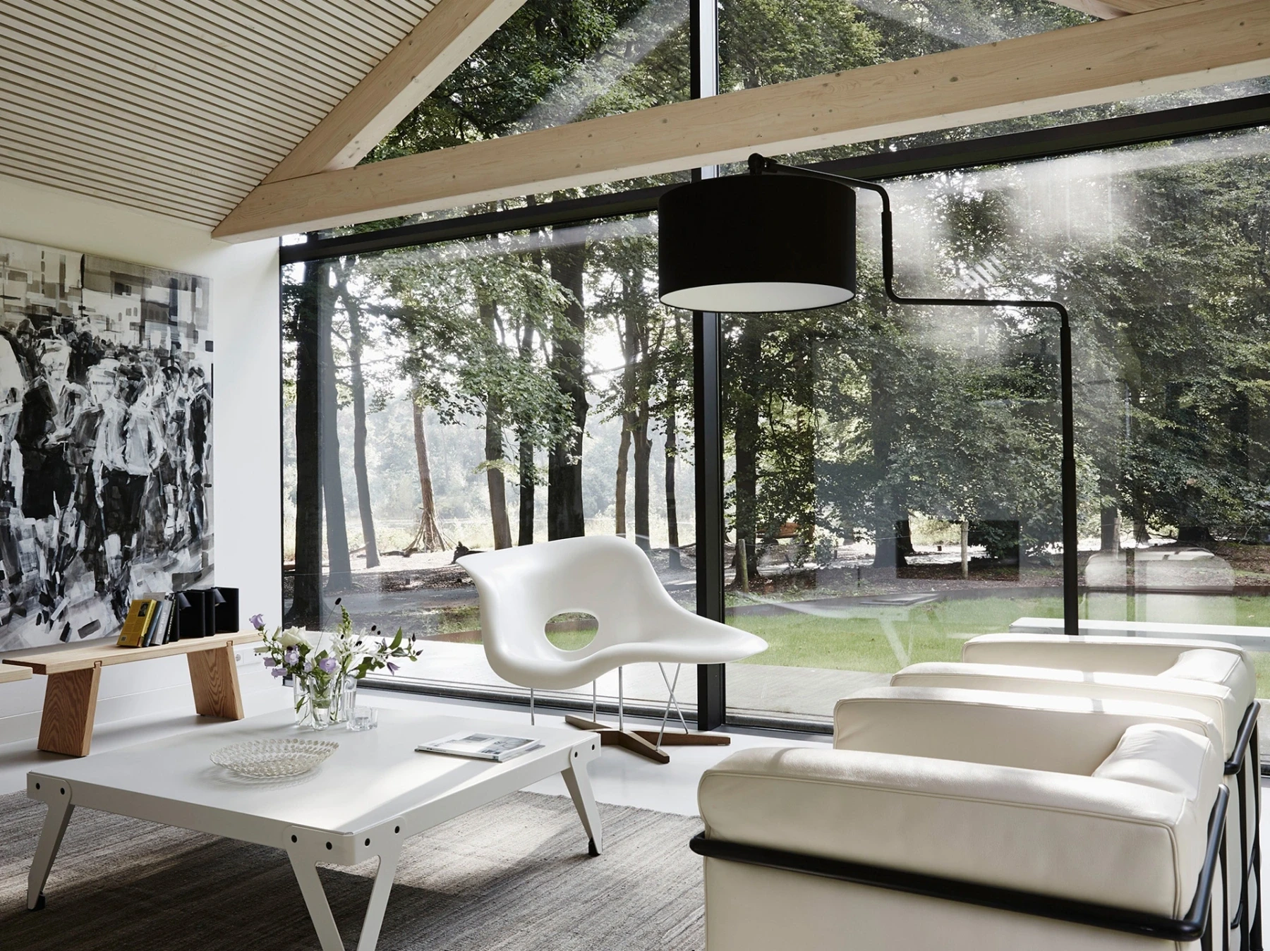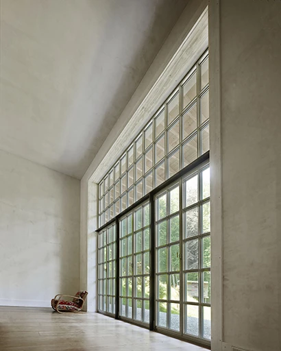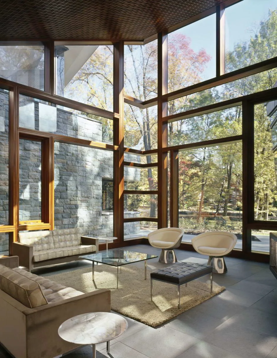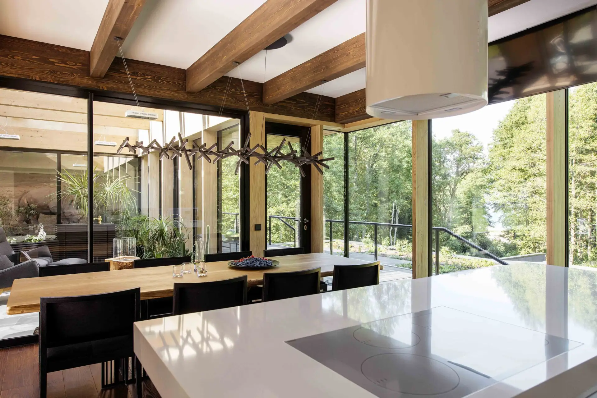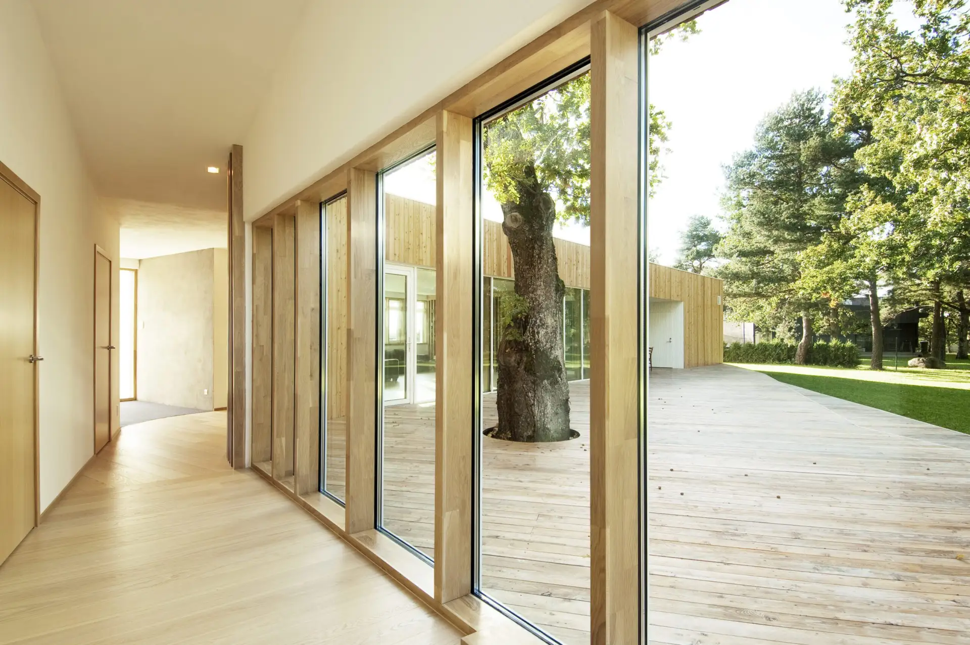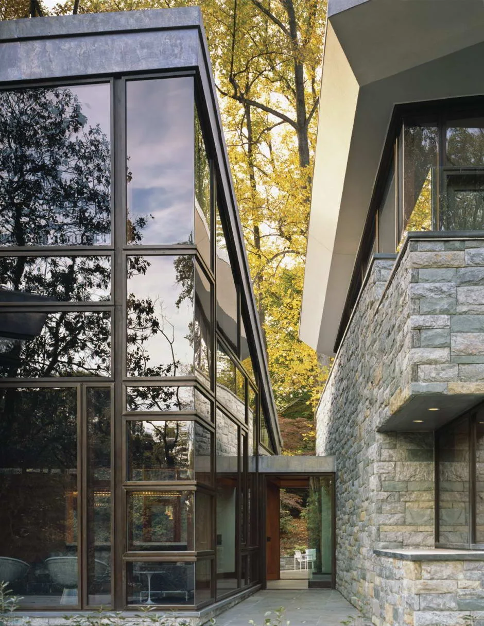 Панорамные окна-витражи во всех трёх объёмах размывают грань между внутренним и внешним пространством, запускают природу вовнутрь и обеспечивают хорошие виды из всех помещений.