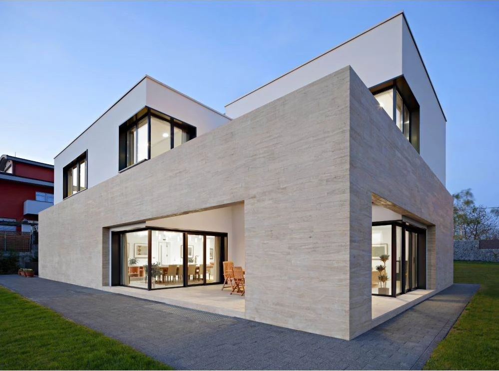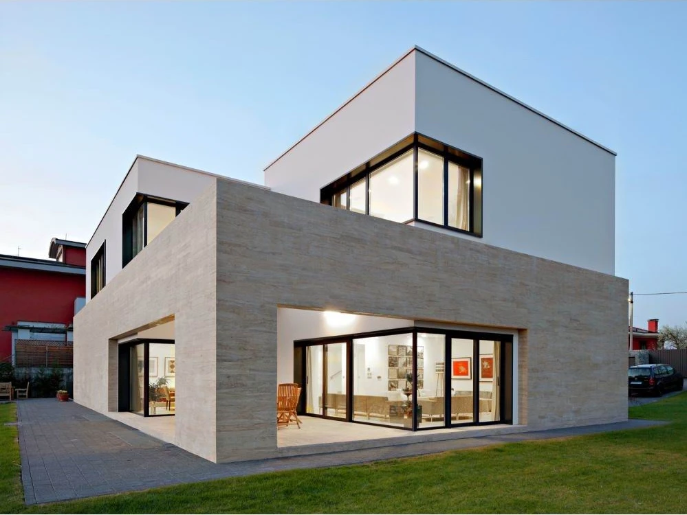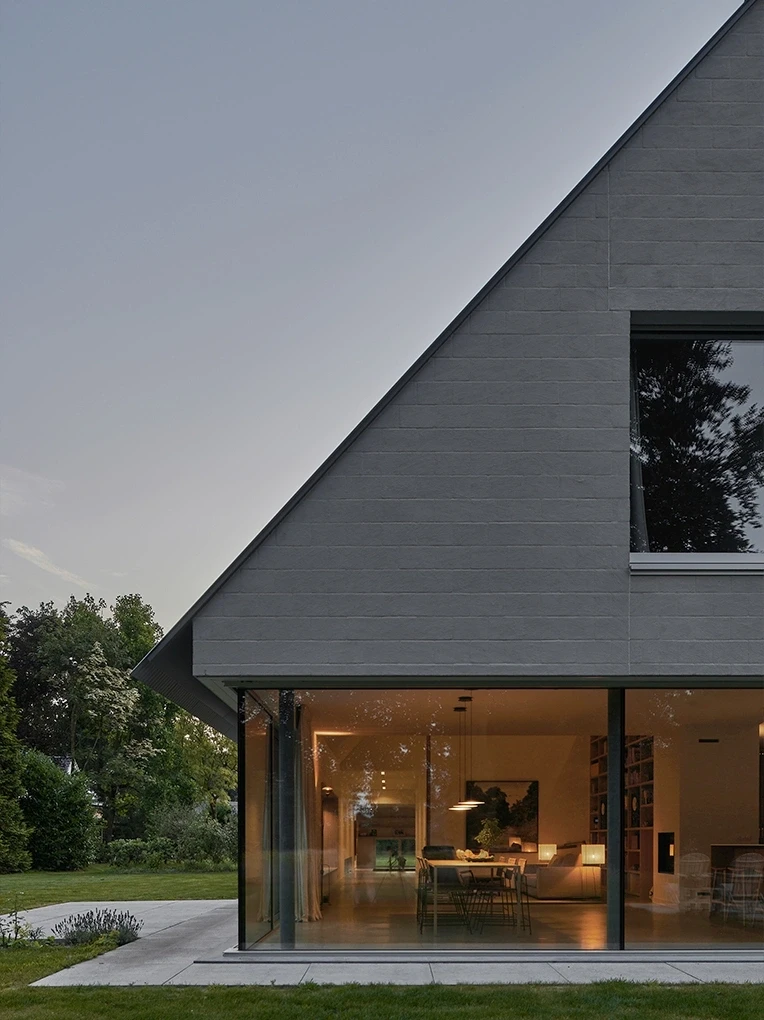 Дом состоит из двух объёмов, соединённых между собой стеклянным переходом.