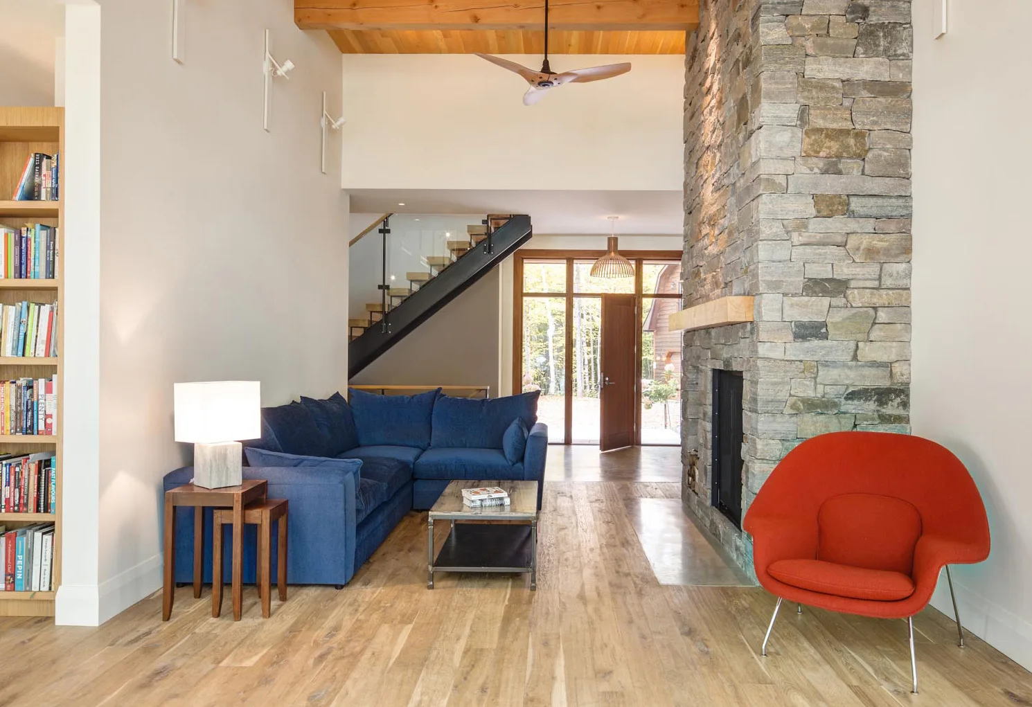 В центре коттеджа расположен большой каменный камин, построенный из необработанного природного гранита — без отделки, сложенный из булыжников и поддерживаемый большой натуральной перемычкой. Рядом с камином находится широкая топка, где можно посидеть и согреться.