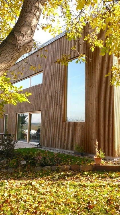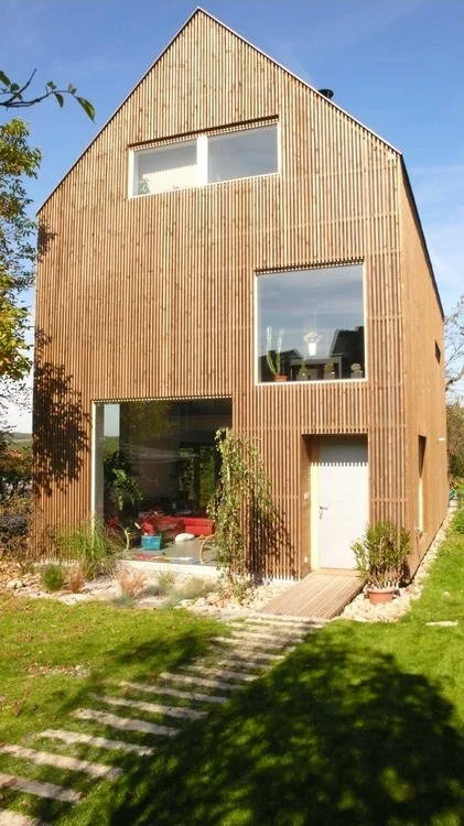 Фасады дома облицованы вертикальными панелями с индивидуальным профилем, которые, как и деревянная терраса и пергола, изготовлены из сибирской лиственницы, обработанной герметиком на основе силикона. Крыша покрыта панелями внахлест, также из сибирской лиственницы, обработанной герметиком на основе силикона.