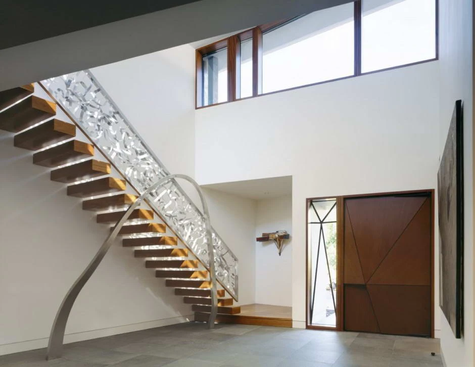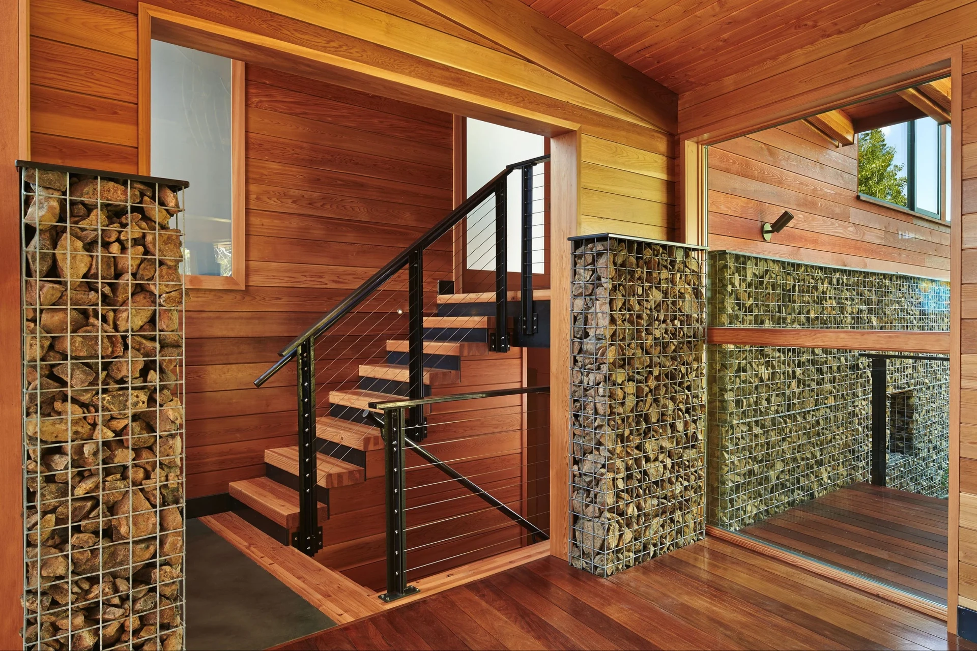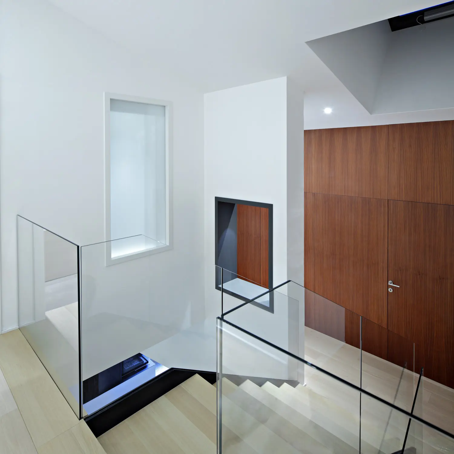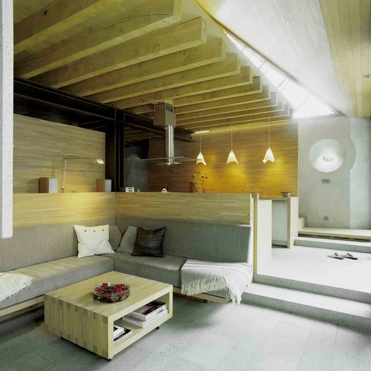 В центре дома находится лестница, соединяющая все три этажа. Внутри дома, следуя рельефу местности, используются разноуровневые пространства, что создает пространственное разнообразие.