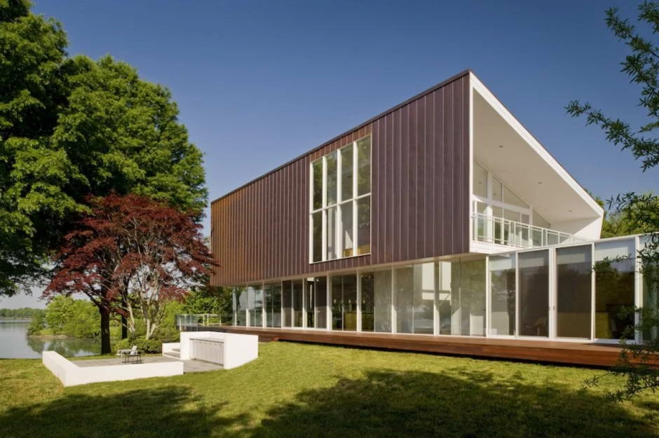 Вытянутый в плане дом расположился на плавном склоне узкой, полностью остеклённой стороной к озеру.