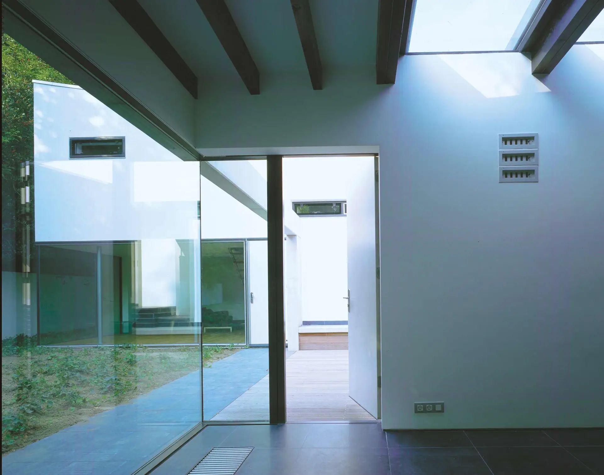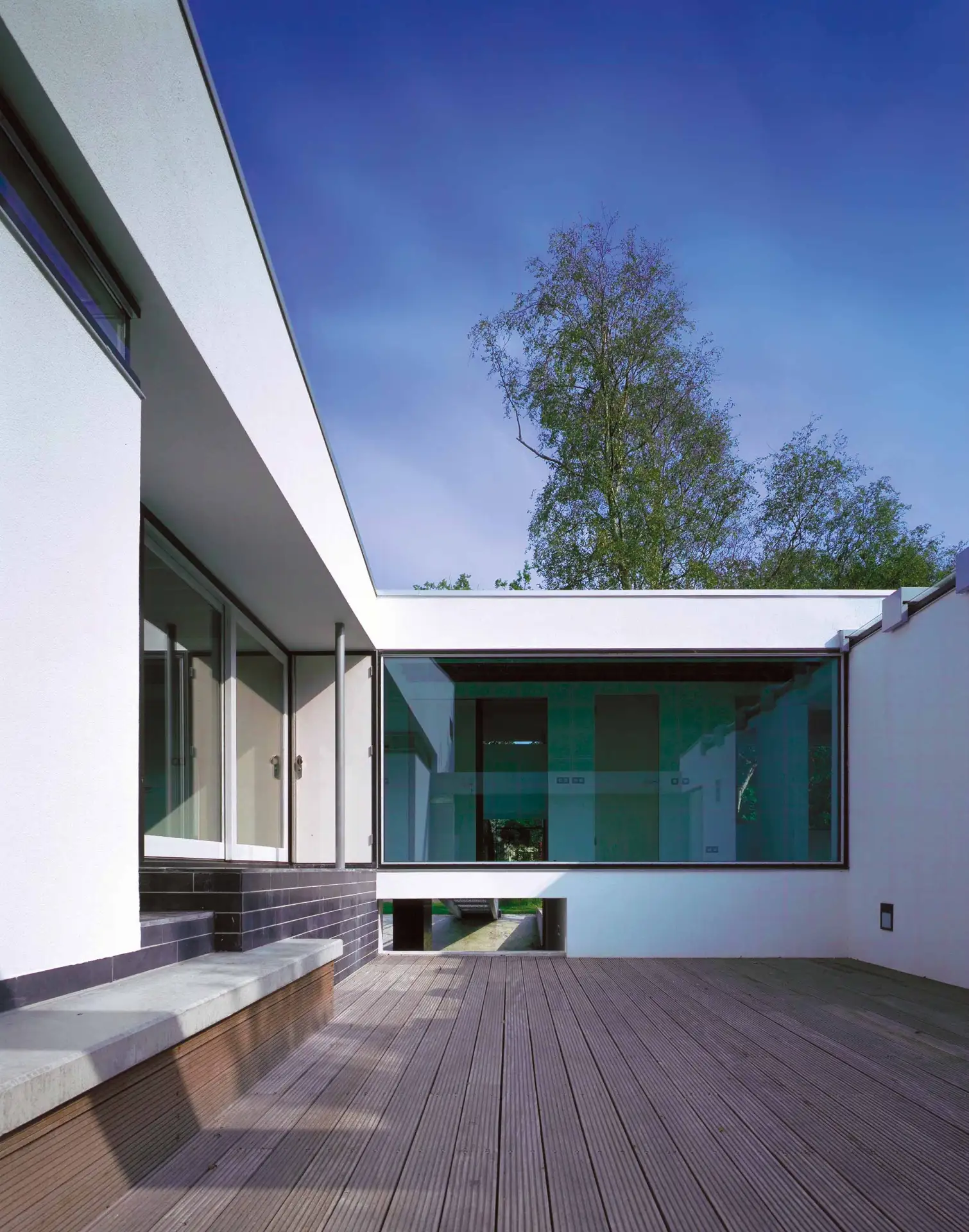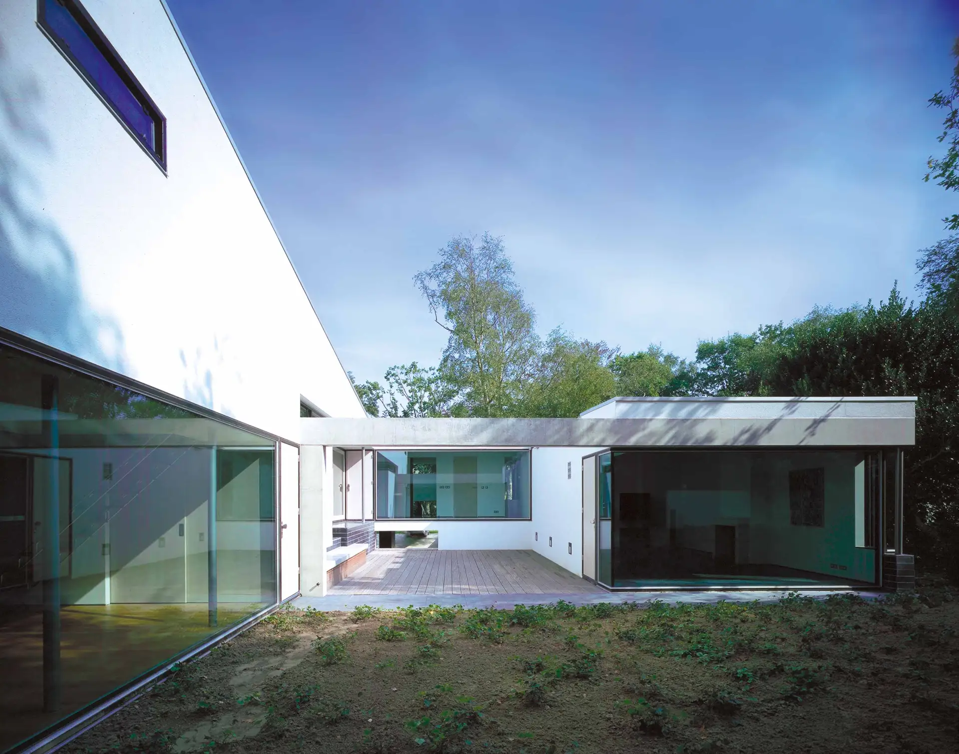 Благодаря своей форме и расположению на участке дом разграничивает три отдельных садовых пространства, каждое из которых имеет свой характер. На восточной стороне, куда попадает утреннее солнце, находится внутренний дворик, соединяющий кухню и гостиную. На западном фасаде расположены зоны для отдыха, общения и приёма пищи.