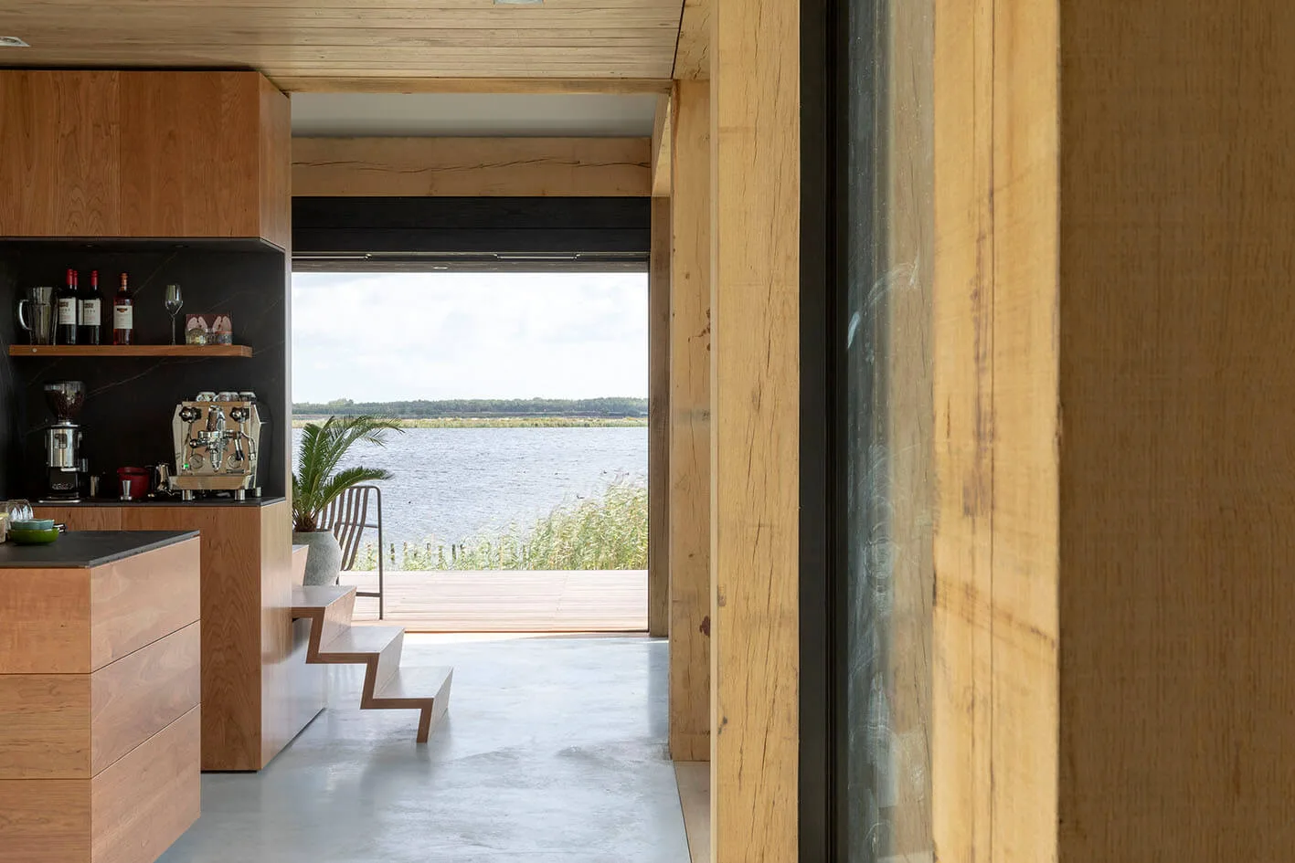 Возвышенность участка обеспечивает жителям беспрепятственный вид на заросли камыша на воде. Дом прозрачен по отношению к воде.