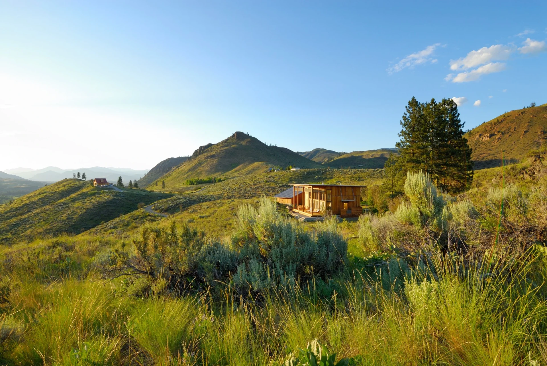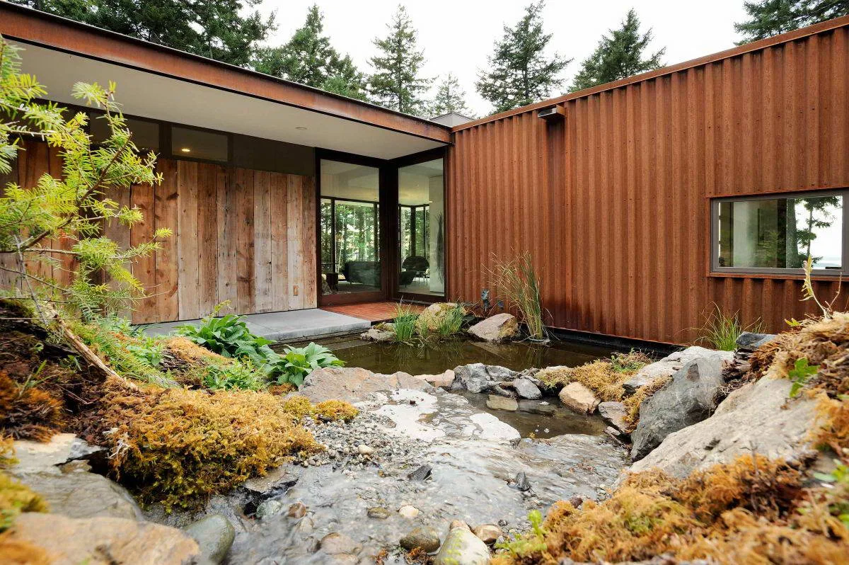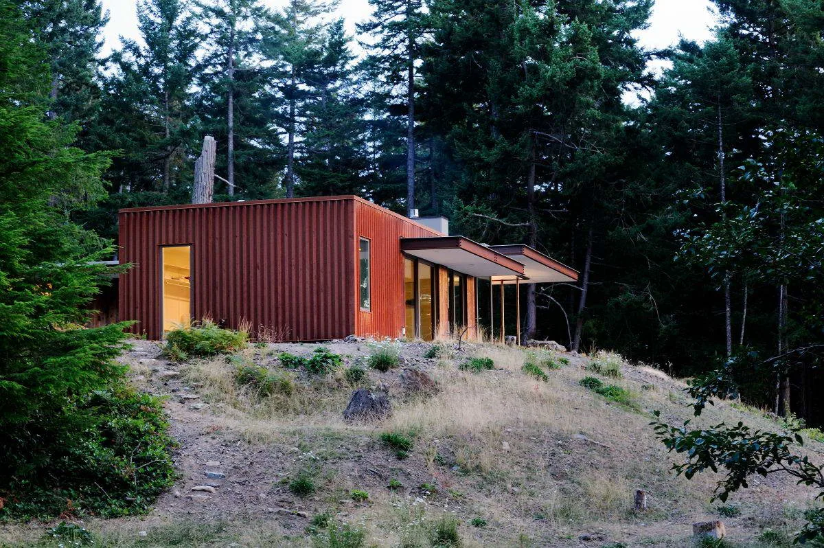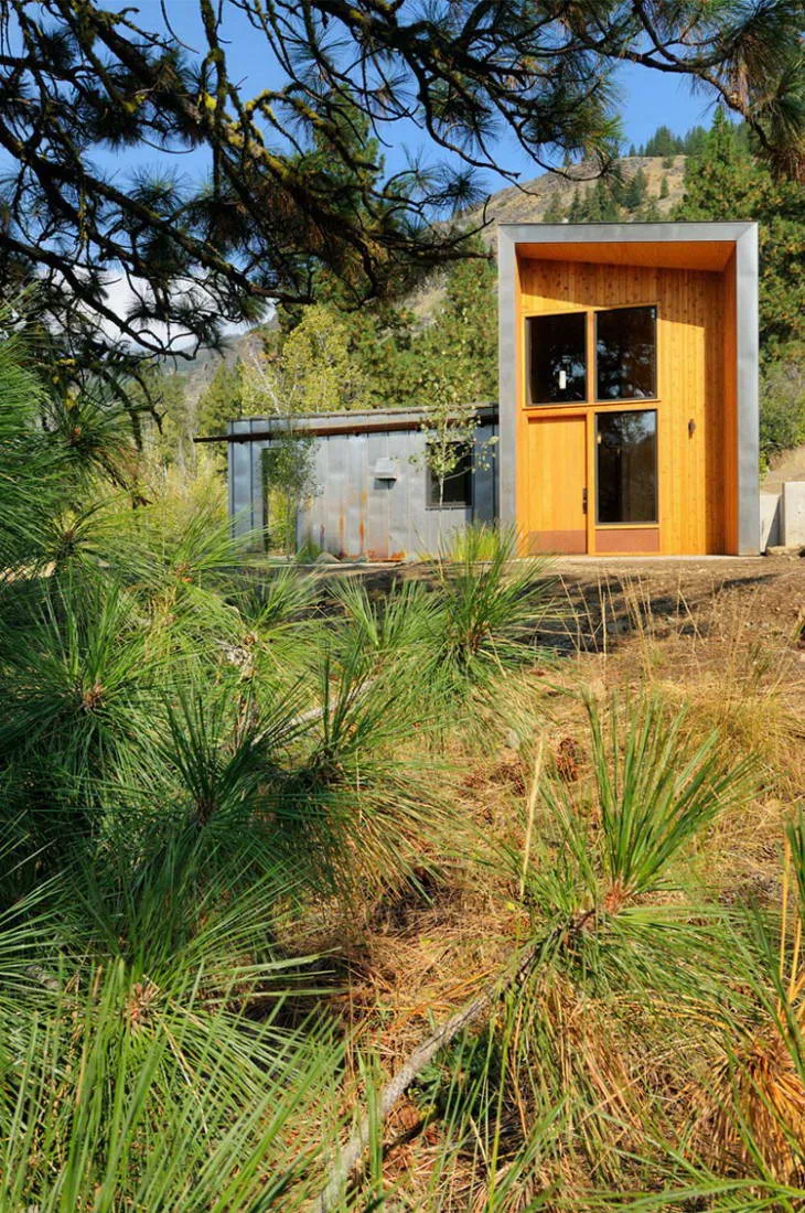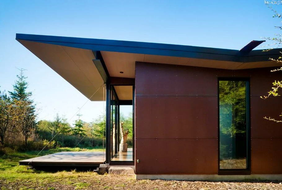 Дом, главными фасадными материалами которого стали старое дерево от разобранного сарая, ржавая сталь и стекло, аккуратно примостился на вершине холма, у самого склона, буквально слившись с природой, вывернувшись наружу и запустив её в себя.