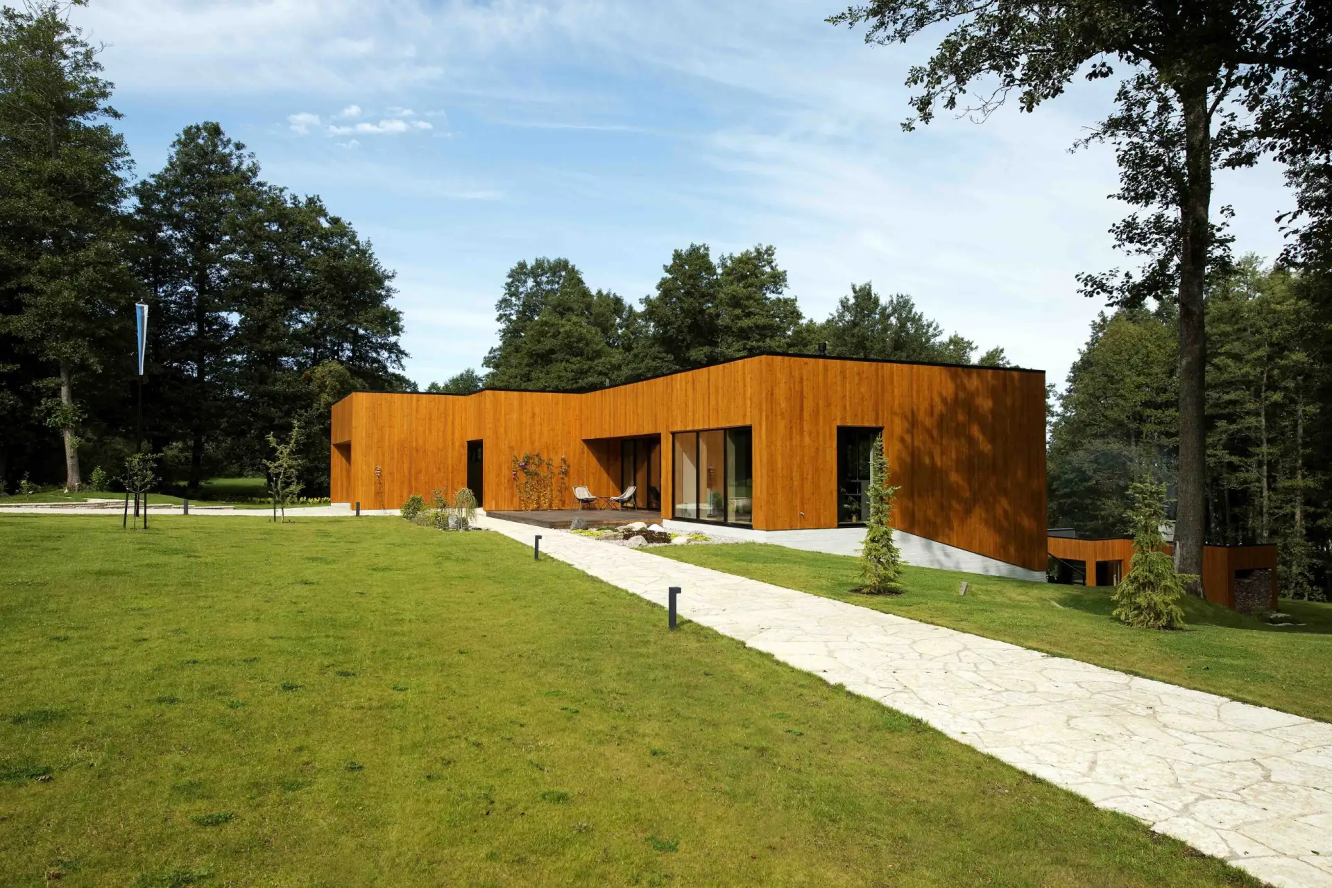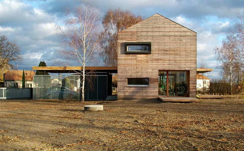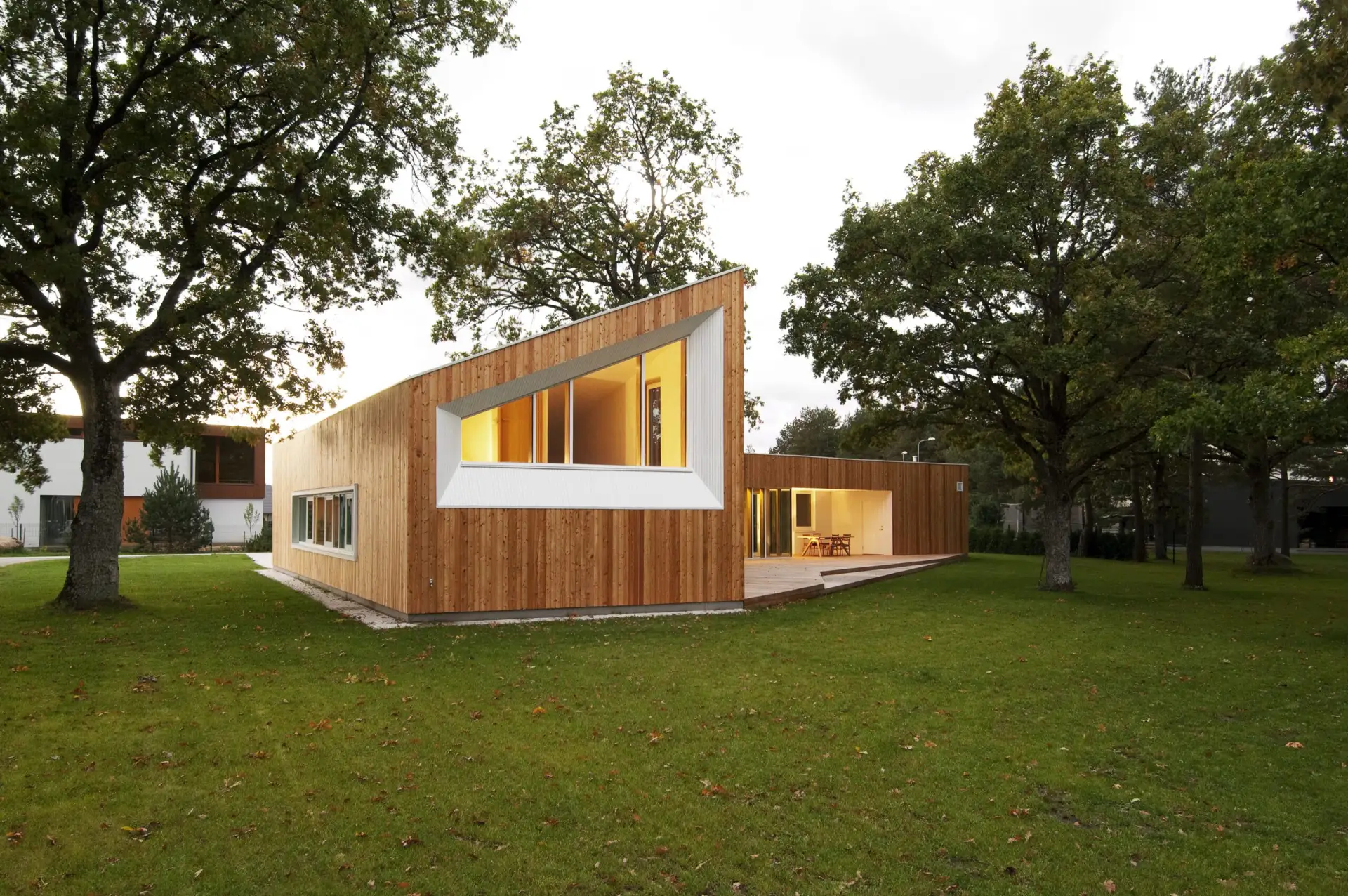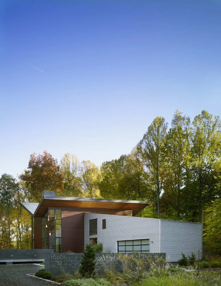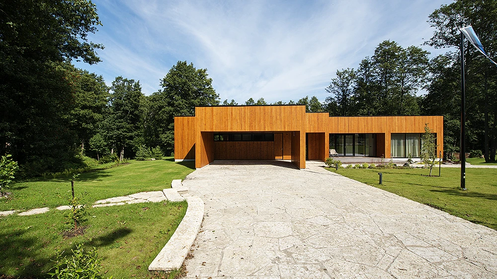 Этот небольшой дом расположился в пригородной лесистой роще. Выгодное расположение определяется удаленностью от дороги и наличием леса, на который выходят окна дома. Для придания атмосферы приватности и уюта входная группа отделена от дороги невысокими стенами. Таким образом, вся архитектурная композиция, включая стены, гараж и сам дом, отделяет собой лес от дороги.