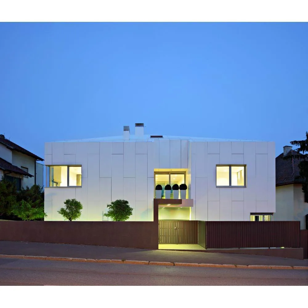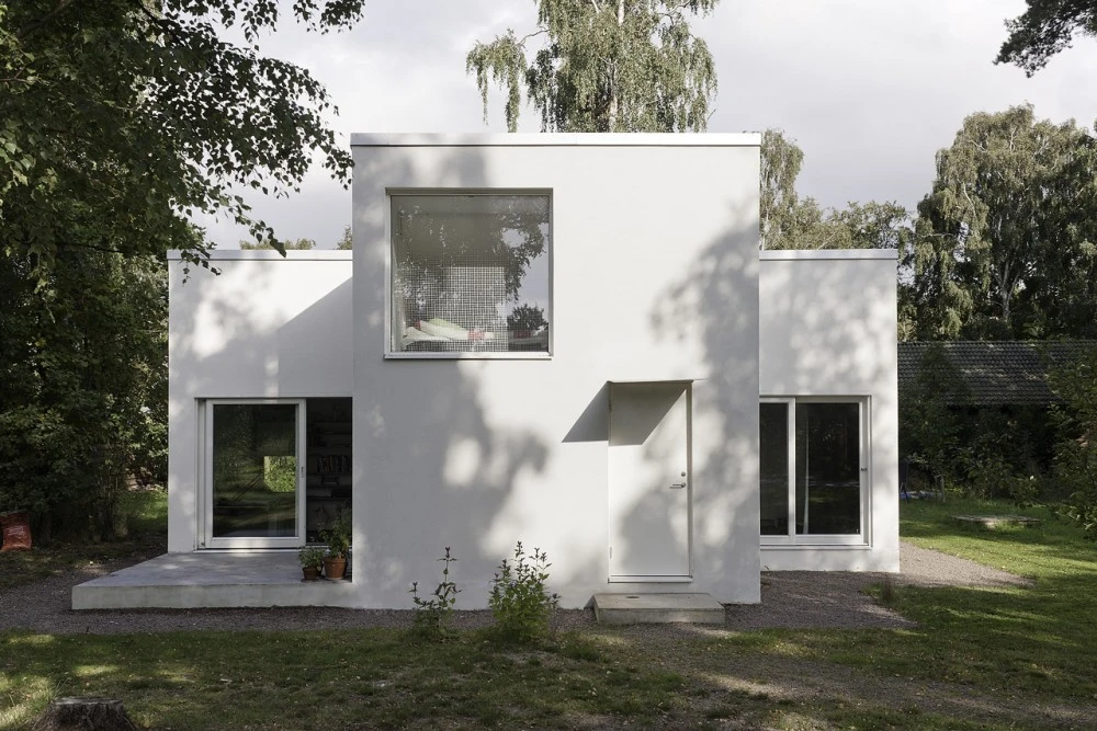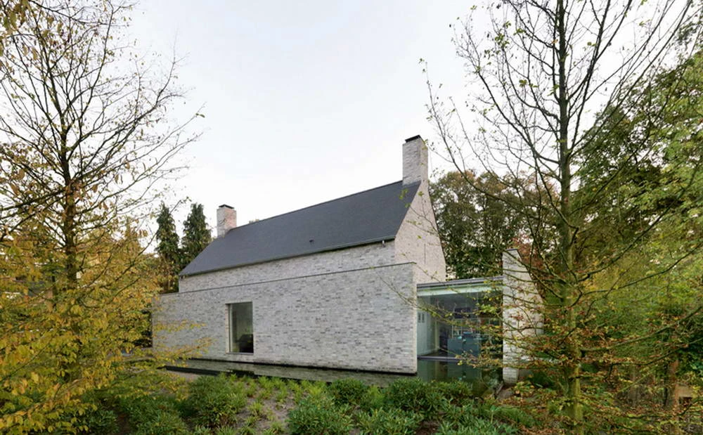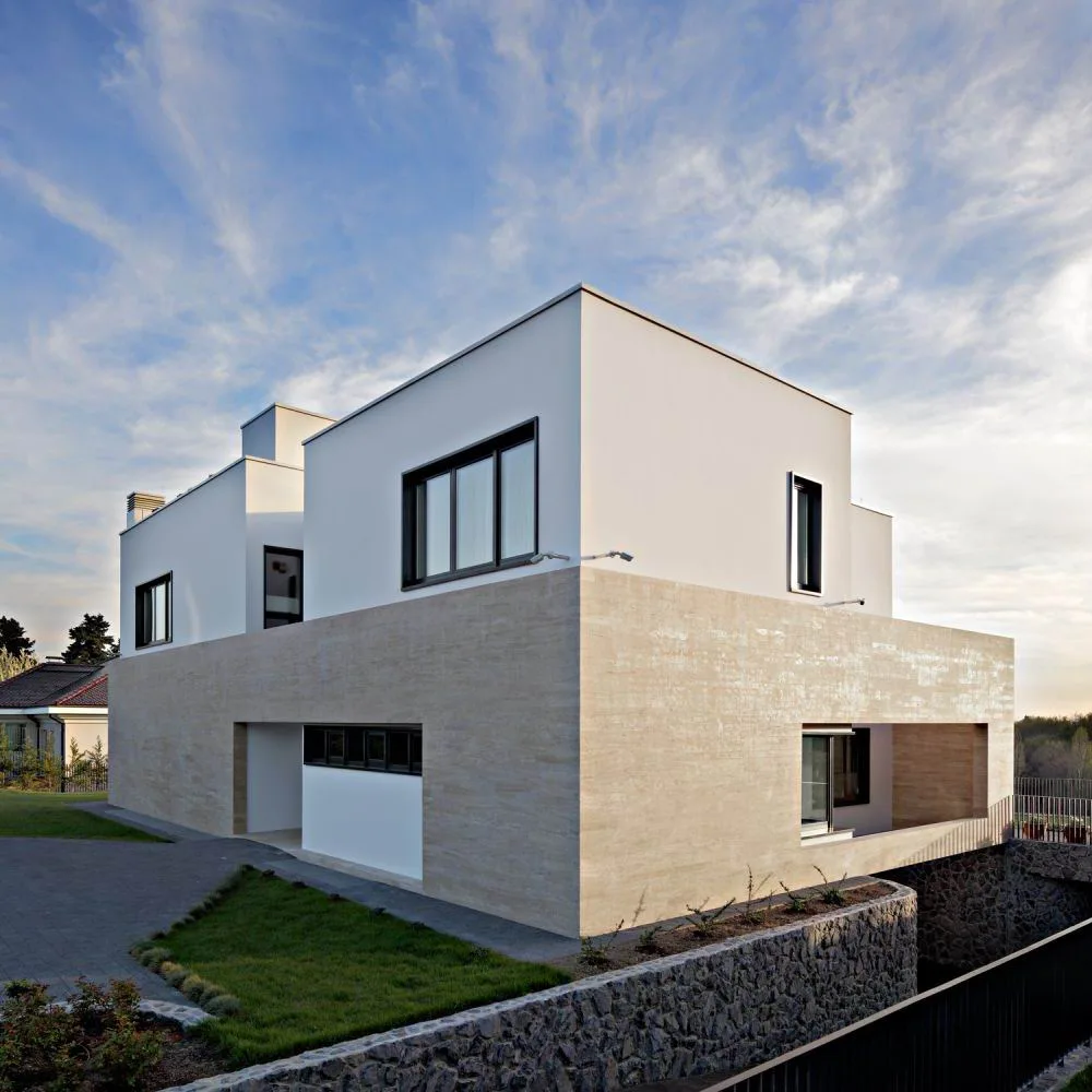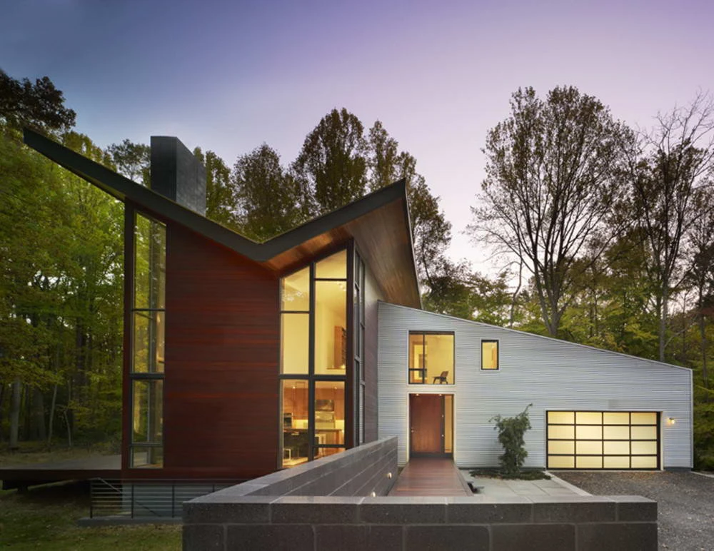 Этот небольшой дом расположился в пригородной лесистой роще. Выгодное расположение определяется удаленностью от дороги и наличием леса, на который выходят окна дома. Для придания атмосферы приватности и уюта входная группа отделена от дороги невысокими стенами. Таким образом, вся архитектурная композиция, включая стены, гараж и сам дом, отделяет собой лес от дороги.