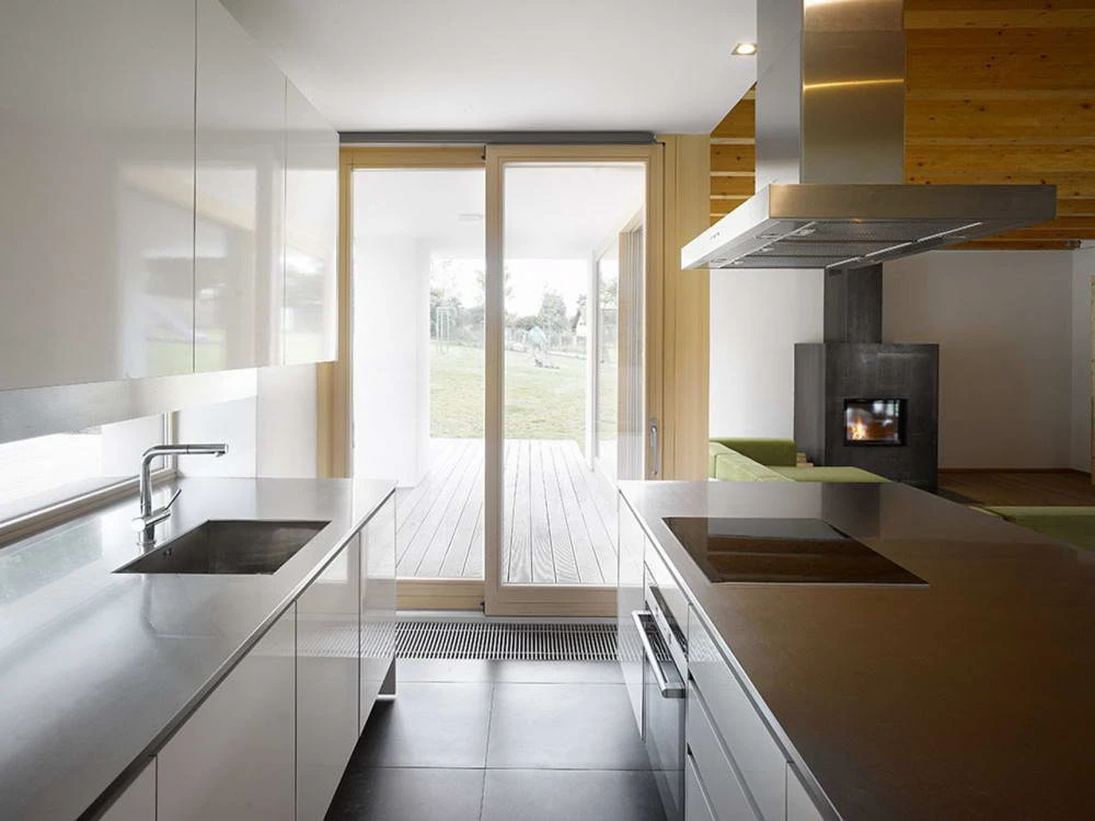 Атриум, который скрыт с трех сторон, место для многих событий – гостиная с открытой кухней и грилем, на который с помощью своих стеклянных скал открываются бассейн, винный погреб и гостевая.