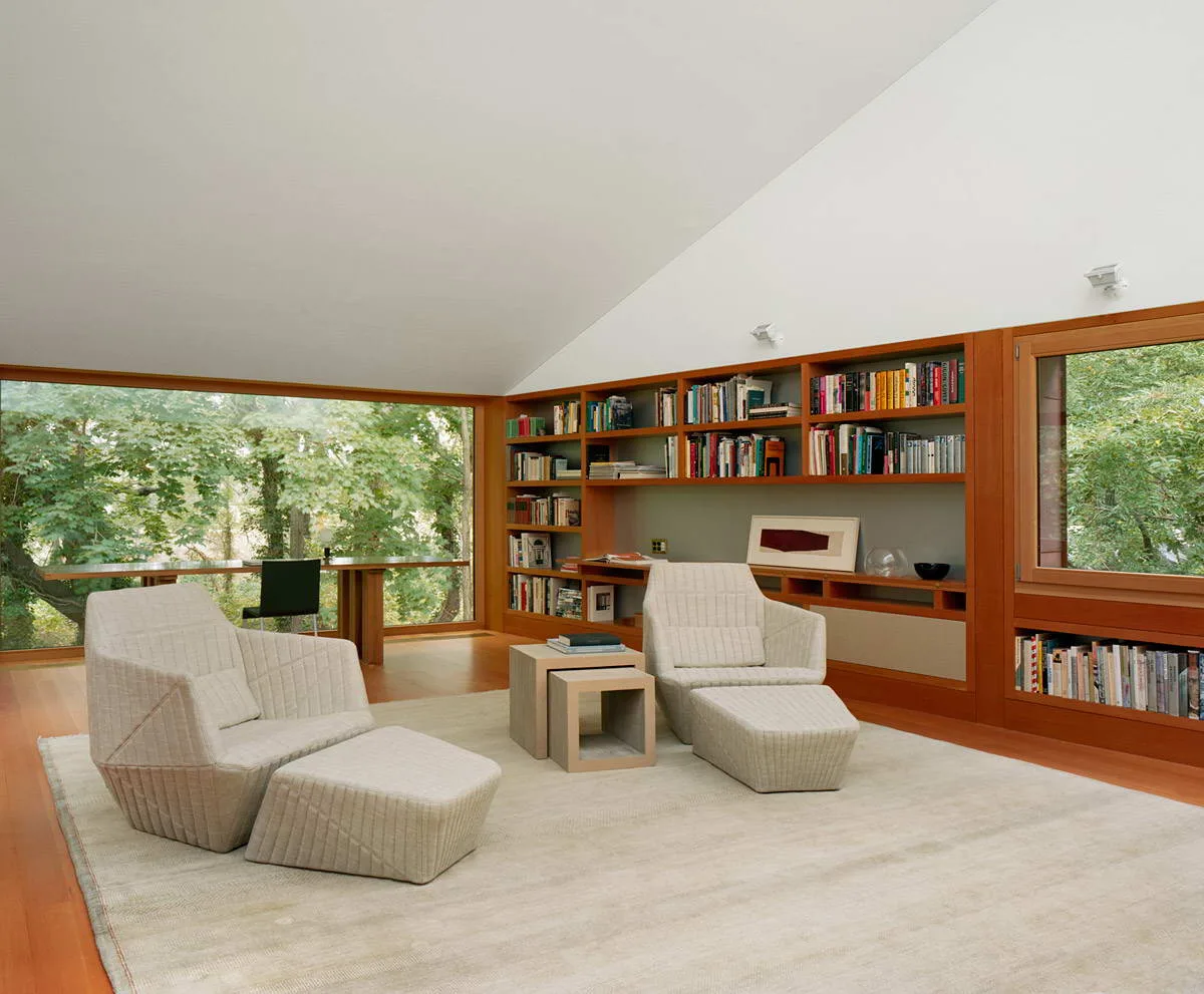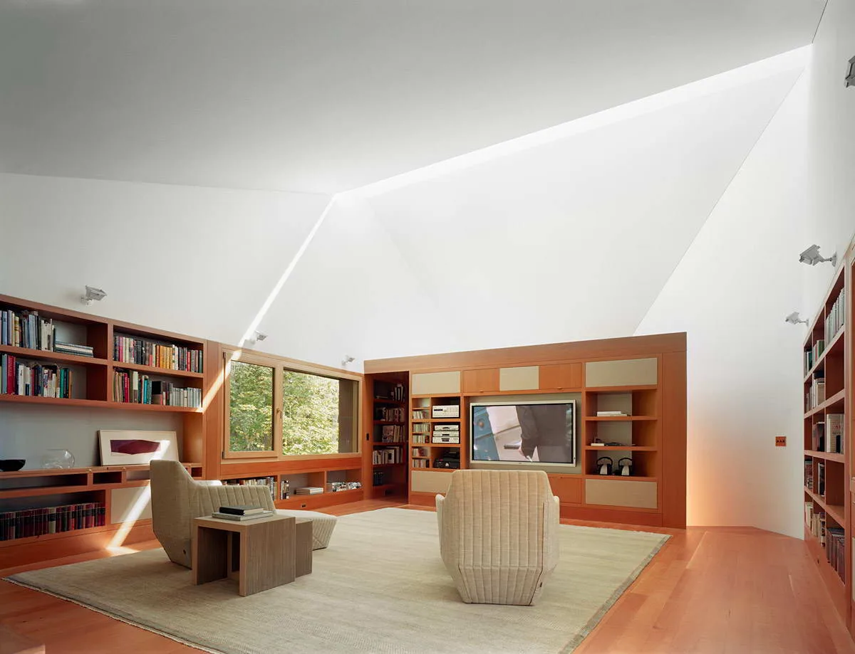 Вторая половина здания, отведенная для кабинета и зоны развлечений имеет трапециевидную форму. Большая часть его второго этажа является консольной, что не только значительно смягчило вторжение здания в окружающий его пейзаж, но и позволило разместить закрытый внутренний дворик на уровне грунта.