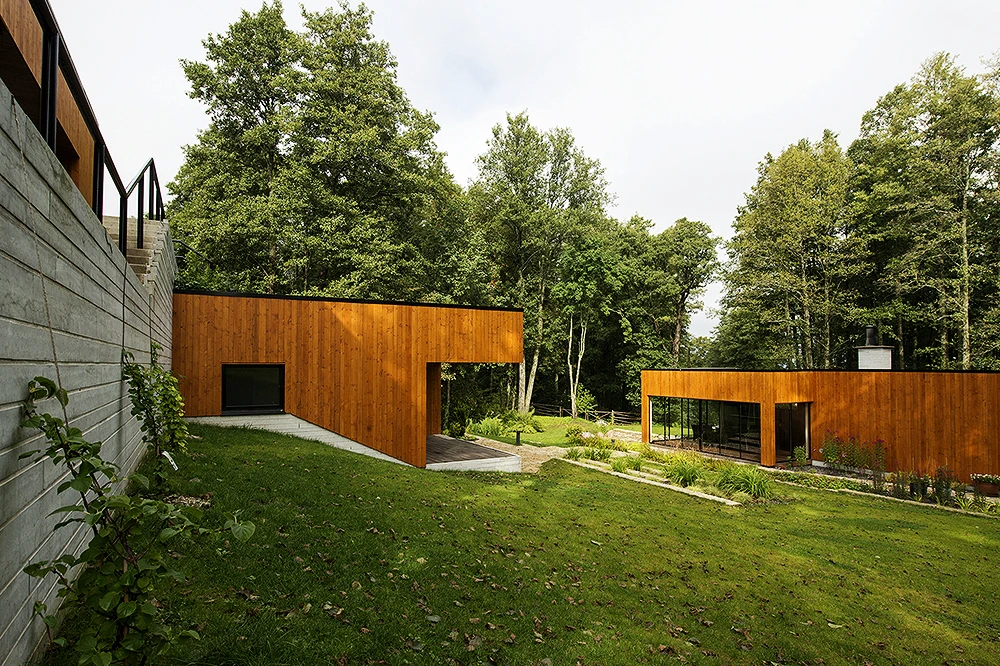 Дом представляет собой композицию из трех объемов, отличающихся друг от друга своими уникальными формами крыш, которые, наряду с выразительным деревянным фасадом, визуально придают дому основательность и надежность.