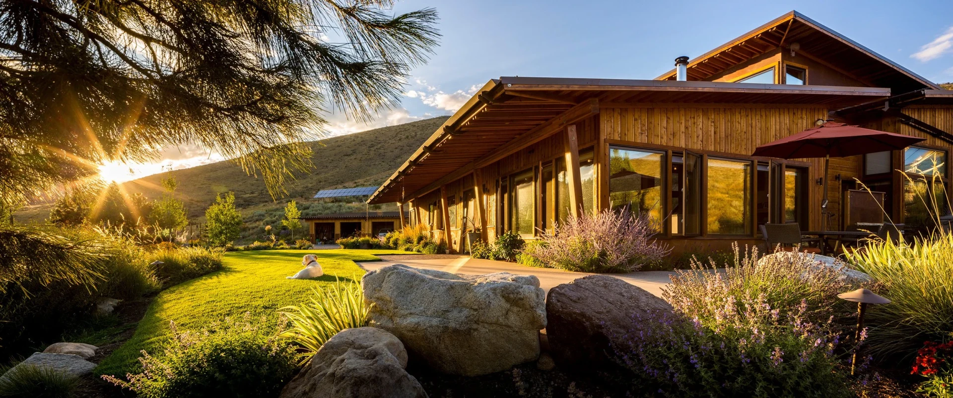 Большие вылеты крыши визуально придают дому ощущение прочности и защищенности и служат навесом для террасы, оптически продлевая и гармонично объединяя дом с окружающим ландшафтом.