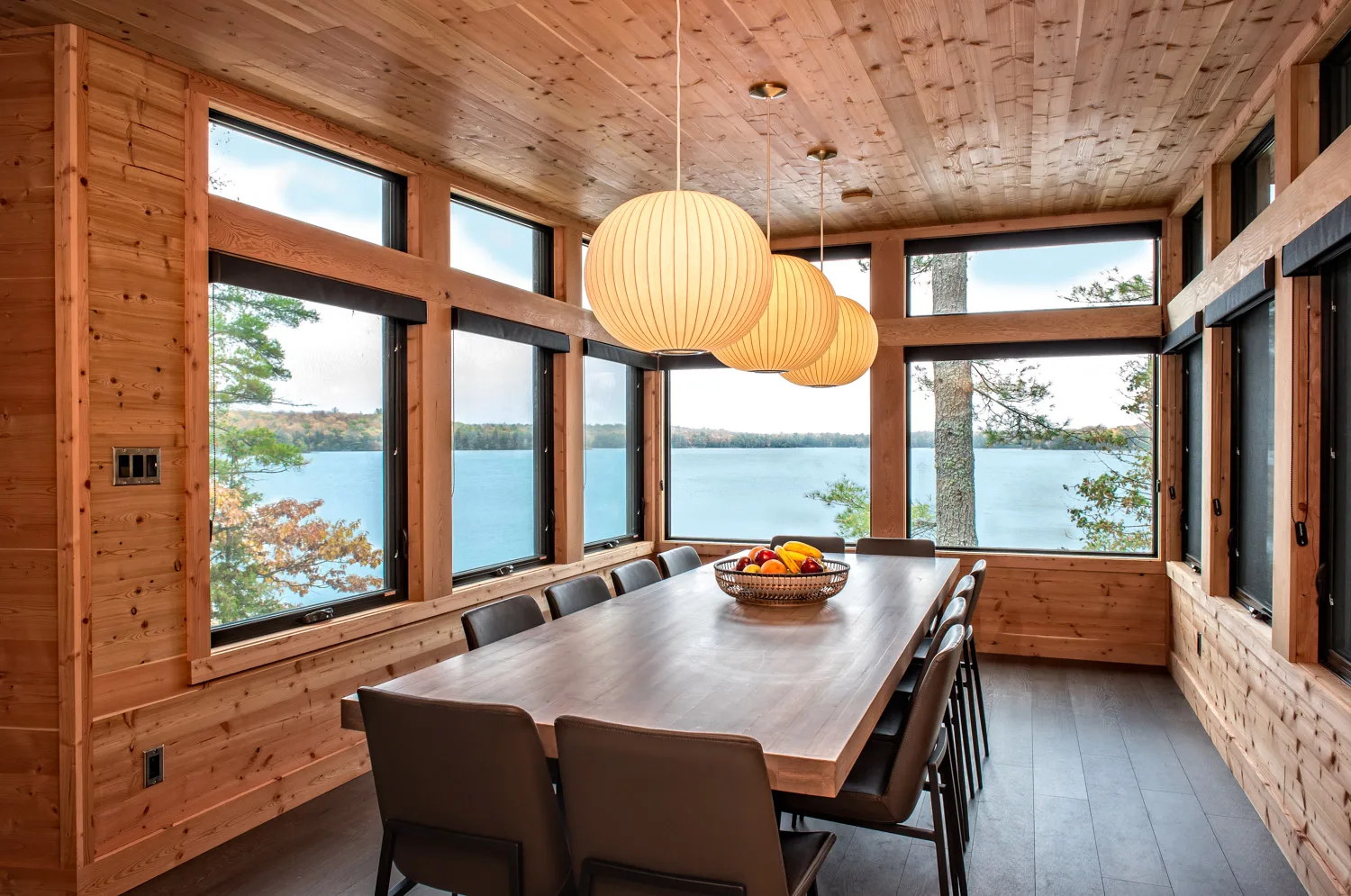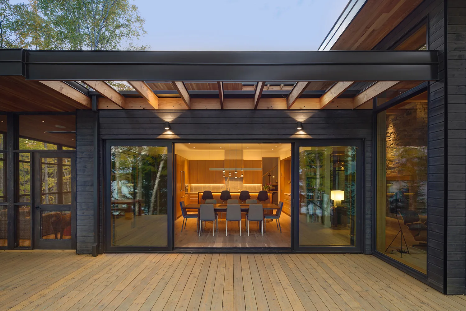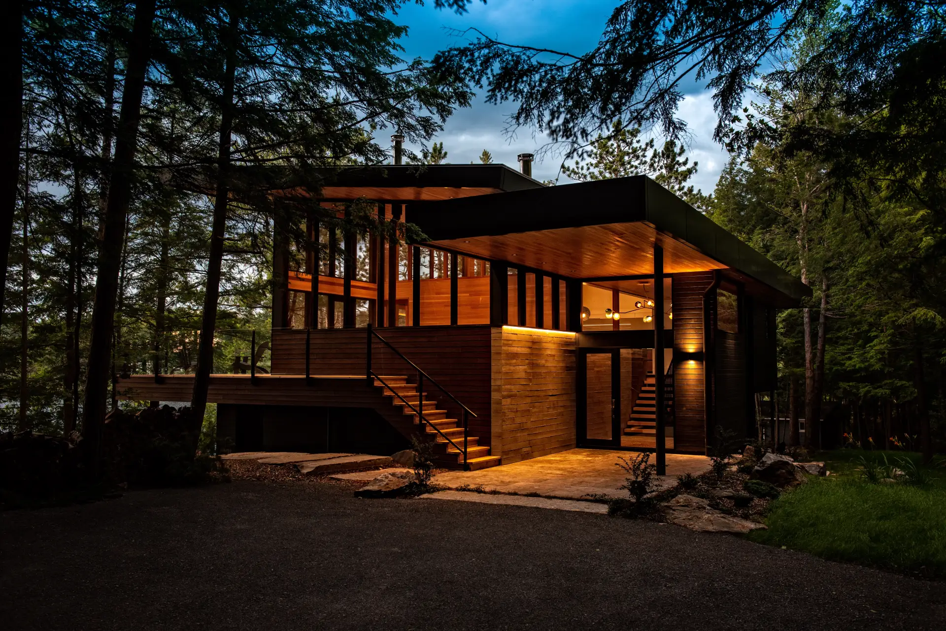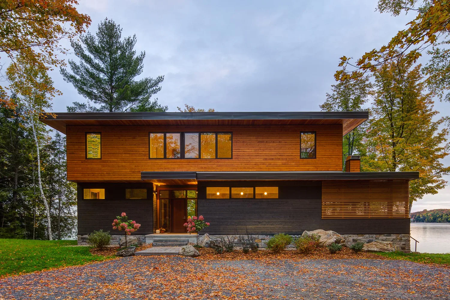 Этот дом расположен на берегу озера. Дом спроектирован так, чтобы гармонично вписываться в окружающую среду и обеспечивать максимальный обзор озера и леса.