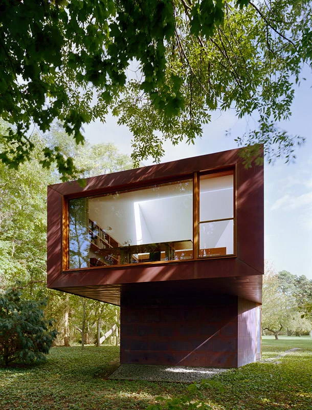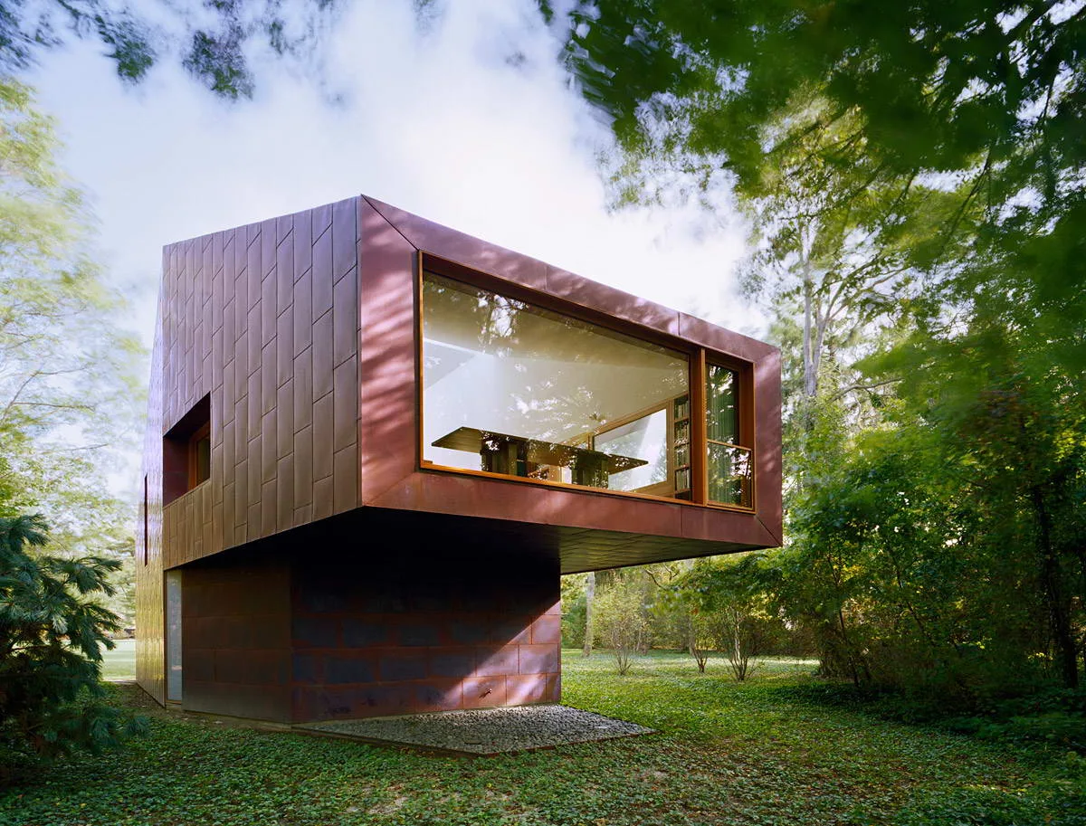 Лёгкий, полностью остеклённый первый этаж закреплён мощным медным объёмом второго этажа и кровли.