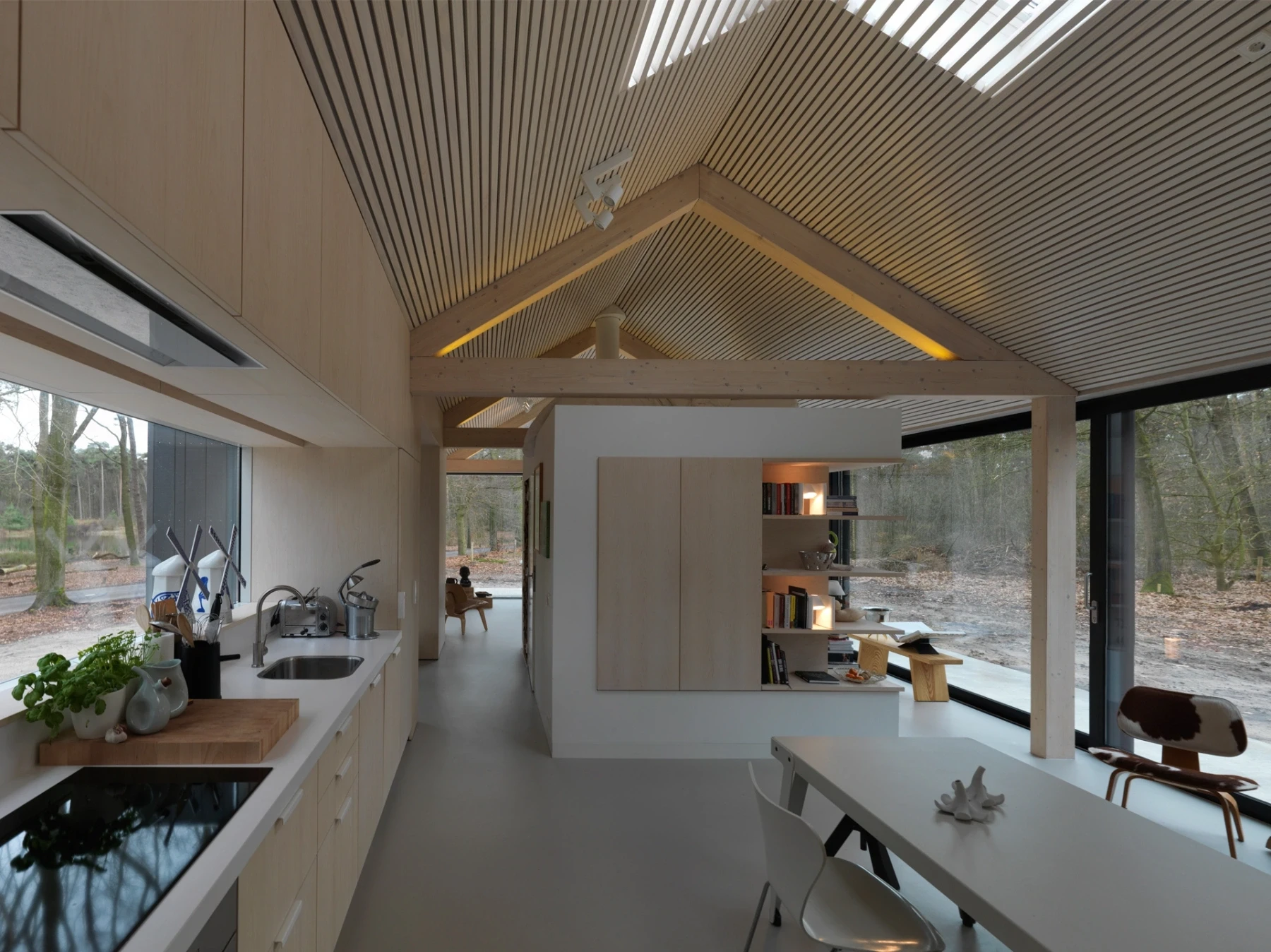 В объёме с классической двускатной формой размещены кухня, столовая, гостиная и студия (библиотека) на втором этаже. В прямоугольном блоке расположена спальная зона.